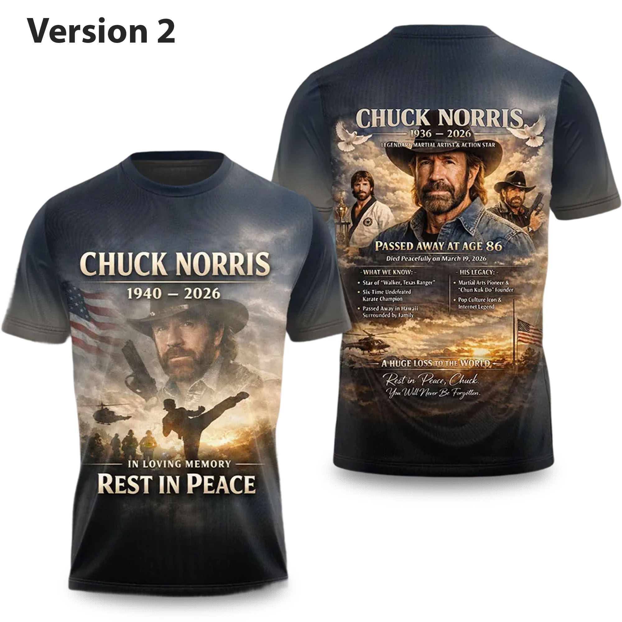 The design draws inspiration from classic memorial posters and cinematic artwork often used to honor legendary figures. It combines themes of strength, remembrance, and respect, reflecting Chuck Norris’s enduring influence in action films and popular culture. The layout reflects a memorial style while remaining relevant to modern streetwear trends.