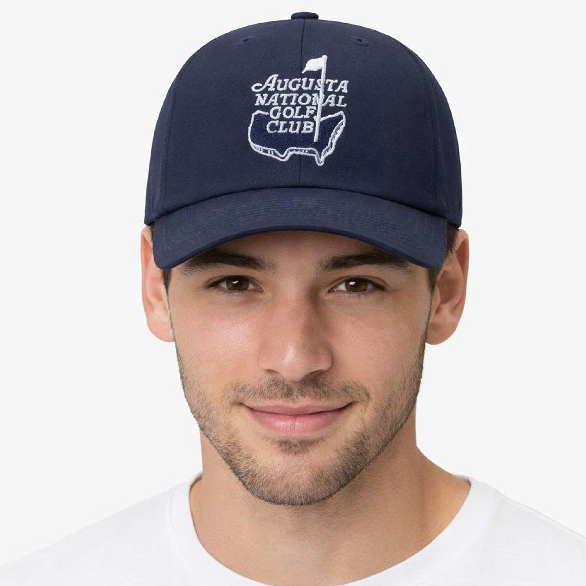 This cap features a deep navy color that delivers a sleek, versatile appearance. The front showcases detailed white embroidery of “Augusta National Golf Club” alongside the iconic map outline and flag symbol, creating a clean and recognizable design. Crafted from high-quality, breathable fabric, the hat offers a structured fit that maintains its shape over time. The curved brim provides sun protection while enhancing the classic silhouette, making it perfect for both outdoor wear and everyday styling.