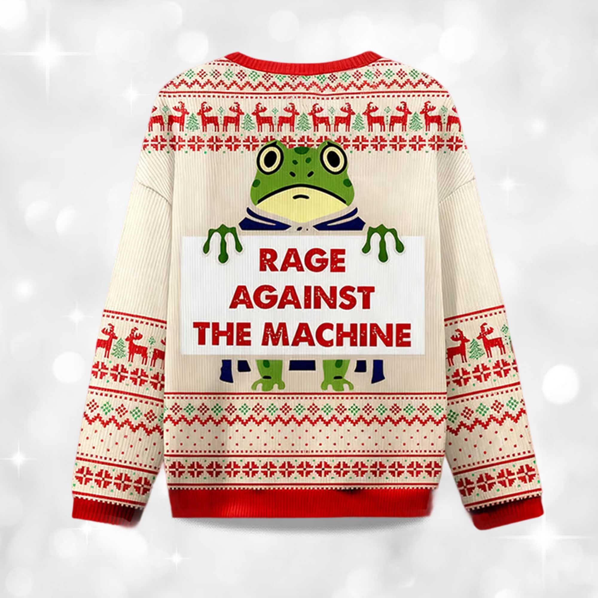 Here’s the perfect choice for a festive look that’s anything but plain: the Rage Against The Machine Ugly Christmas Sweater. The frog print pops against a crisp white wool fabric, decorated with red and green reindeer, snowflakes, and motifs. This sweater is both playful and dynamic, perfect for when you want to break away from the familiar Santa Claus image and bring something memorable to the party. Whether you’re hanging out with friends or attending a lively office event, this sweater is sure to get compliments.