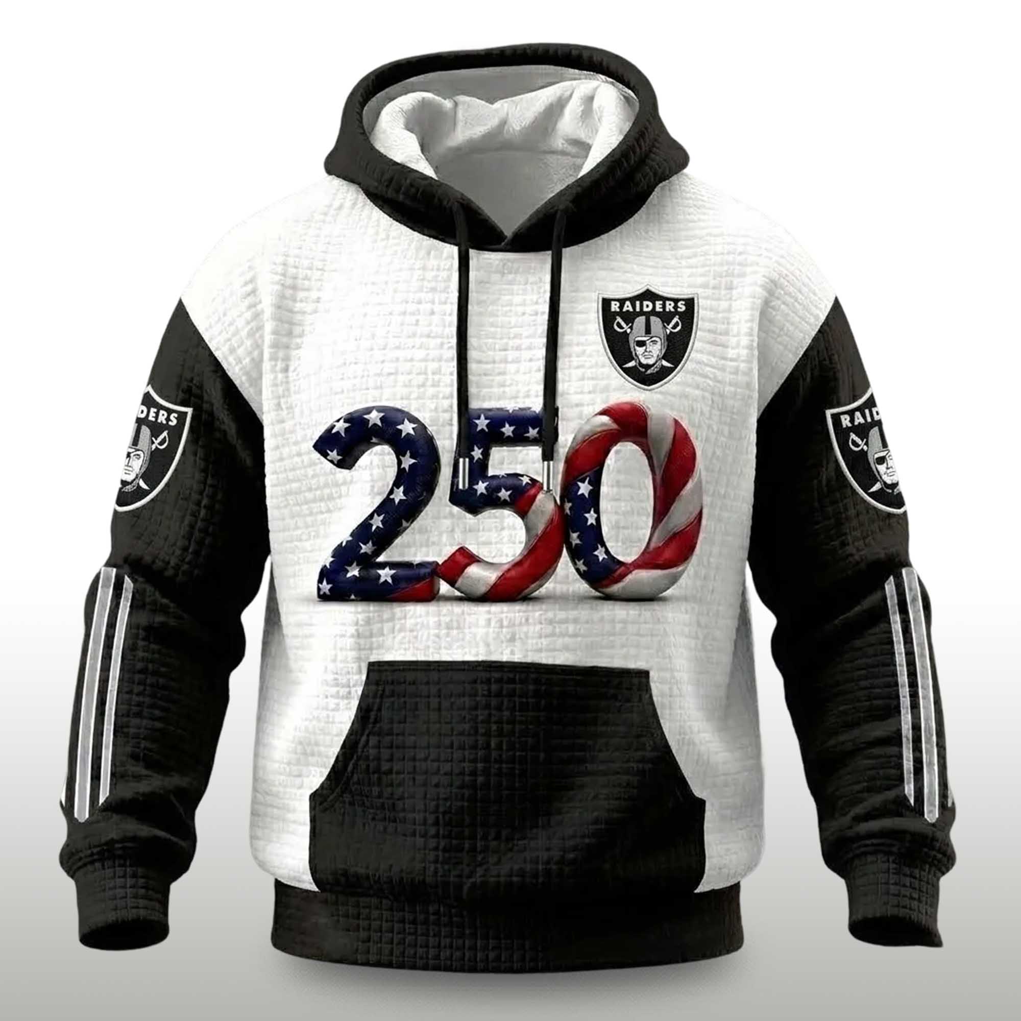 The Raiders America’s 250th Anniversary Waffle Hoodie is designed for fans who want to stand out in a historic year. Inspired by the upcoming 250th anniversary of the founding of the United States in 2026, this hoodie combines the Raiders classic colors with patriotic artwork for a powerful and memorable look. It’s the perfect blend of football pride, everyday comfort, and bold visual style.