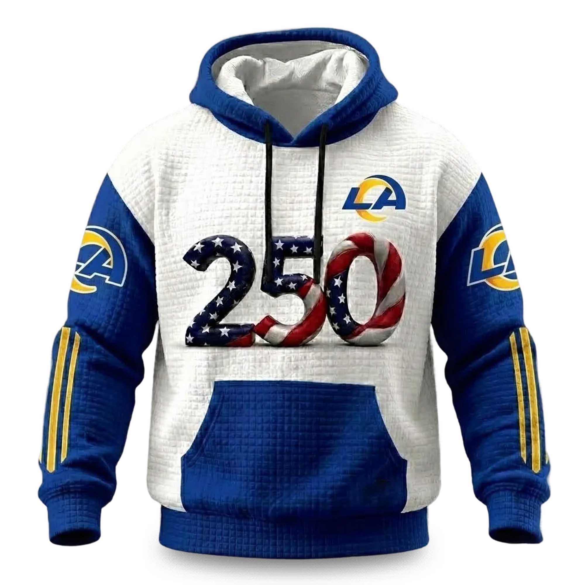 The front features a striking 250 graphic designed with stars and stripes inspired by the American flag, creating a patriotic accent. Bright white panels on the upper combine with the bold Rams blue sleeves, hood, and pocket for a strong visual contrast. The LA logo, inspired by the team, on the chest and sleeves creates a clear identity that fans can instantly recognize. Yellow stripes along the sleeves add energy to the look. The mesh texture adds depth and a premium feel, making this hoodie stand out from the norm.