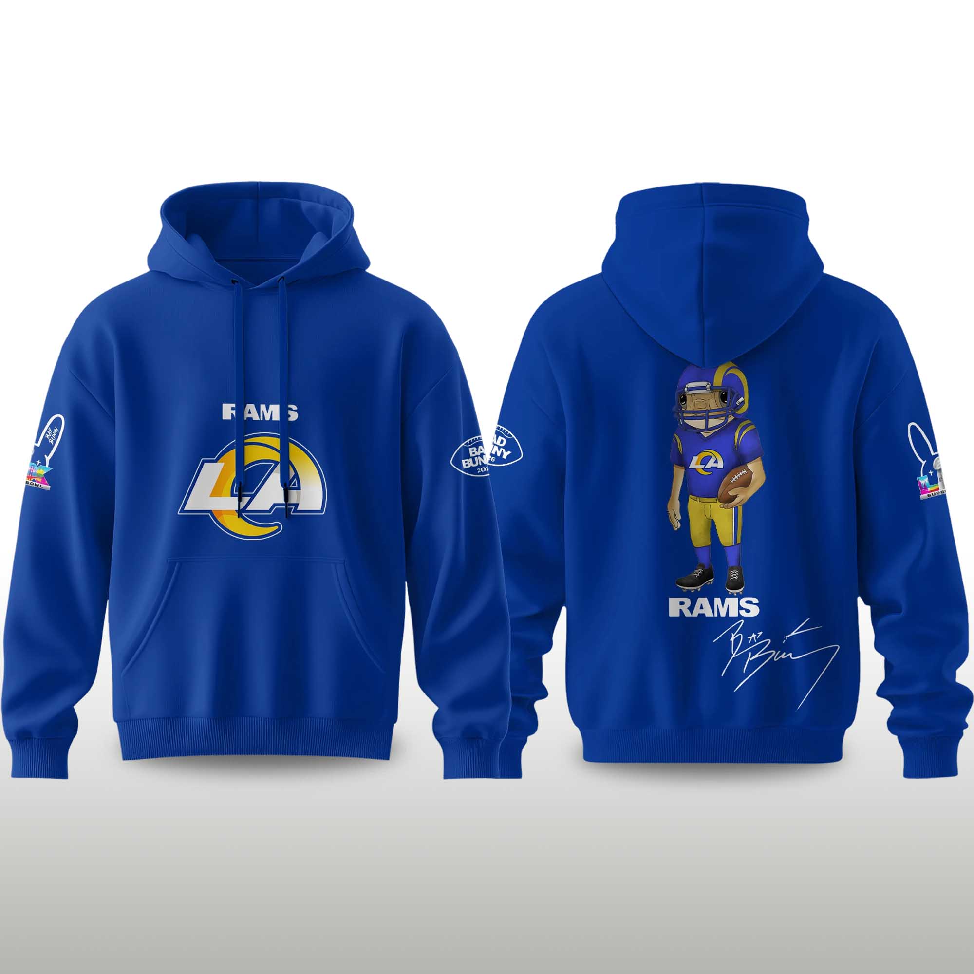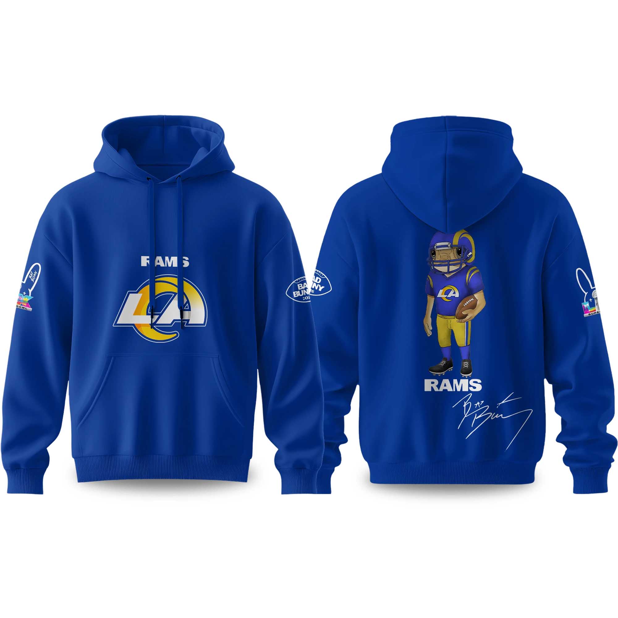 The Rams Bad Bunny 2026 Super Bowl Concho Football Hoodie offers comfort and personality in a standout product. The front highlights Rams identity with bold graphics, while the back features playful illustrations, adding personality and a modern style. The deep blue color reflects the classic Rams colors, making this hoodie ideal for chilly soccer nights, Super Bowl parties, or everyday wear during soccer season.