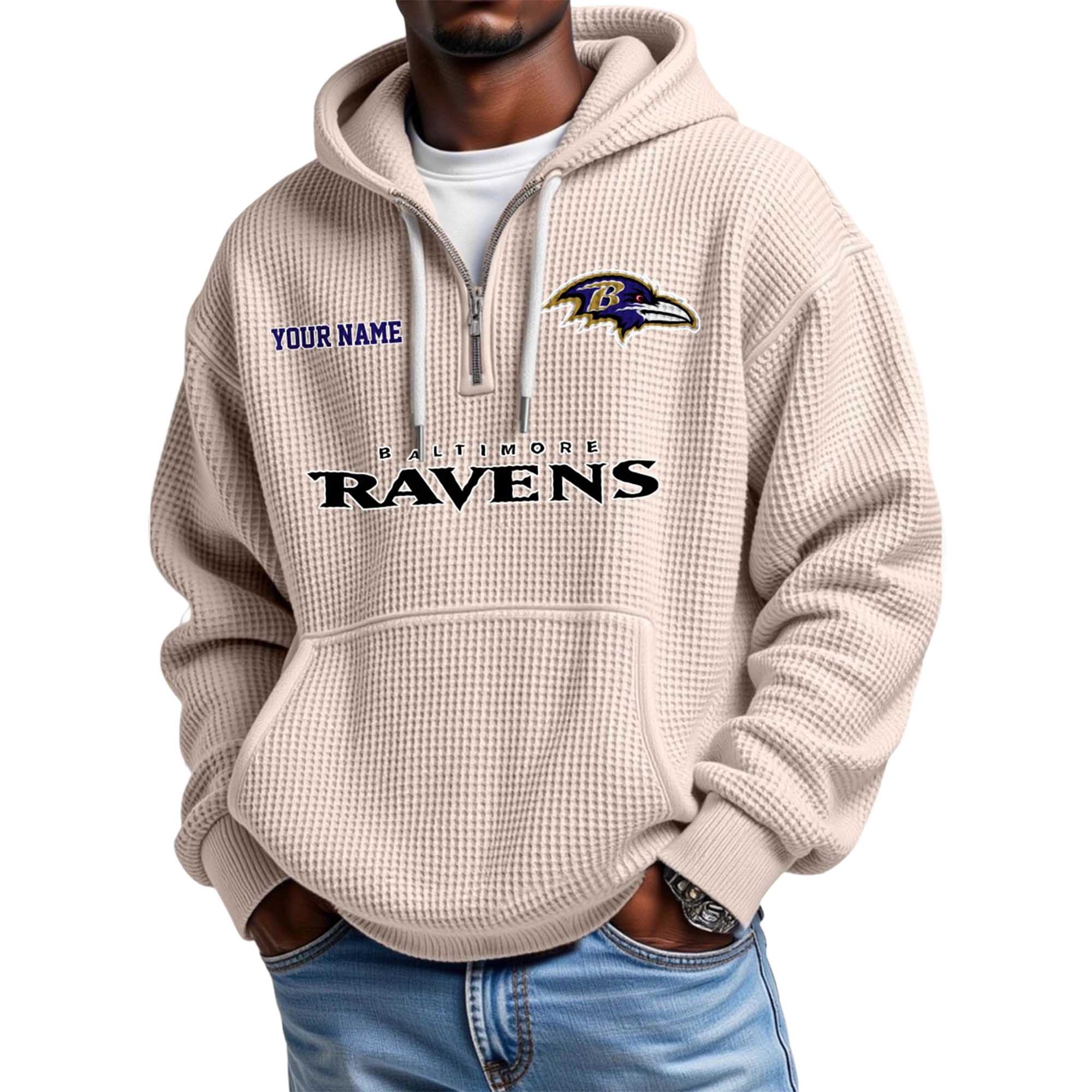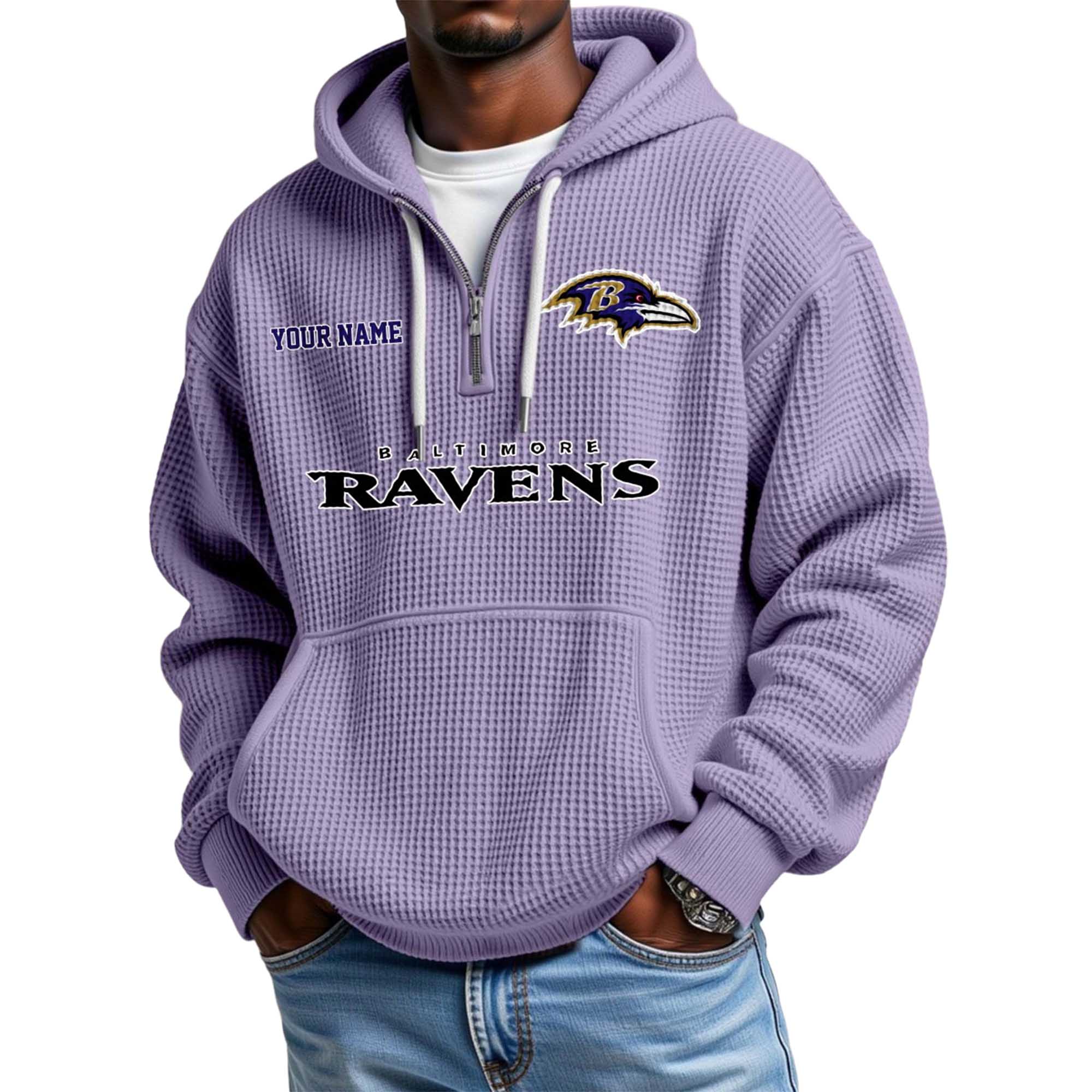 The Ravens Personalized Quarter Zip Waffle Hoodie reflects the growing shift in fan apparel toward personalized and lifestyle-focused designs. Based on the provided image, this hoodie combines Ravens identity with everyday comfort, appealing to fans who want a trendy, easy-to-wear, and meaningful outfit. Custom name detailing is becoming a key trend, allowing fans to express their loyalty in a more personal way.