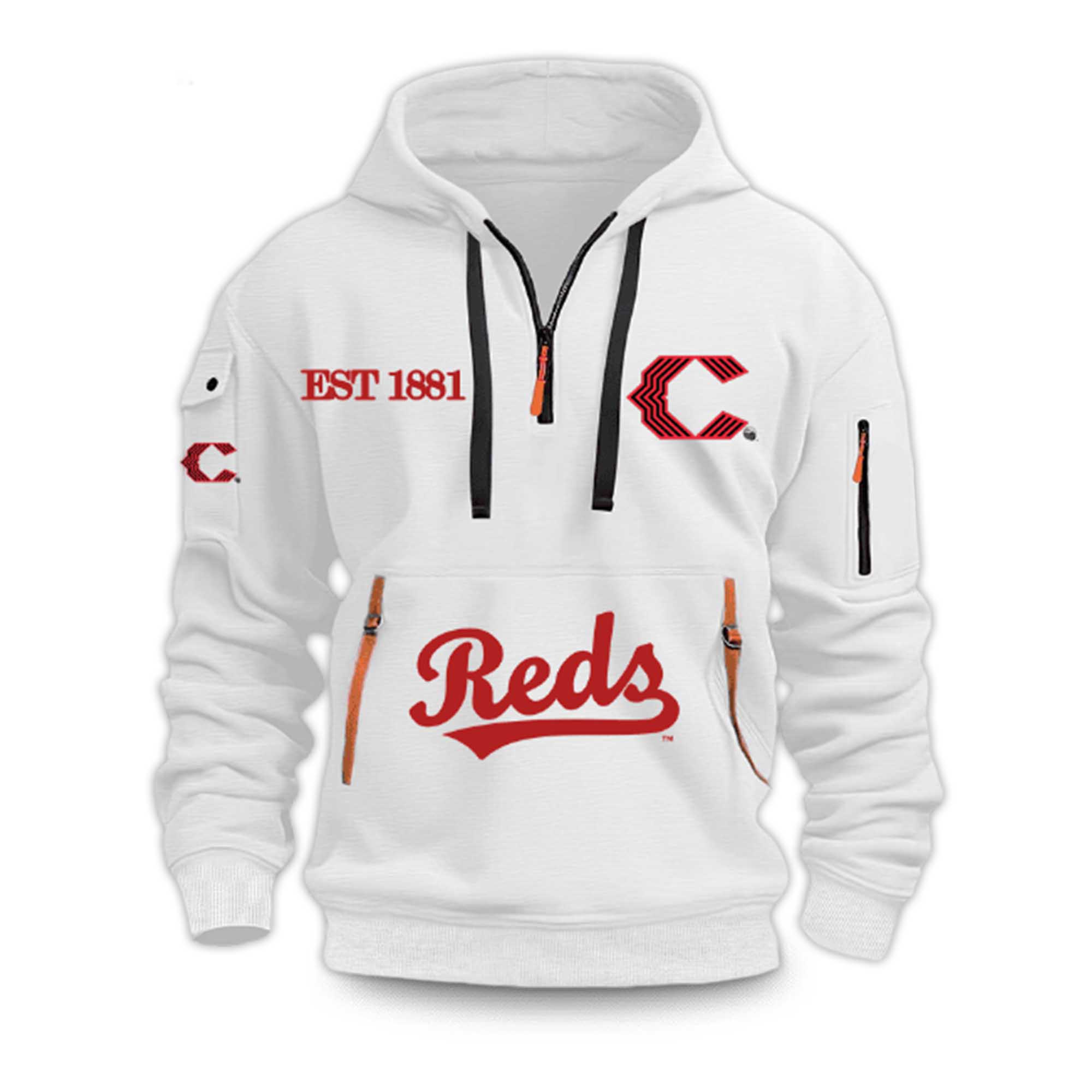 The bright white background creates a sharp contrast with the bold red graphic. On the chest, the retro-inspired C logo stands out with its classic look, while the EST 1881 detail pays homage to the team’s long baseball history. The matching sleeve logo adds balance and style. At the bottom front, the large Reds lettering creates an iconic focal point. Orange zipper details add a modern touch, while the ¼ zip at the collar adds a sporty, modern, and versatile feel.