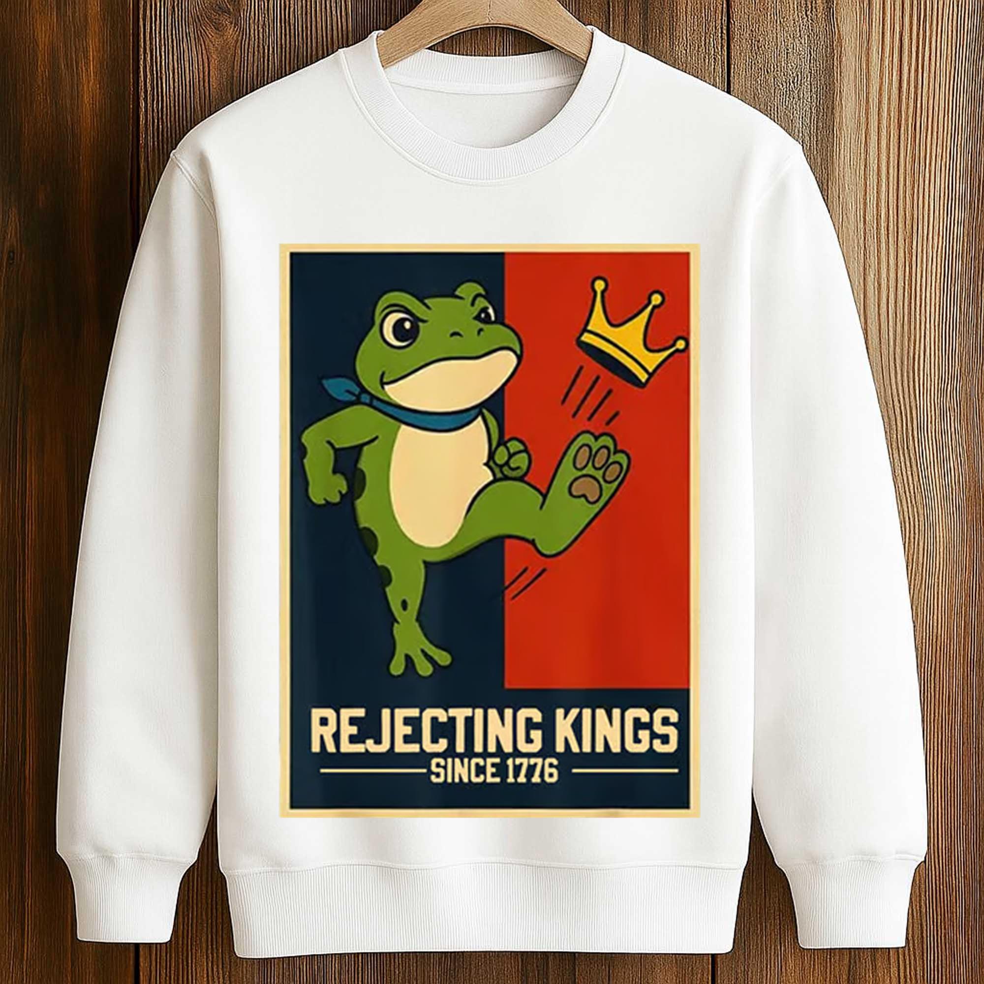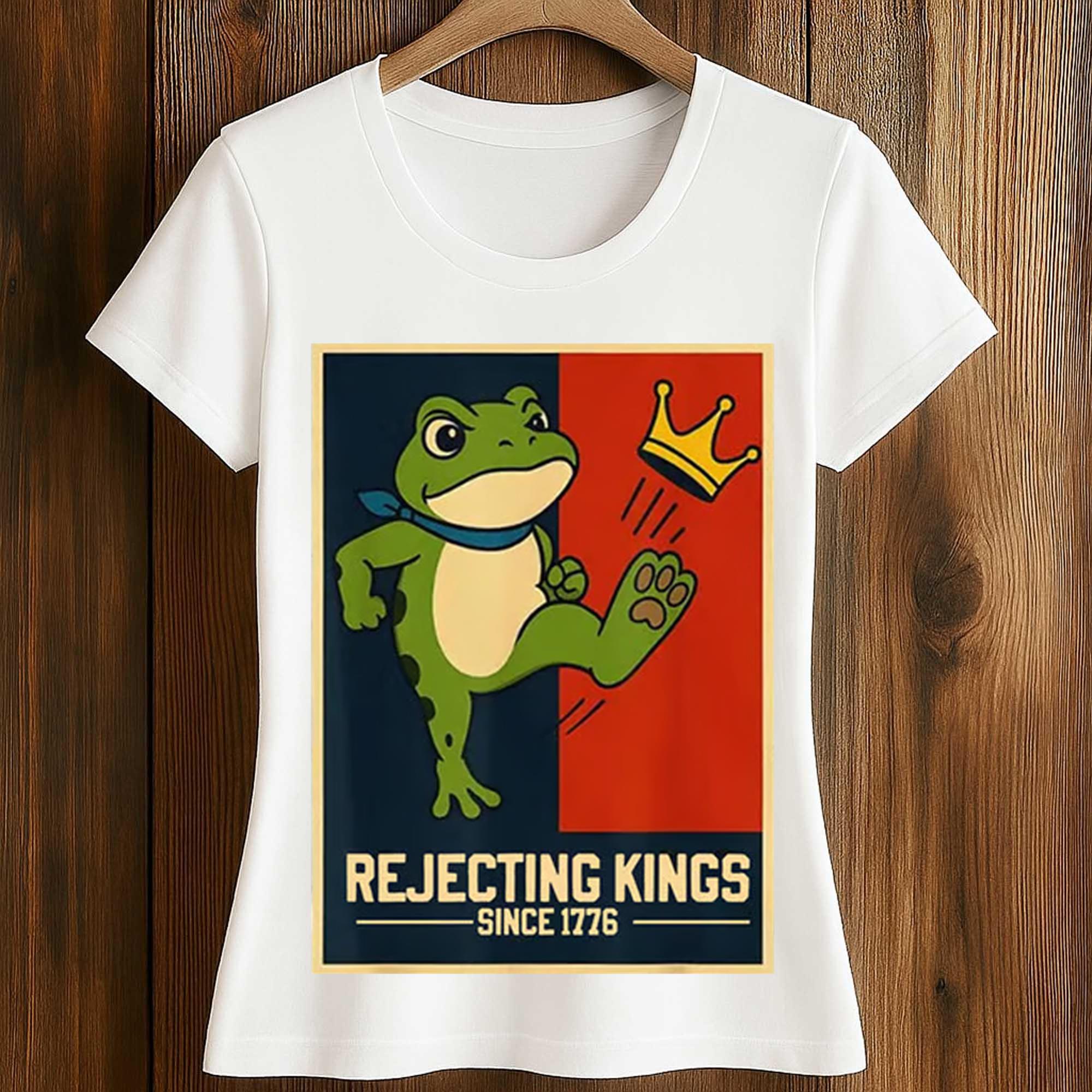 Made from a soft, breathable cotton blend, it ensures all-day comfort while maintaining its vibrant colors wash after wash. The front print features a bold poster layout, split in red and navy, perfectly framing the frog and crown. The slogan “REJECTING KINGS SINCE 1776” completes the artwork with a classic American touch. Lightweight and versatile, it’s ideal for casual wear, rallies, or whenever you want to show off your independent spirit with a smile.