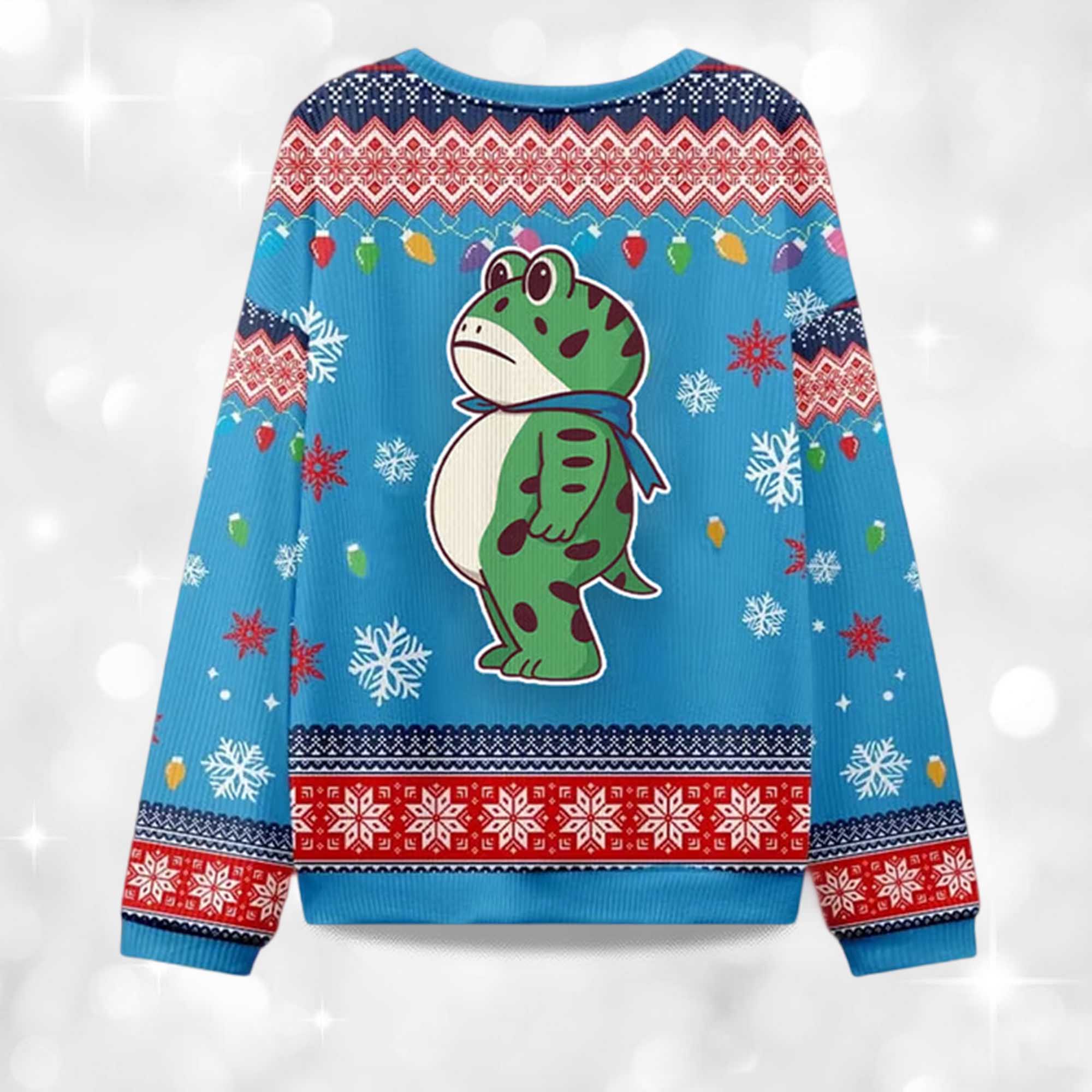 This sweater draws you in with its playful yet meaningful design. A large frog motif stands out against a blue sky, surrounded by bright snowflakes and colorful lights. Below, the bold word “RESIST” emphasizes the theme. The classic holiday knit pattern hem, red-white-green color blocks – gives it an “ugly sweater” feel without being too flashy. The relaxed fit, comfortable weight for layering, and ribbed hem/sleeves help hold the shape. Whether you’re socializing, posing for photos, or relaxing at home, this sweatshirt combines humor, style, and a subtle message.
