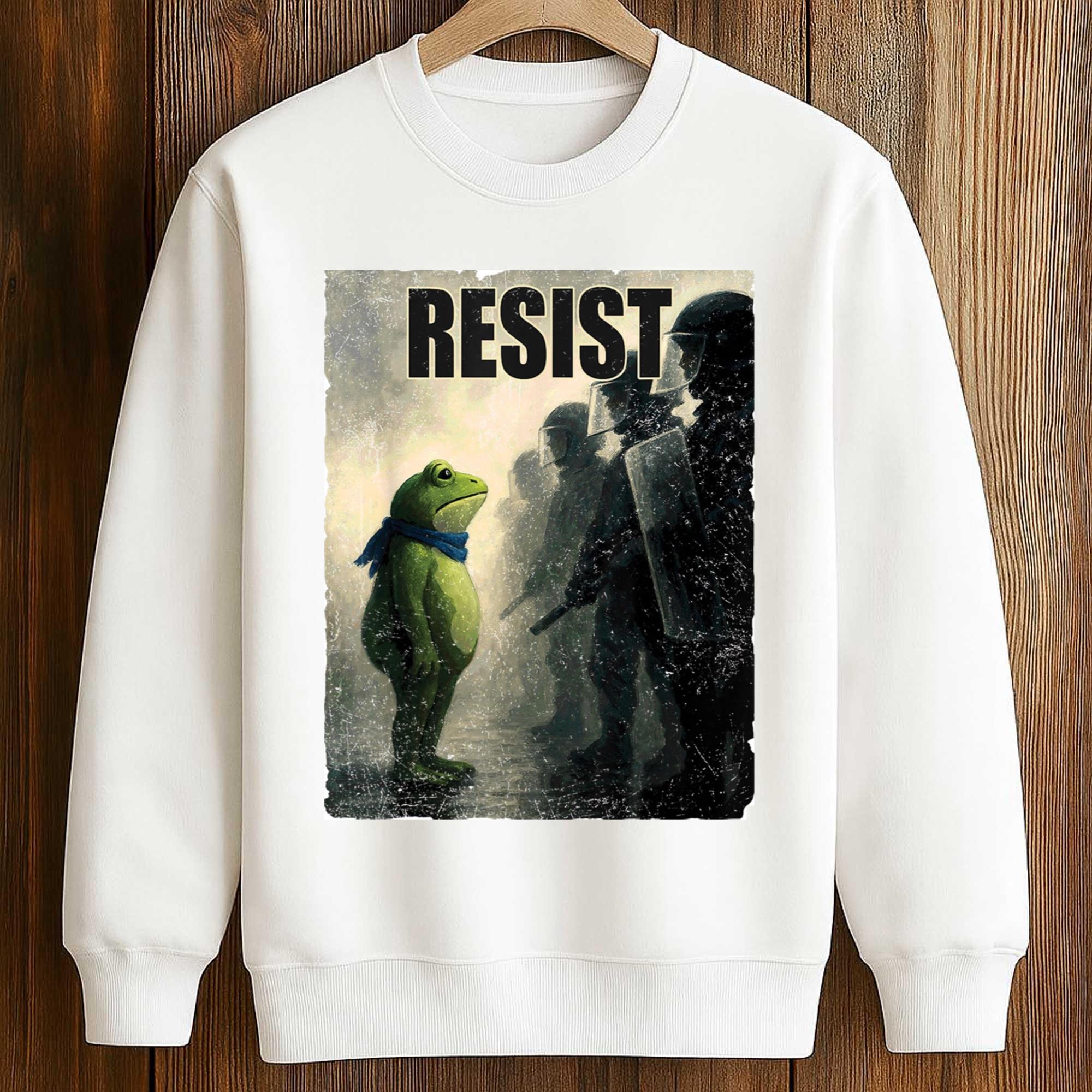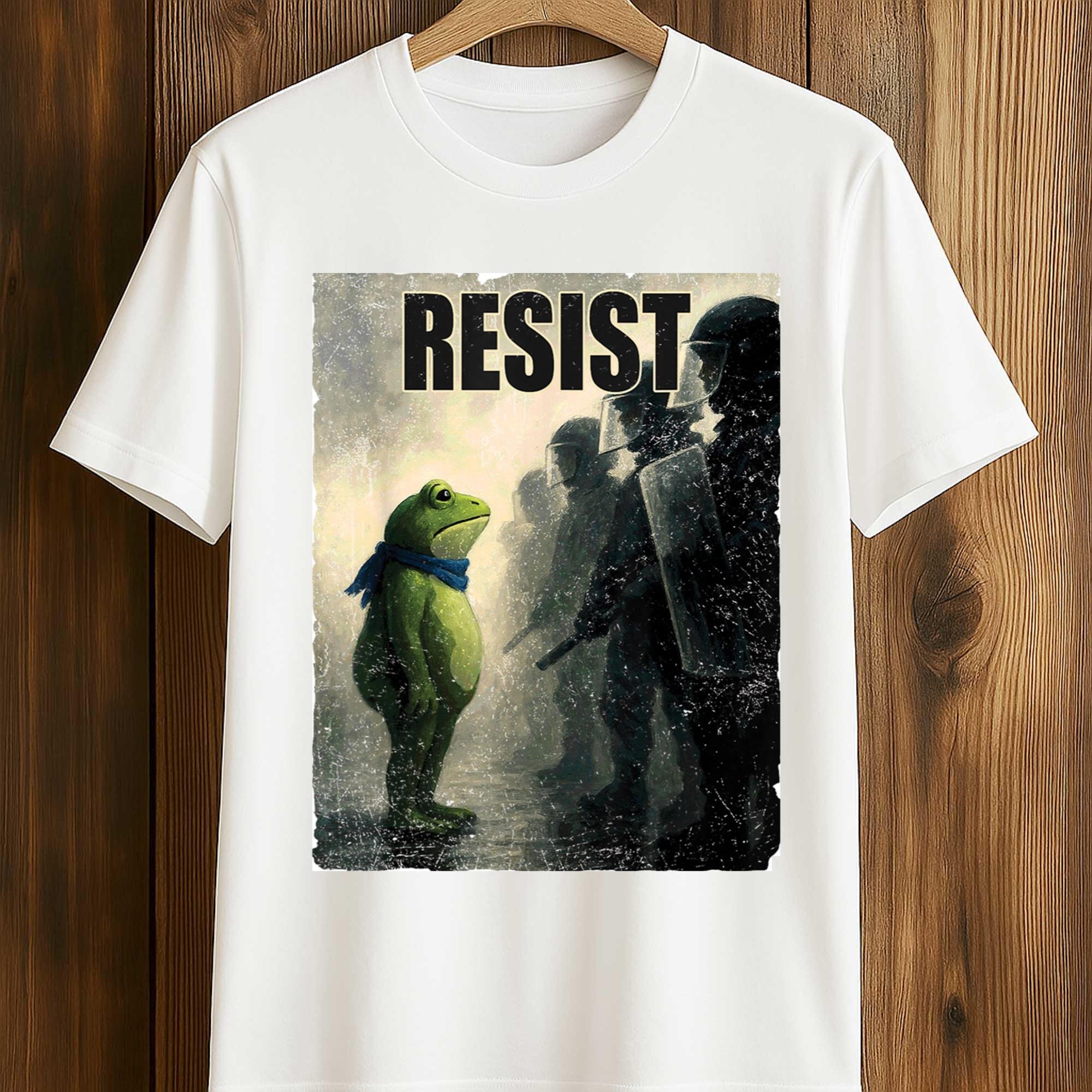 Buy Now Resist Portland Frog Protest 2025 T-Shirt soft cotton printed with eco-inks that will hold up through rain and protest. The front features a vibrant Pepe the Frog wearing a blue scarf, looking down at his dark protest outfit, topped with the word “RESIST” printed in a rough font. A playful frog on the back reads “Portland 2025: Hop Till They Drop.” One size fits all S-3XL, wash cold, tumble dry low. Get in the epic frog spirit!