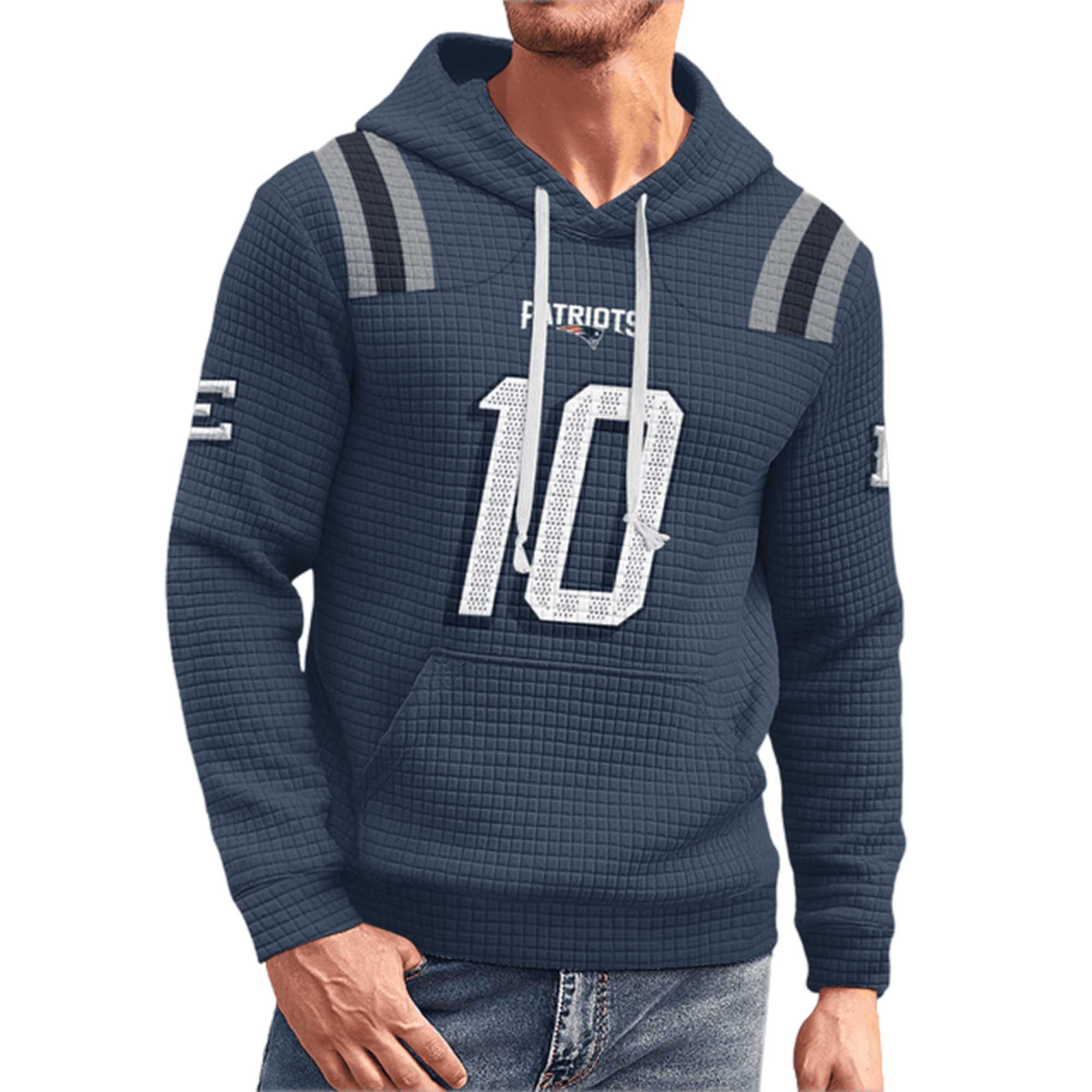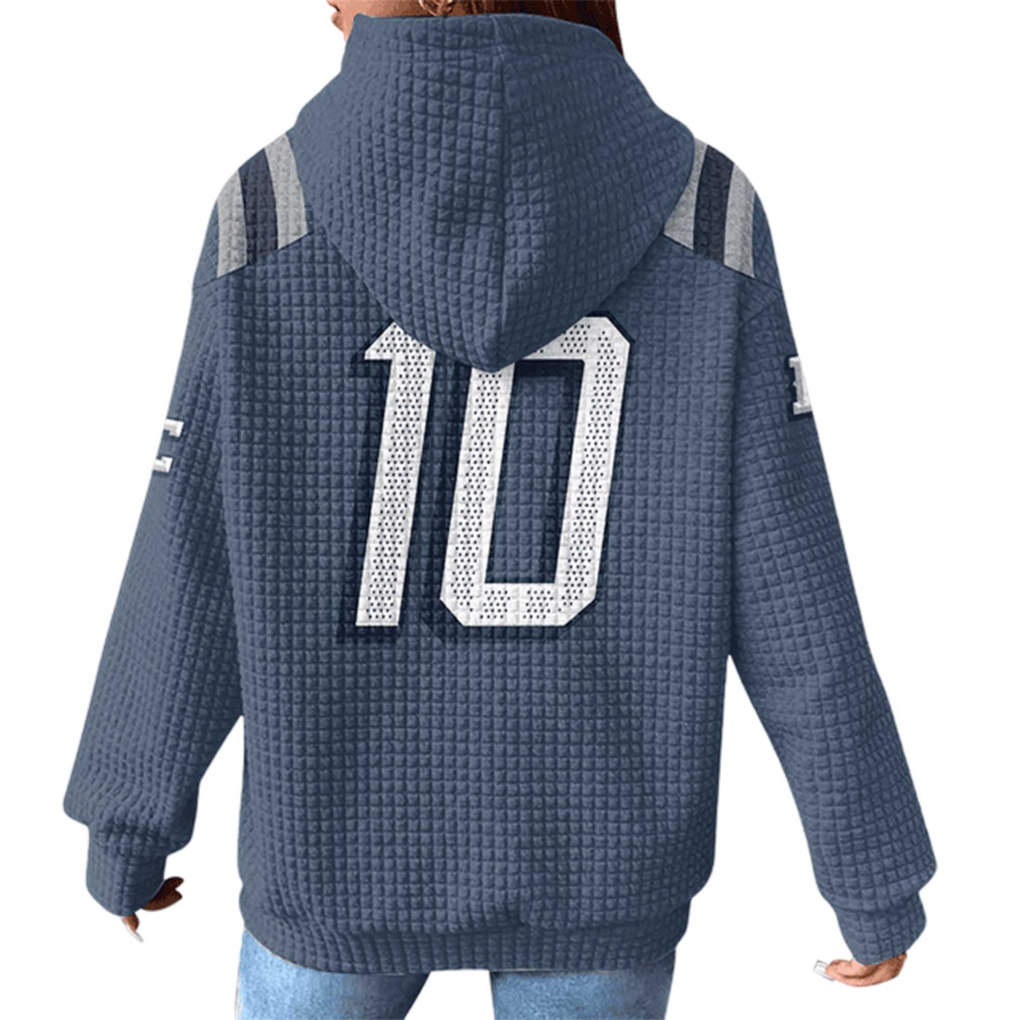 The waffle knit pattern gives the hoodie a unique feel, adding depth and structure while keeping the weight manageable. The shoulder stripe and oversized numbers create a classic game-day look. The fabric is warm, the stitching adds durability, and the white accents pop against the saturated blue. With a roomy hood, kangaroo pocket, and a relaxed fit, this hoodie is ideal for chilly game days, outdoor events, or casual wear.