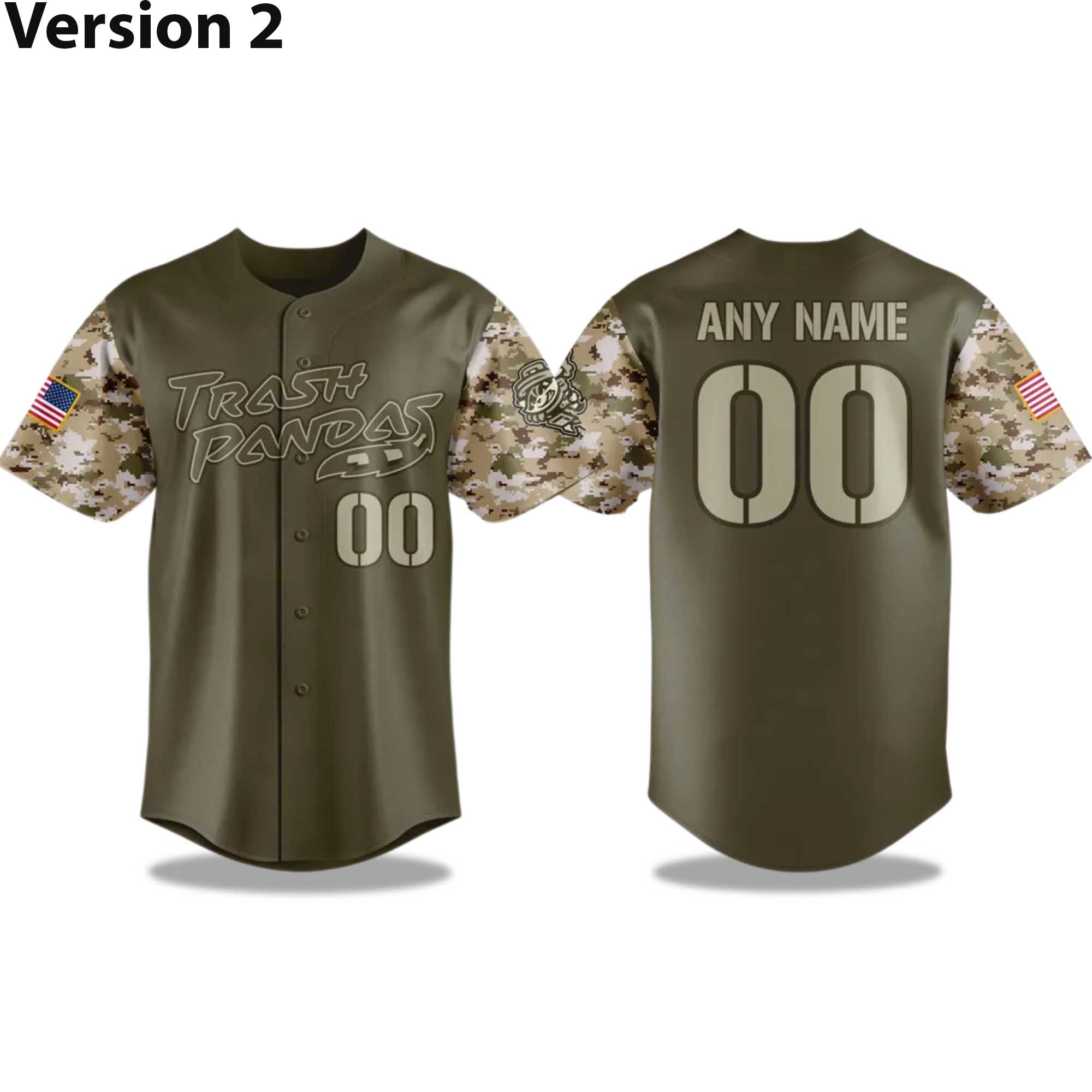 This special edition jersey features a digital camouflage pattern in earthy green and brown tones, highlighting strength and resilience. Trash Pandas graphics are printed on the front, while an American flag patch on the sleeve adds a patriotic touch. On the back, fans can customize the jersey with ANY NAME and the number 00 for a truly unique and meaningful look. The lightweight, breathable fabric ensures comfort whether you’re on stage or just wearing it every day.
