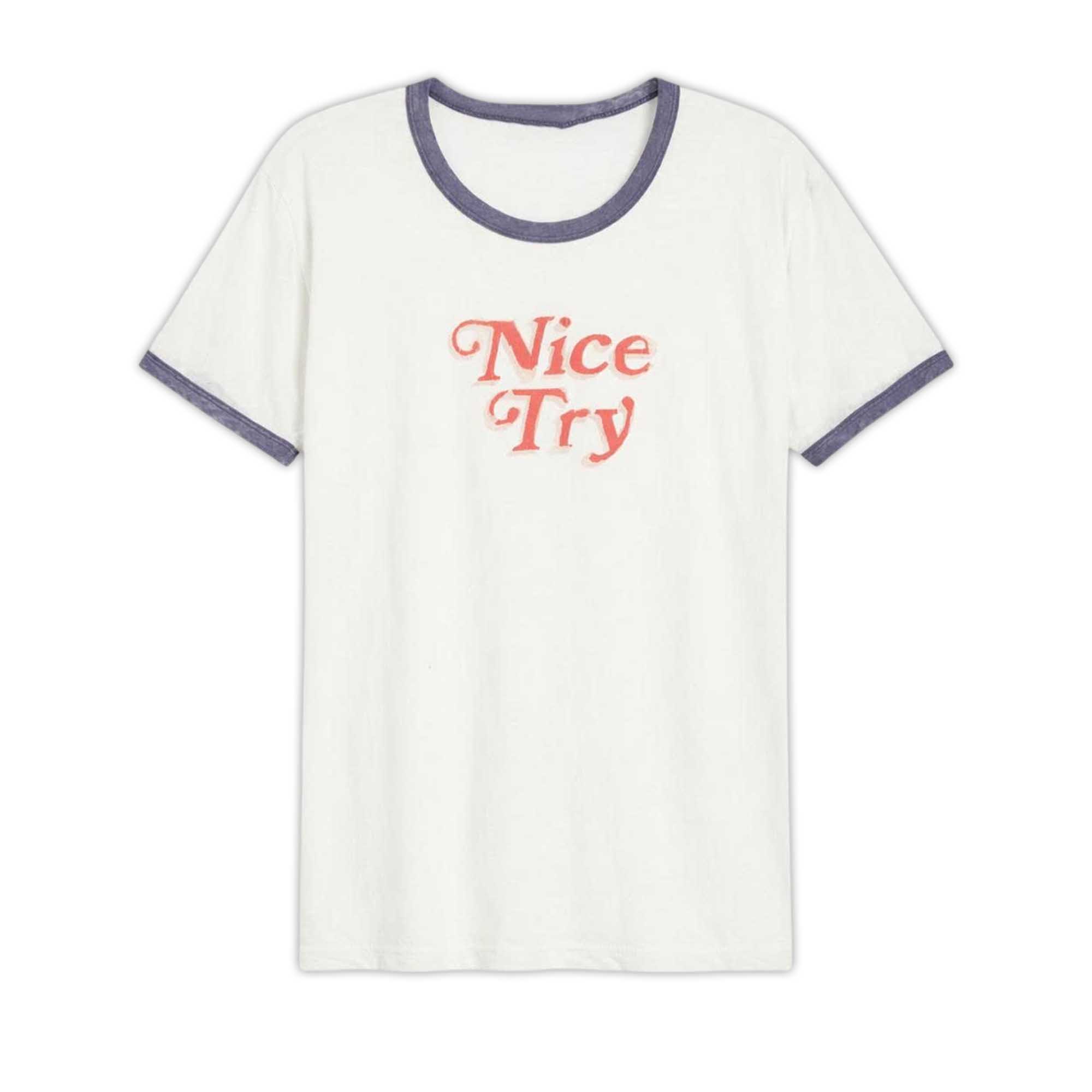 The words Nice Try are centrally placed on the front in a light pink tone, creating a subtle contrast against the bright background. The smooth, slightly classic curved lettering adds charm without complicating the overall design. The muted trim highlights the design, creating a balanced and harmonious look. Overall, the design feels light, stylish, and subtly expresses personality.