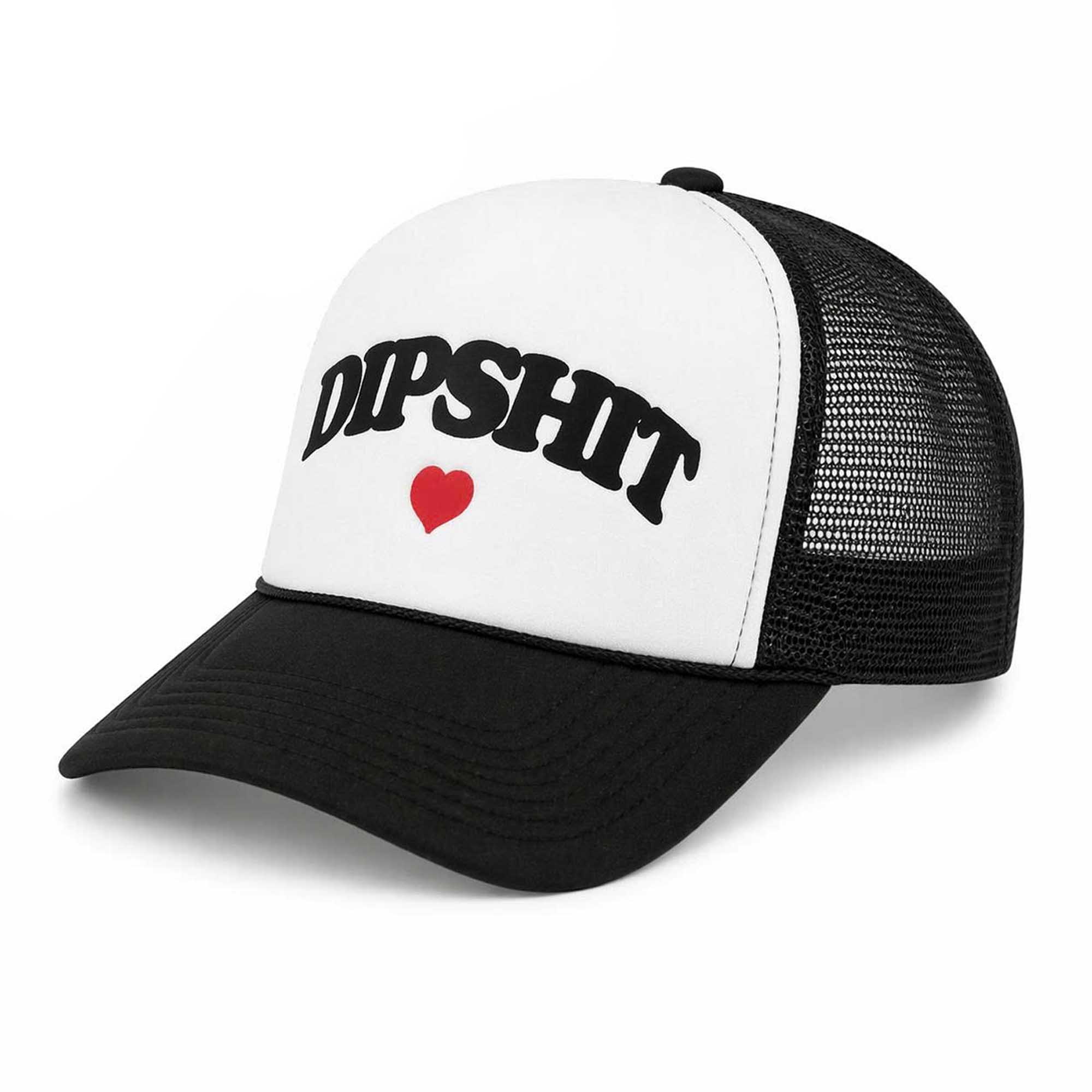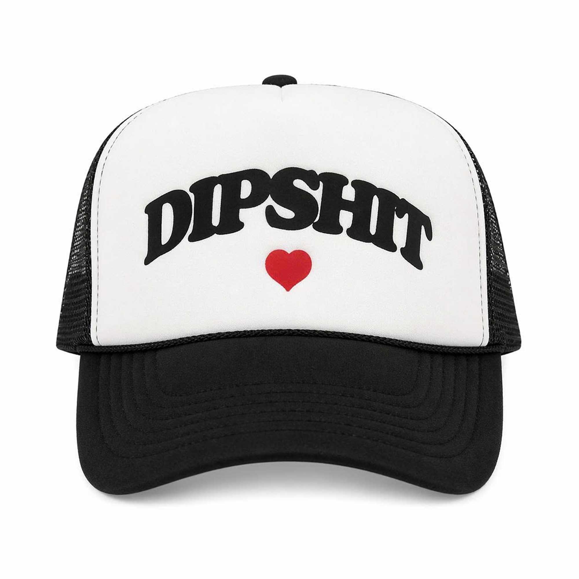 The front features a pristine white panel contrasting with the black brim and black mesh back, creating a clean, timeless two-tone look. Bold black lettering on top adds personality, while a small red heart underneath softens the edges with a touch of playfulness. The baseball cap style keeps the design simple and fashionable. The black and white color scheme makes it easy to match with many outfits while still highlighting the graphic on the front.