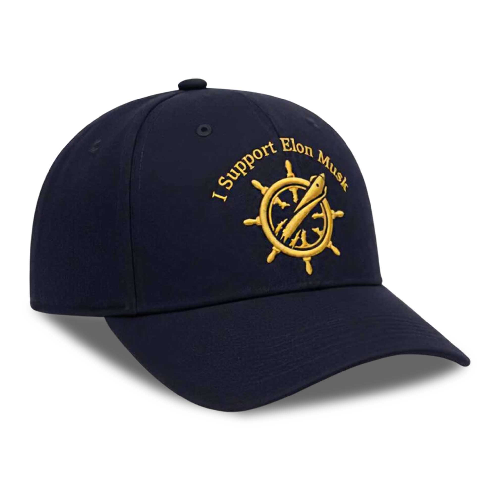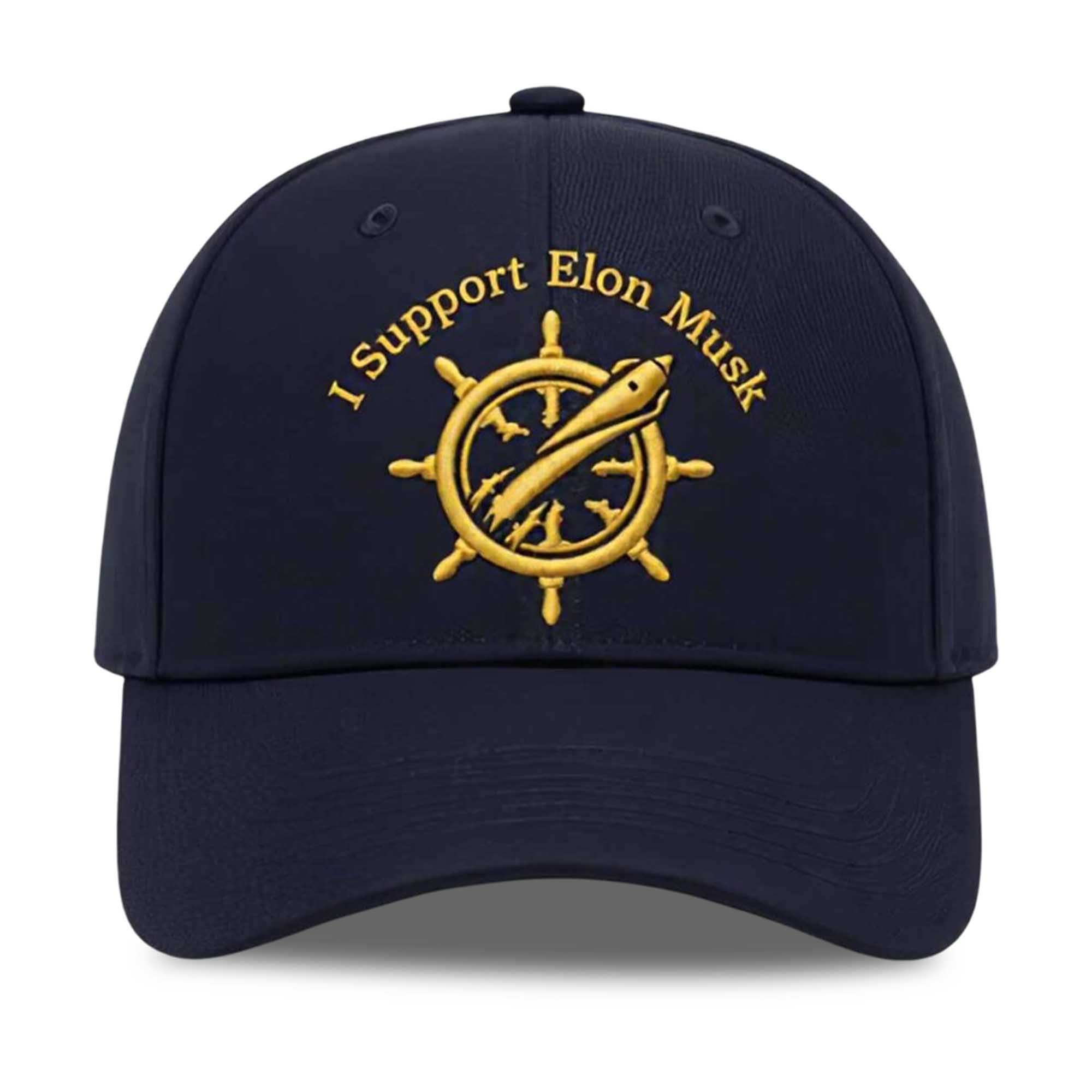 The cap features a deep navy blue color, creating a clean and easy-to-match base. At the center, a gold ship’s steering wheel emblem is combined with a rocket-inspired element, symbolizing direction, progress. The I support Elon Musk lettering curves above the image, creating a balanced and eye-catching composition. The structured crown maintains a neat shape, while the contrast between the gold embroidery and the dark fabric enhances visibility and style.