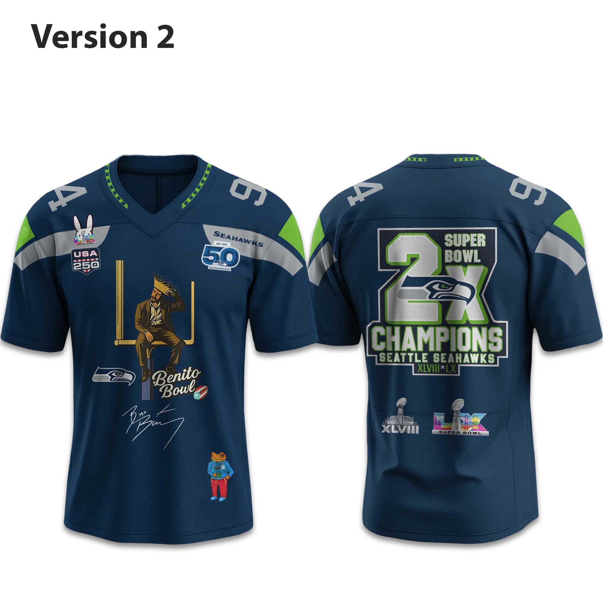 The discussion surrounding the Seahawks and Bad Bunny is heating up as fans envision a bold fusion of sporting heritage and the global musical influence associated with Super Bowl LX. This Seahawks 2X Super Bowl Champions 2026 x Bad Bunny Jersey reflects that shared energy—champion pride on one side, creative attitude on the other bringing two worlds together in a modern and exciting way.