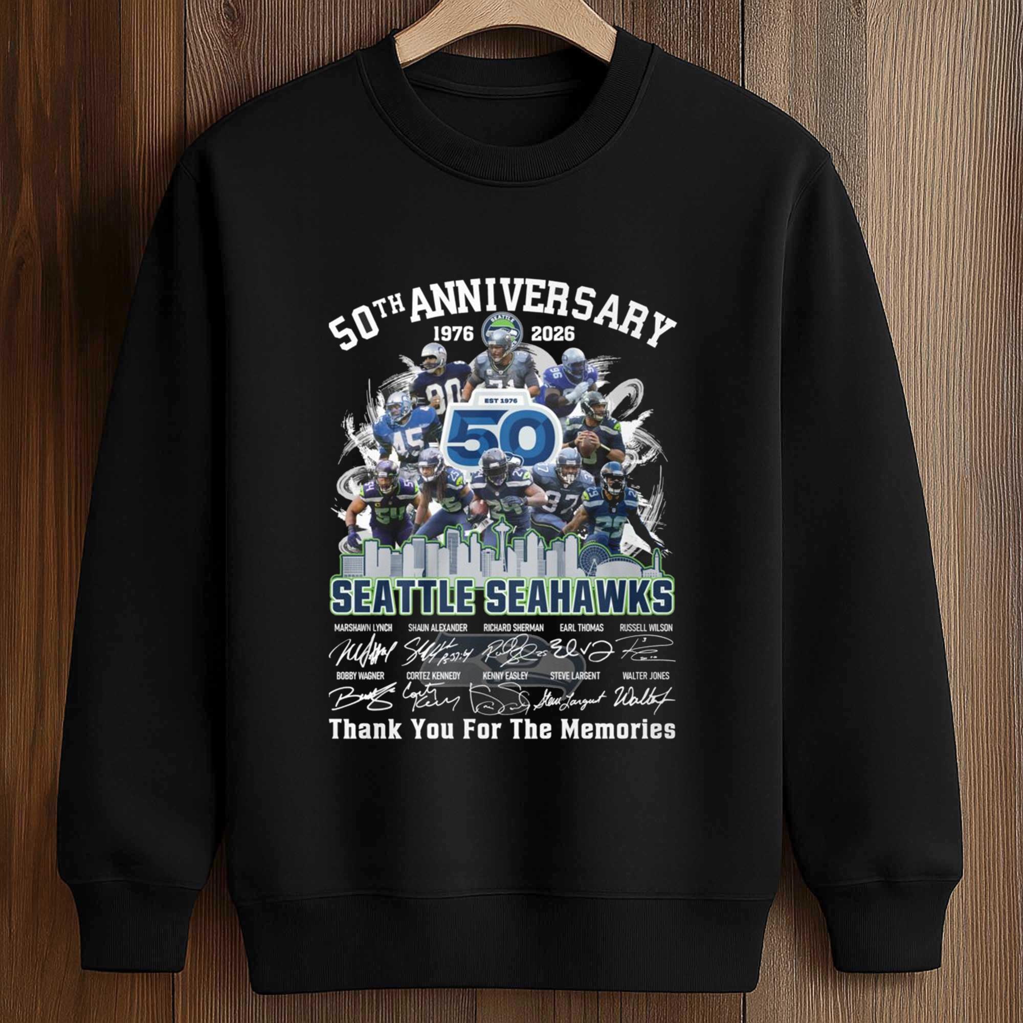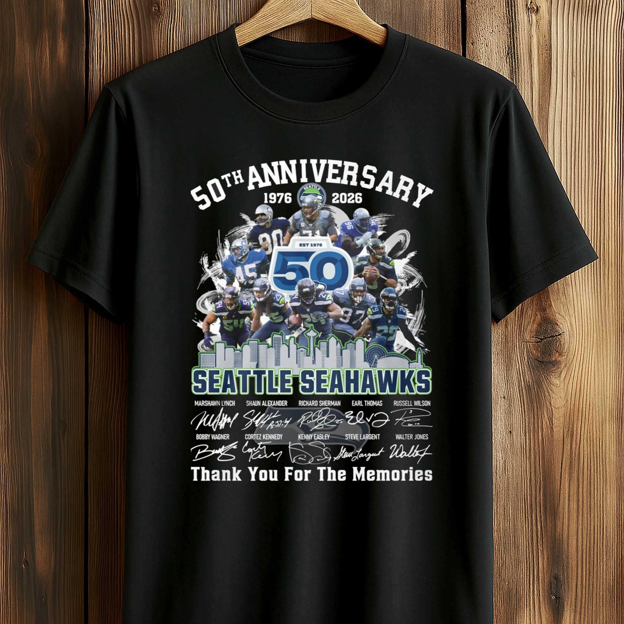 The Seahawks 50th Anniversary 1976-2026 Thank You For The Memories Shirt marks a milestone with profound meaning for fans. The design combines the classic colors , a powerful 50-year logo, and a collage of uniformed players in a dynamic layout. It is a tribute to the journeys, seasons, and memories that have defined half a century of football tradition.