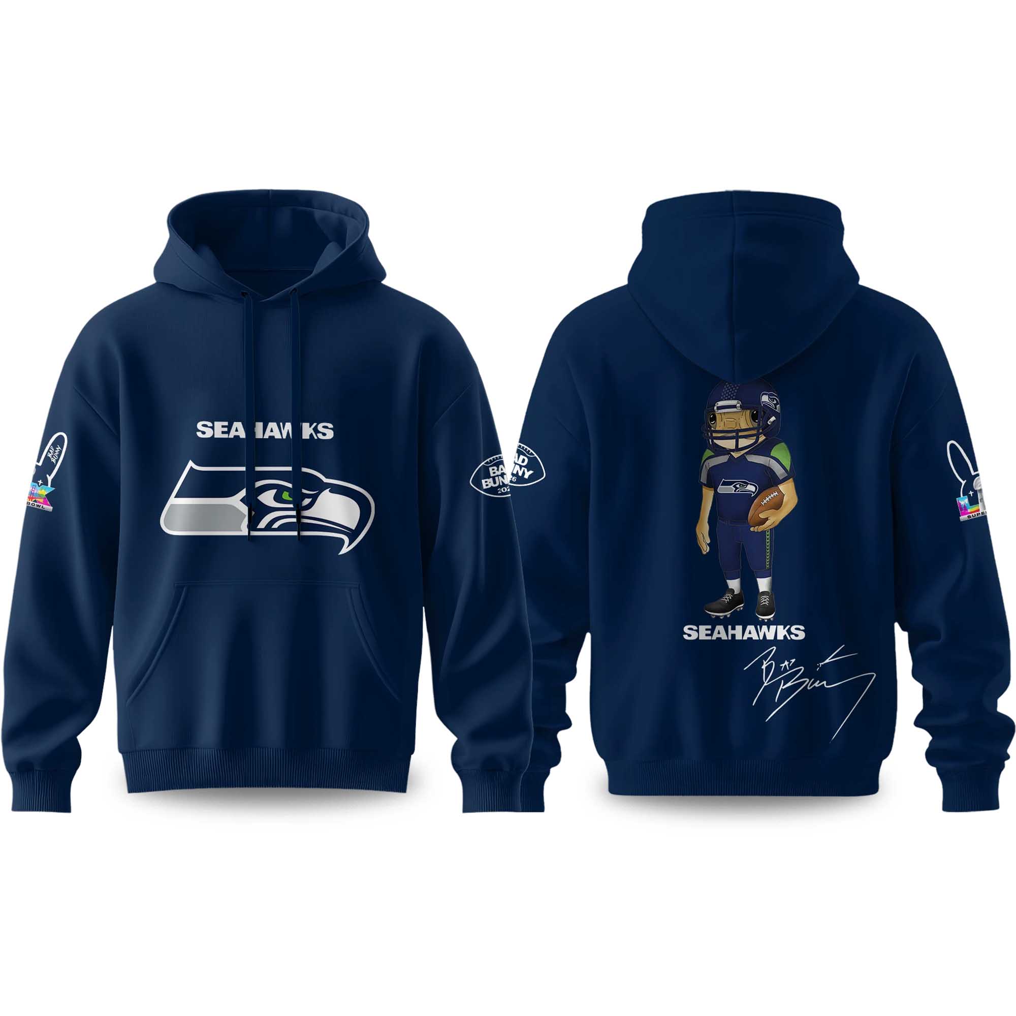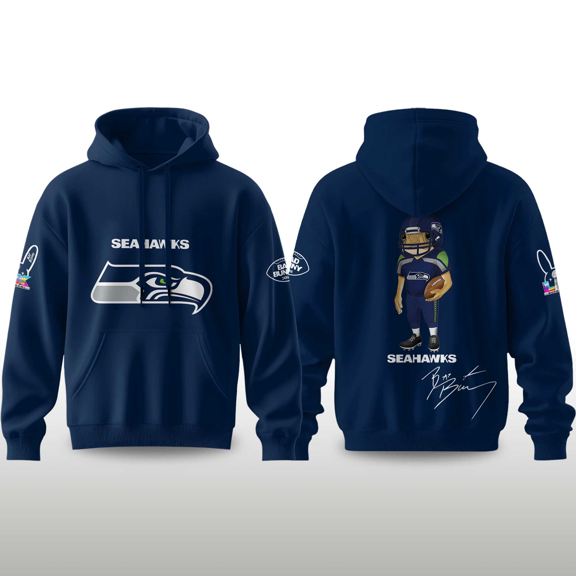 The Seahawks Bad Bunny 2026 Super Bowl Concho Football Hoodie delivers a strong visual impact without being overly flashy. The Seahawks-inspired imagery on the front combines with the playful football character on the back, creating a balanced look that showcases team pride and creative personality in one product.