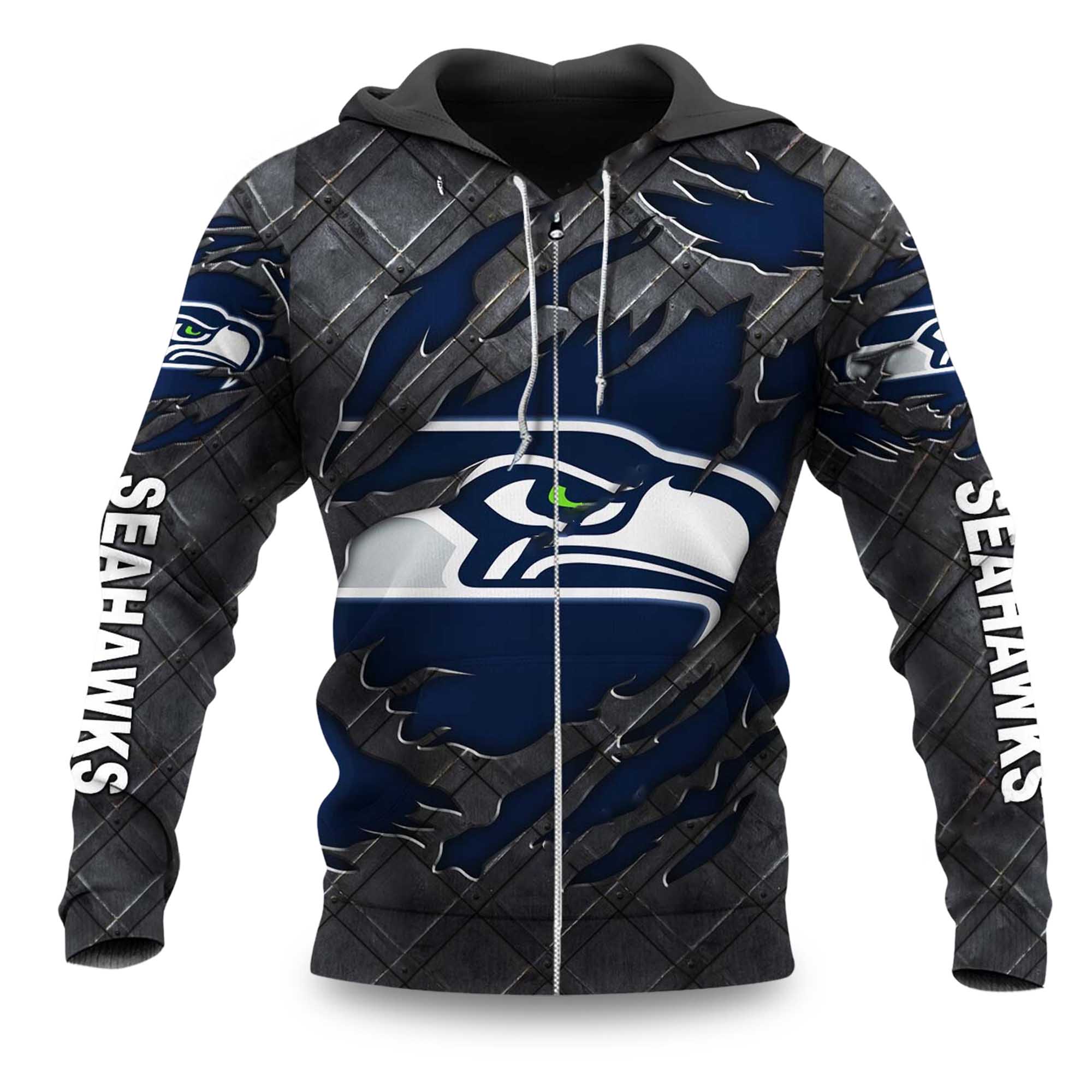 The hoodie draws inspiration from industrial metal surfaces and modern streetwear trends. The cracked texture symbolizes strength and resilience, while the deep blue color reflects the Seahawks’ identity. This combination creates a bold, urban design that strongly reflects the team’s powerful presence on the field.