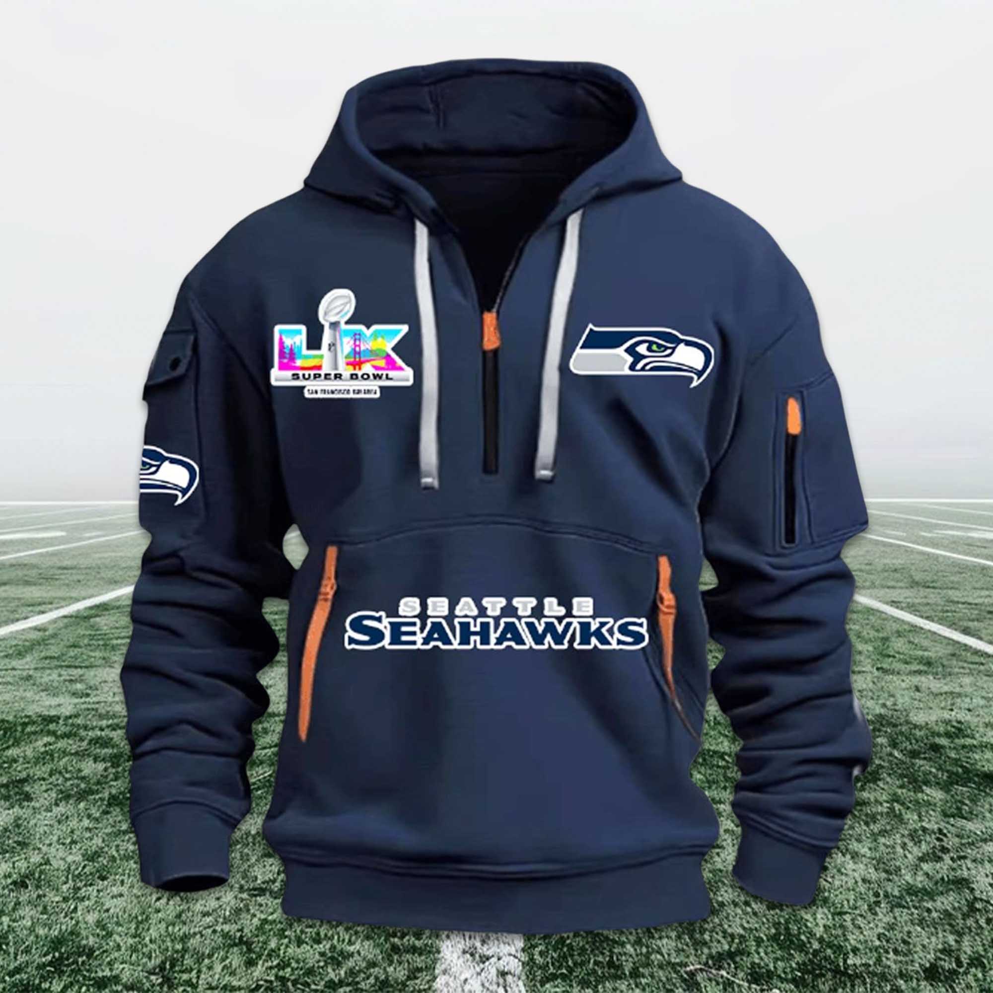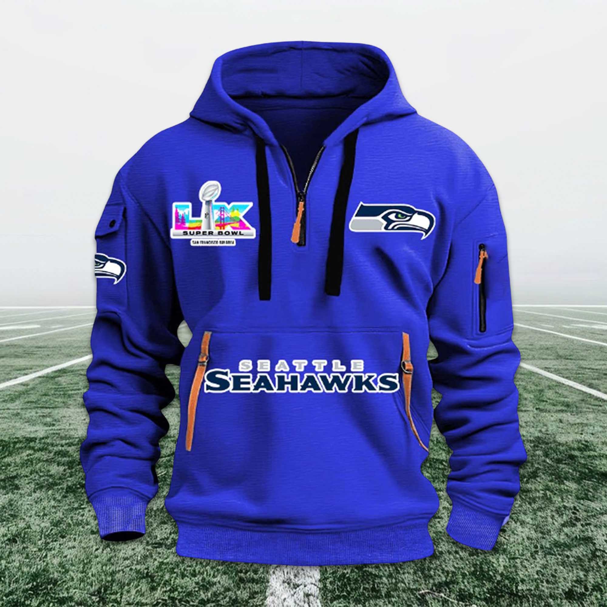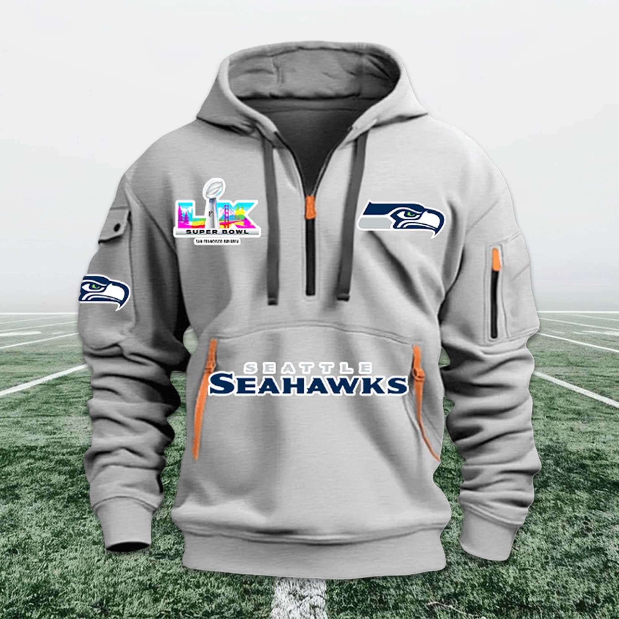 This Seahawks Bowl LX 2026 Quarter Zip Hoodie is inspired by Seattle’s journey to Bowl LX. The front design highlights the Seahawks’ name in confident typography, combined with Bowl LX graphics that showcase the magnitude of the achievement. The team logo on the chest and sleeves creates balance, while the zip-up collar gives the hoodie a neat, dynamic look, suitable for both casual and game attire.
