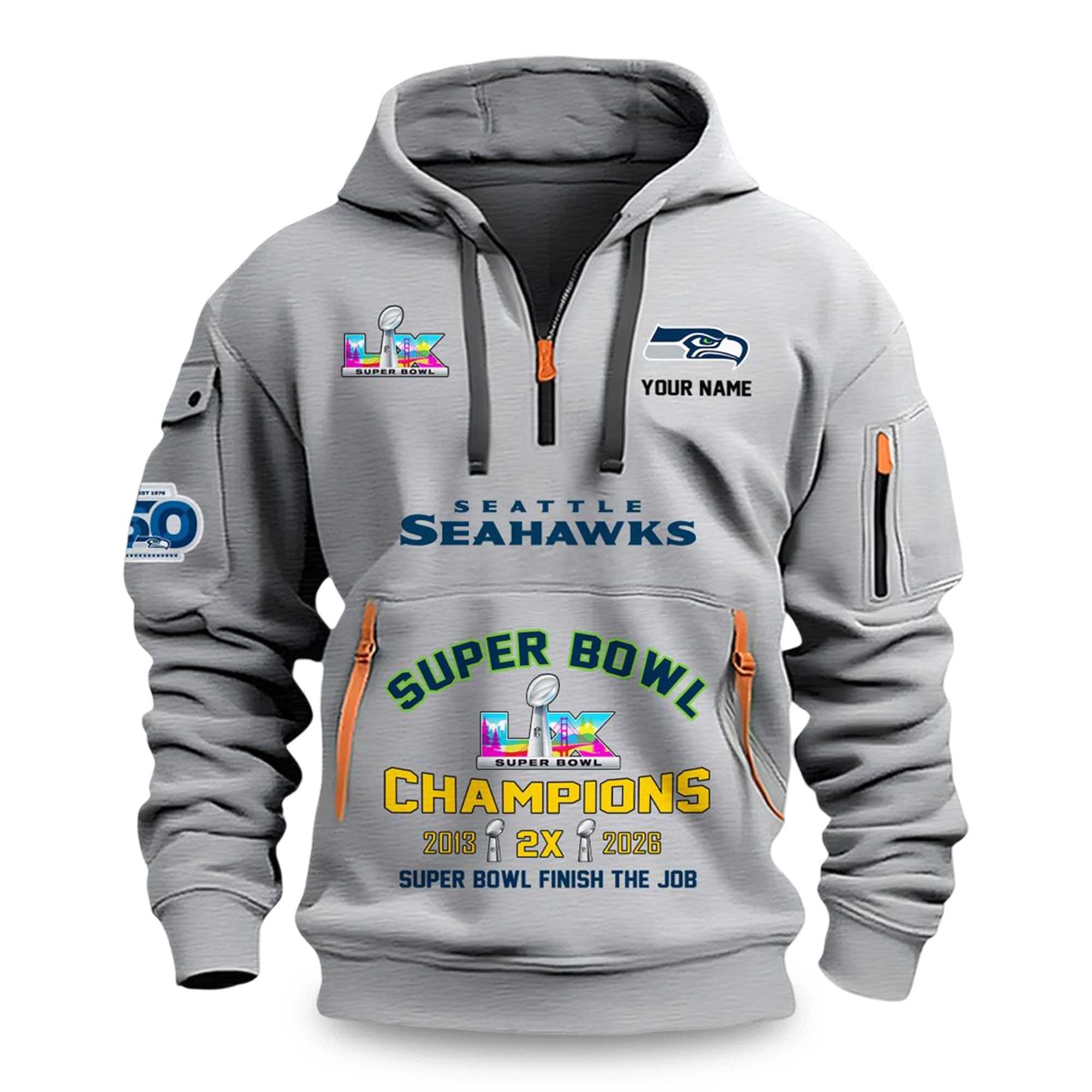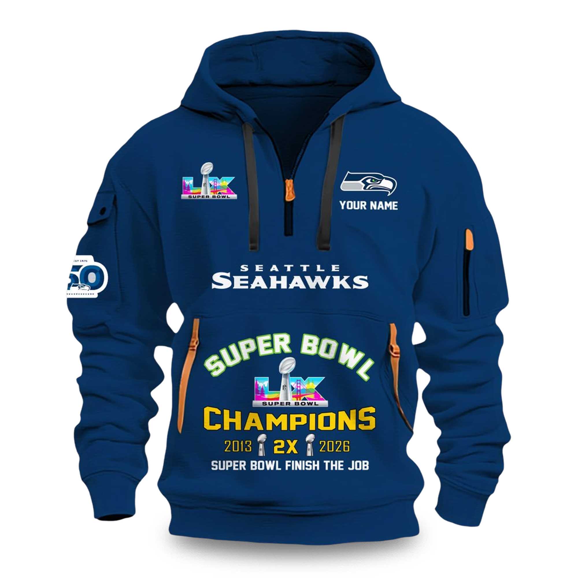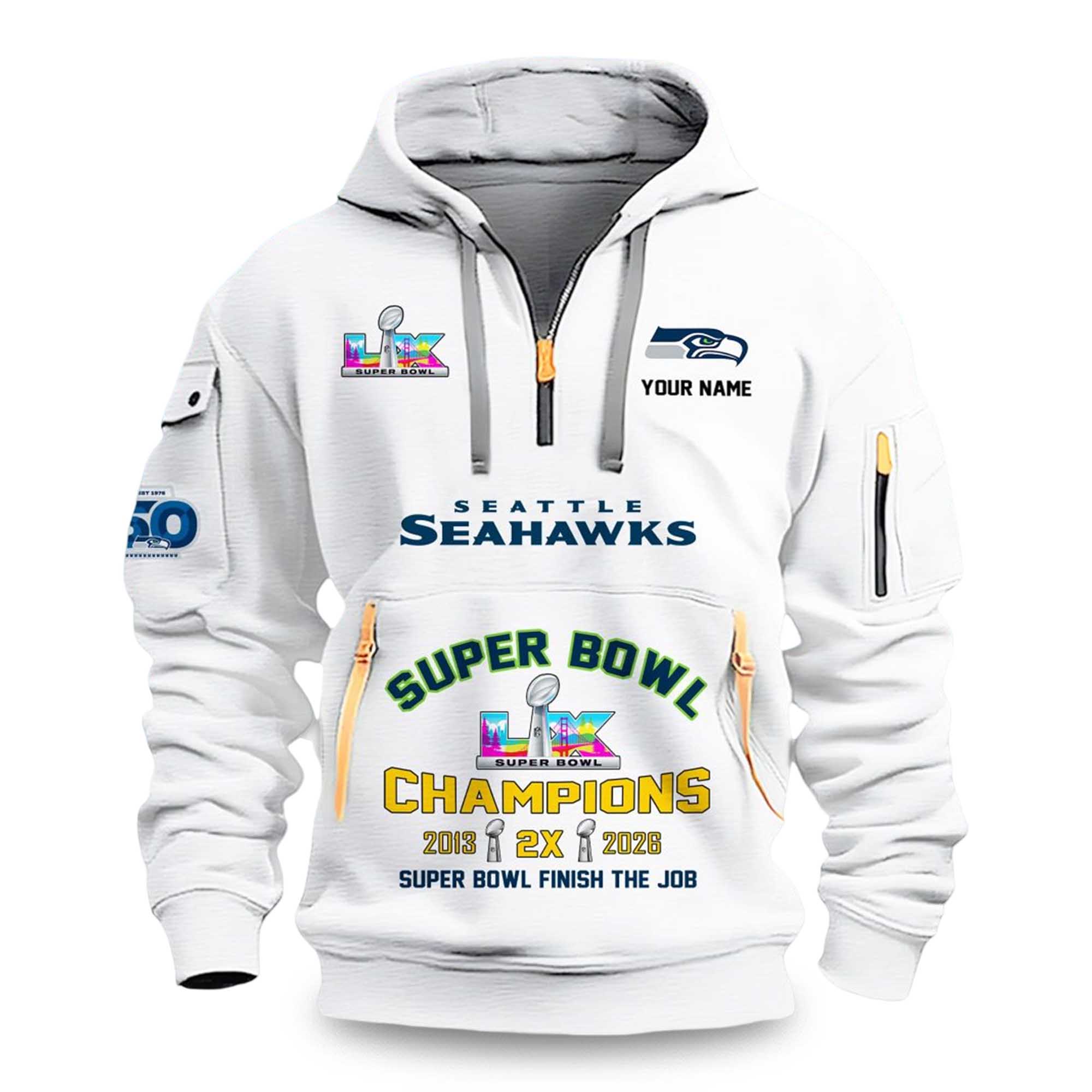 This Seahawks Champions 2026 Super Bowl Finish The Job Quarter Zip Hoodie features a sleek black base with neon yellow accents highlighting the chest and pockets. The front displays the Seattle Seahawks logo, a Super Bowl-inspired emblem, and the words “Finish The Job,” arranged for a strong visual balance. Designed for cooler days, this hoodie combines comfort with a sporty look, making it stand out at game shows or on the street.