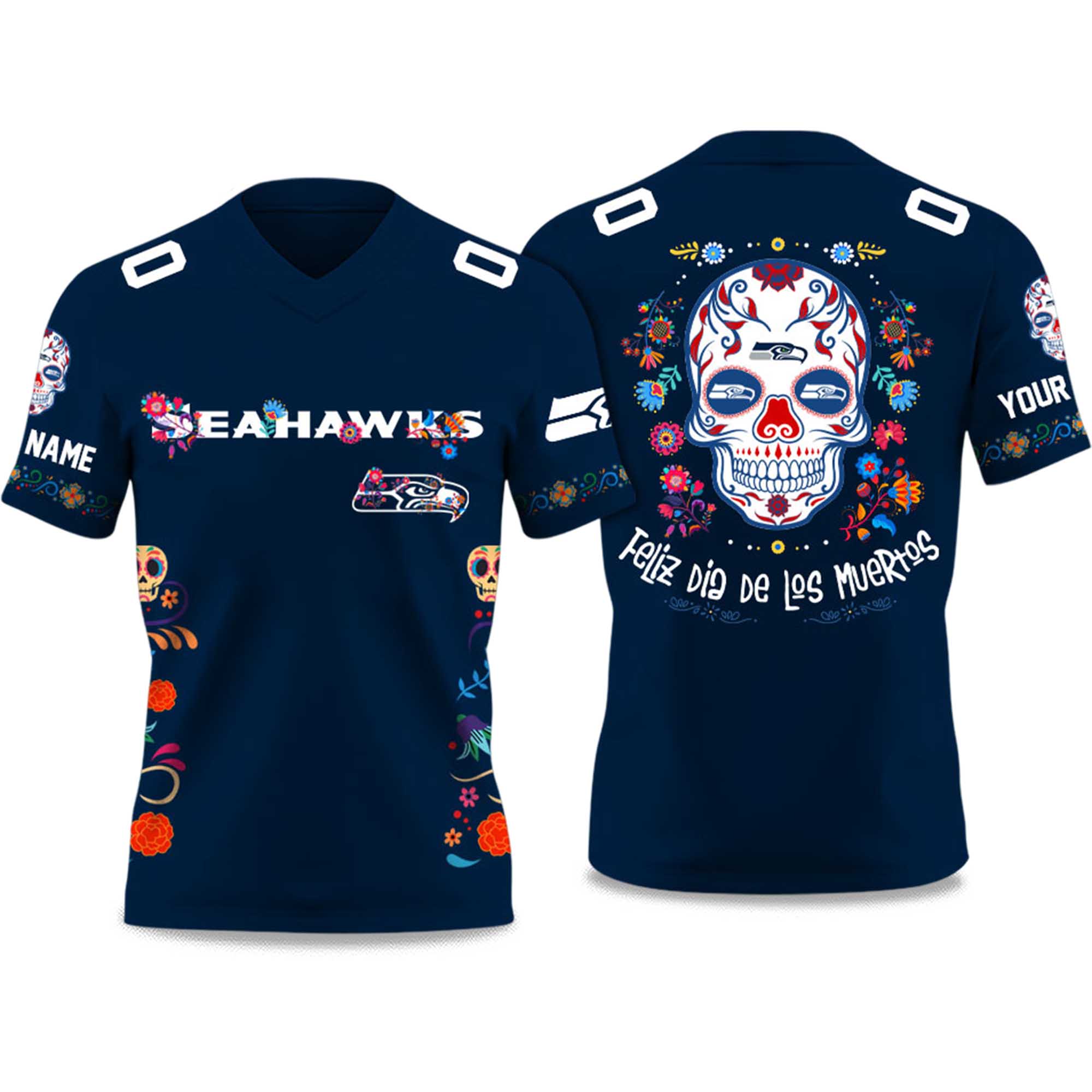 The Seahawks Día de Muertos 2025 V-neck Short Sleeve Jersey combines the powerful symbolism of Día de Muertos with the bold identity of the Seattle Seahawks. Featuring a vibrant skull motif surrounded by floral motifs, the jersey combines team tradition, color, and passion into one striking design. This is the perfect item for fans who love the arts and culture while showing their unwavering support for the team.