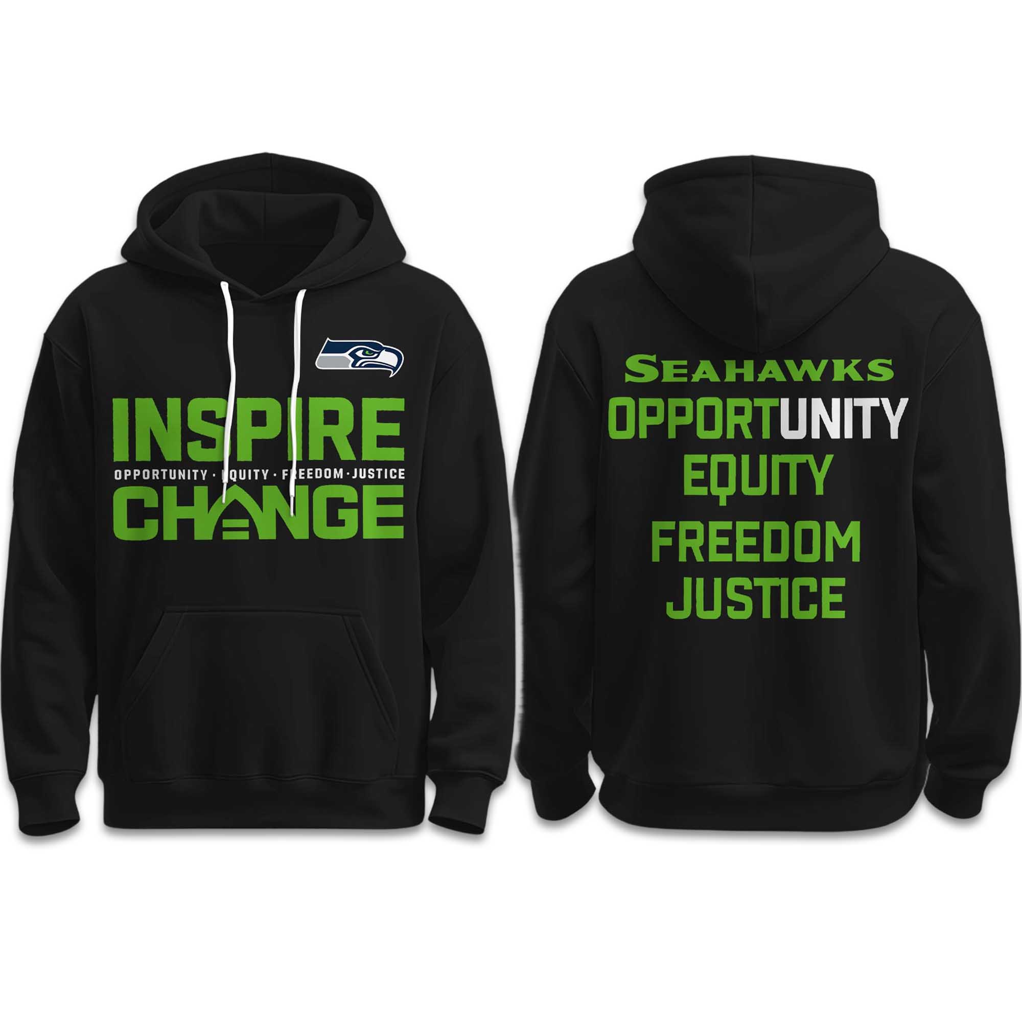 The hoodie design focuses on clarity, balance, and strong visual impact. The black background makes the green lettering stand out clearly, reflecting the Seahawks’ iconic colors. The front and back design is easy to read, conveying the message “Inspire Change” without being distracting. The hoodie has a comfortable structure with a warm inner lining, a beautifully designed hood, an adjustable drawstring, and a convenient front pocket, making it suitable for everyday wear while maintaining a modern and purposeful look.