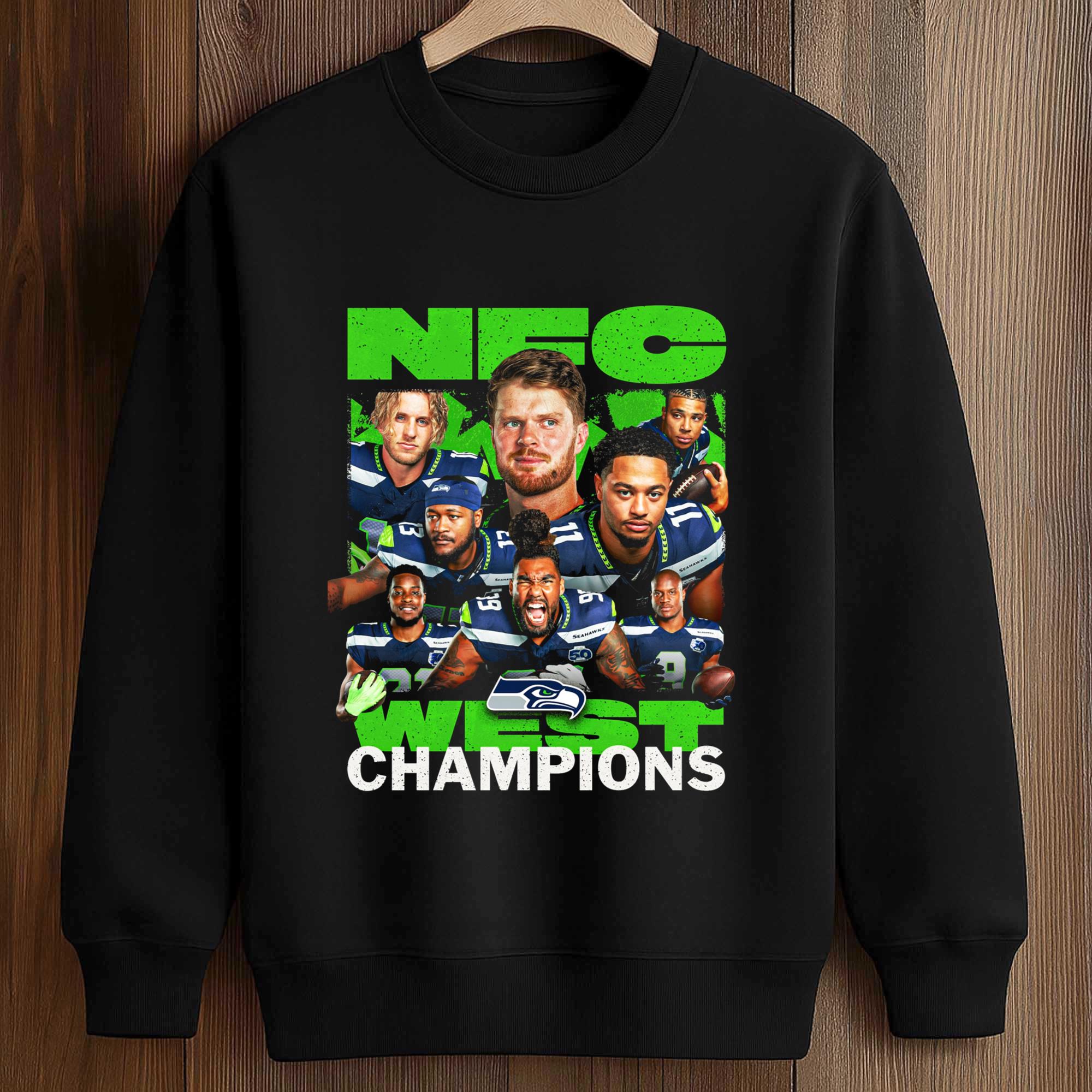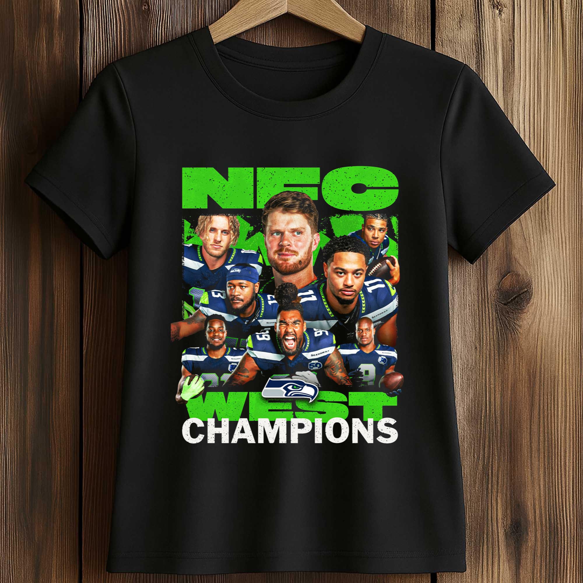 The Seahawks NFC West Division Champions 2025 2026 Shirt features an impressive collage of Seahawks’ outstanding players arranged around the prominent “NFC West Champions” lettering. The striking green and white stand out against the dark background, creating a strong and easily recognizable contrast. This jersey is designed for everyday wear but still carries the meaning of a championship moment, ideal for fans who want both comfort and visual impact.