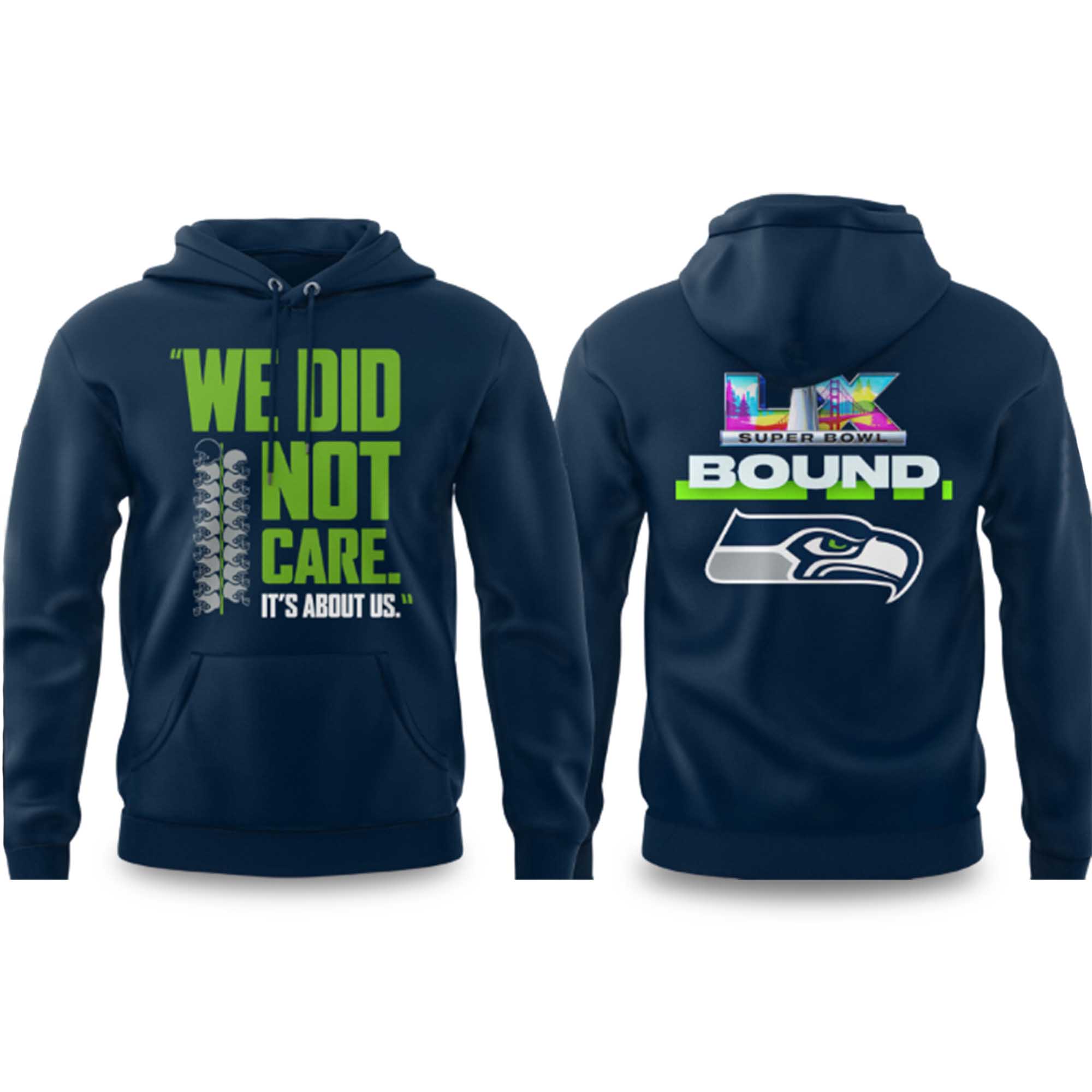 The message behind this shirt is simple and powerful. “We Did Not Care” ignores potential gossip, criticism, and outside expectations. “It’s About Us” focuses on the team, the fans, and the belief. Bowl LX represents ambition and confidence reminding everyone that Seahawks supporters stand together no matter what the season brings.