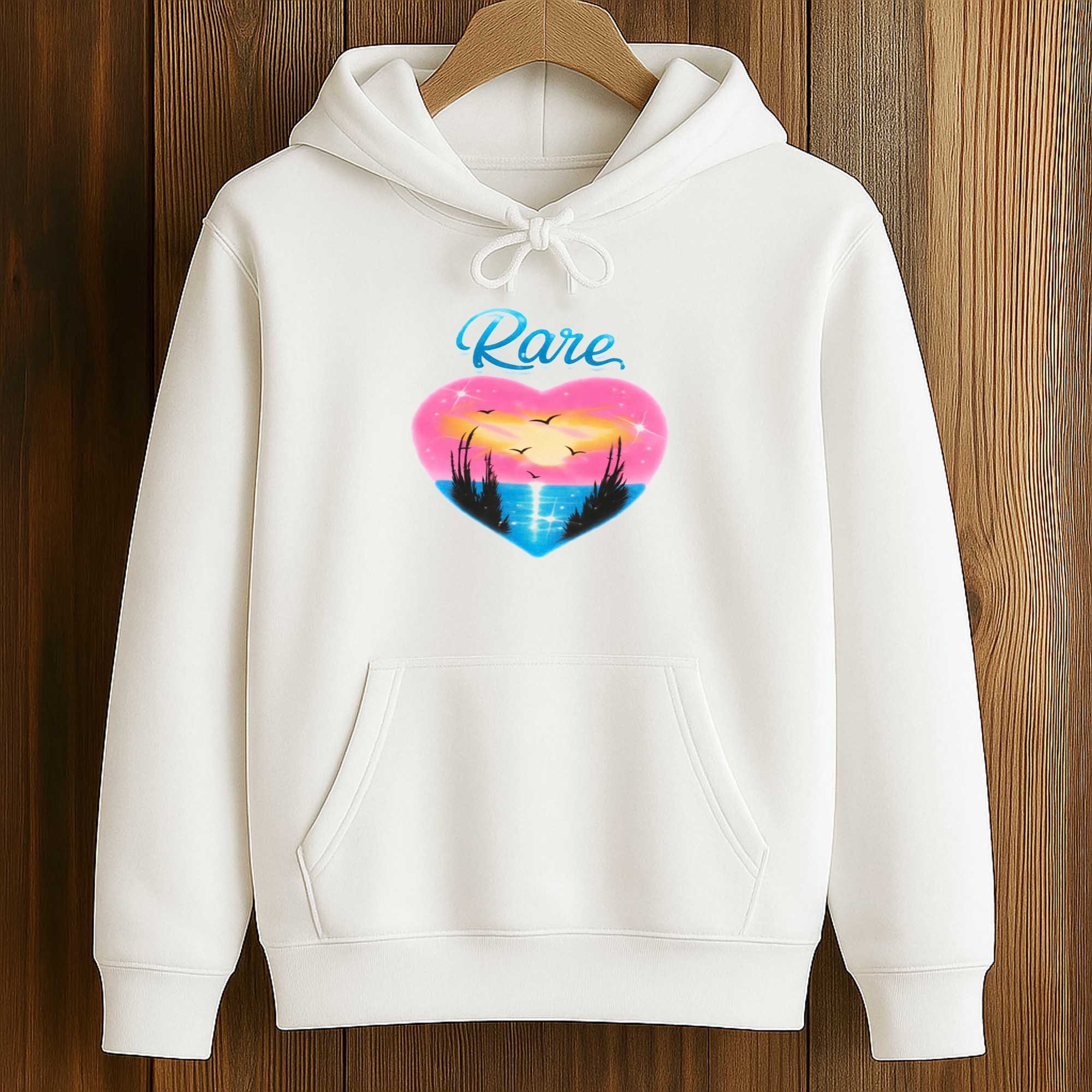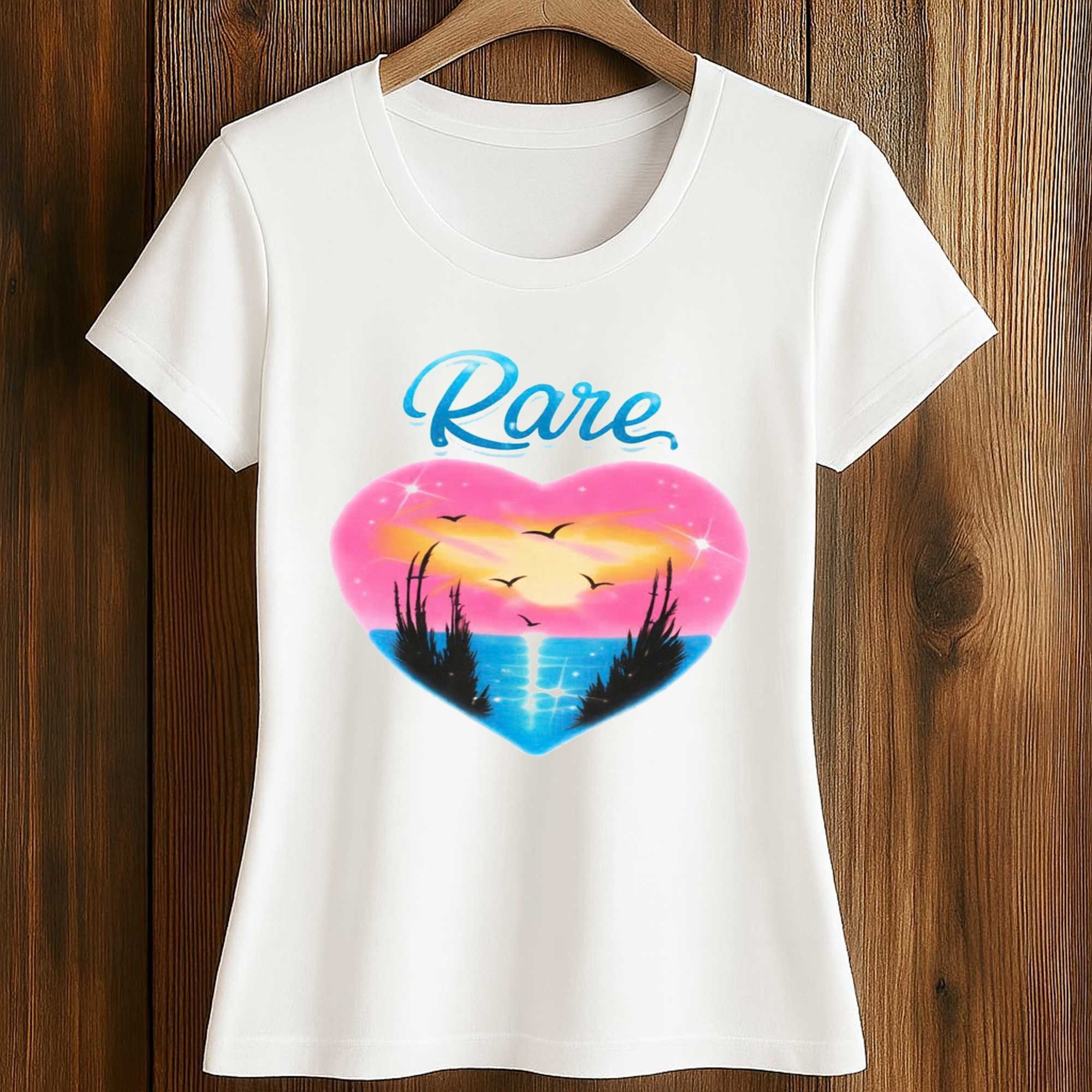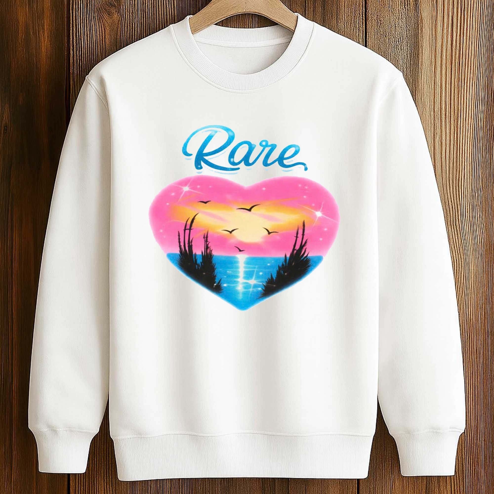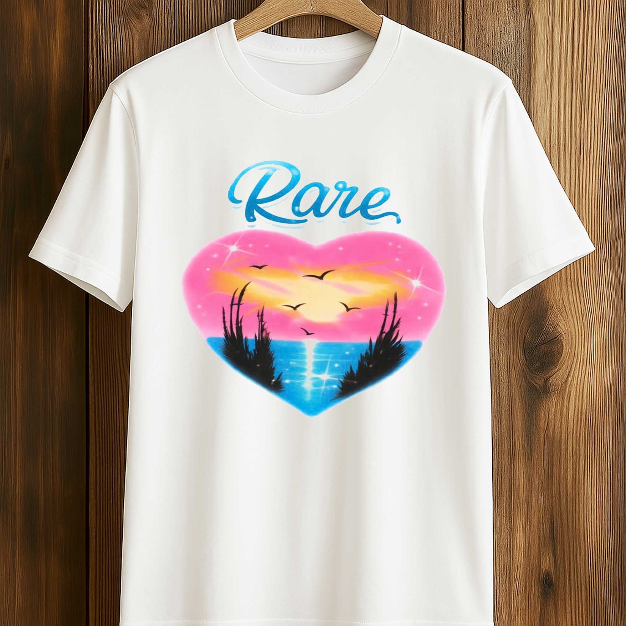 This Selena Gomez Rare Album Cover Tee Shirt brings a peaceful, dreamy feel to everyday wear. The design features a vibrant heart-shaped sunset in shades of pink, blue, and light yellow, combined with the word Rare in a soft, handwritten font. The lightweight and comfortable fabric makes it easy to wear all day. The relaxed fit provides a relaxed yet polished look.