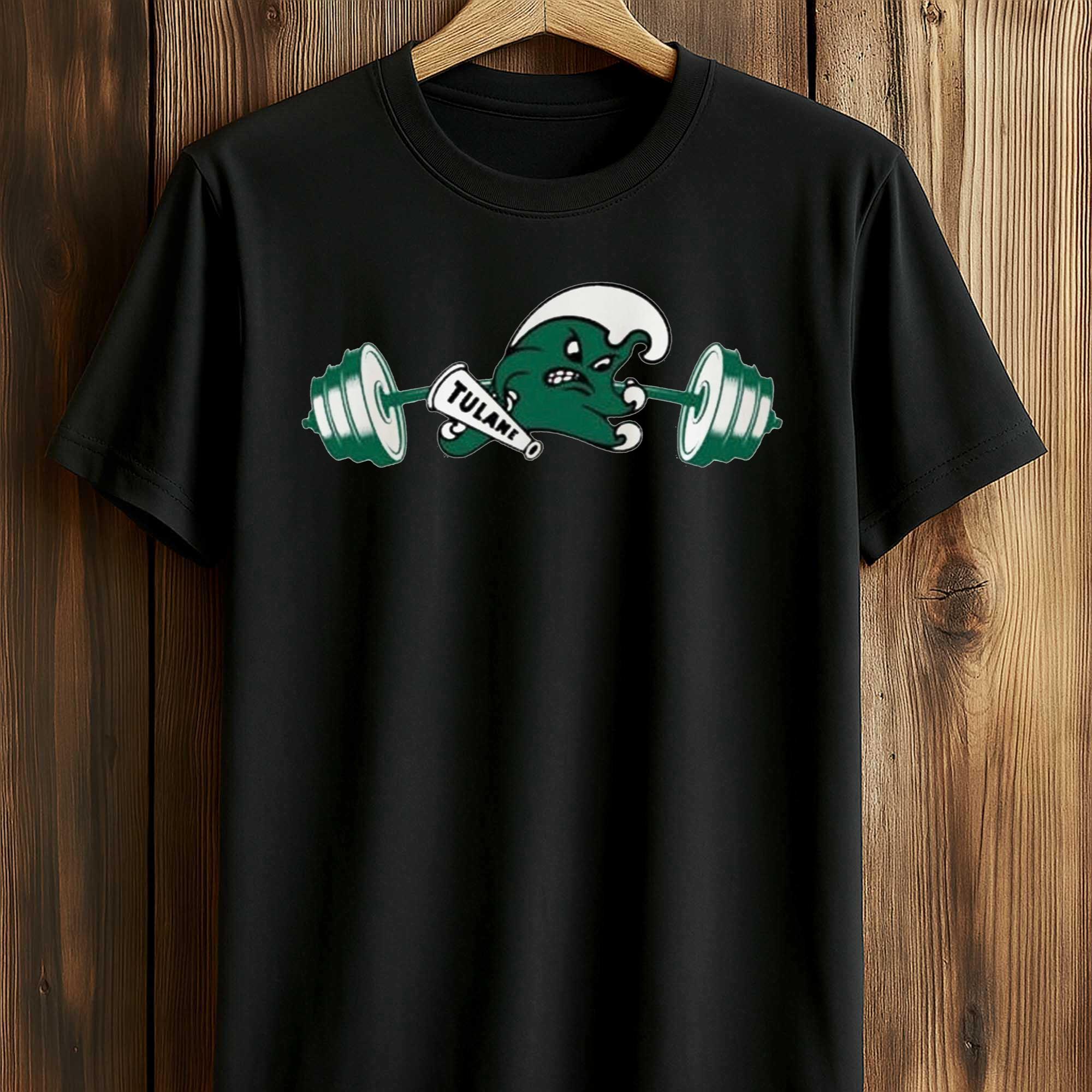 The Shadre Hurst Weight Lifting Tulane Shirt is inspired by the dynamic athletic culture associated with Tulane Athletics. Featuring a cartoon wave mascot lifting weights, the design exudes a mix of determination and humor – perfect for fans who love a strong personality in their apparel. It conveys the strength of the gym while still maintaining a playful school spirit.