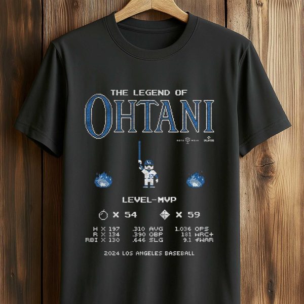 This shirt’s design packs a powerful visual punch! Dark blue lettering proudly proclaims “The Legend of Ohtani,” paired with a classic pixelated image of Ohtani playing a winning basketball. Below, stats like “Level: MVP,” “54 HR,” and “39 SB” immortalize his 2024 heroics, combining classic gaming feel with modern glory. It’s the perfect opening theme for any basketball meeting!