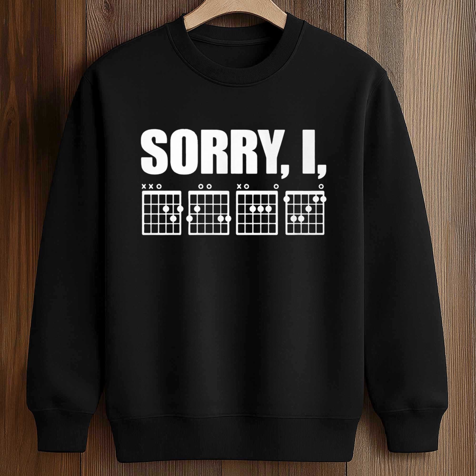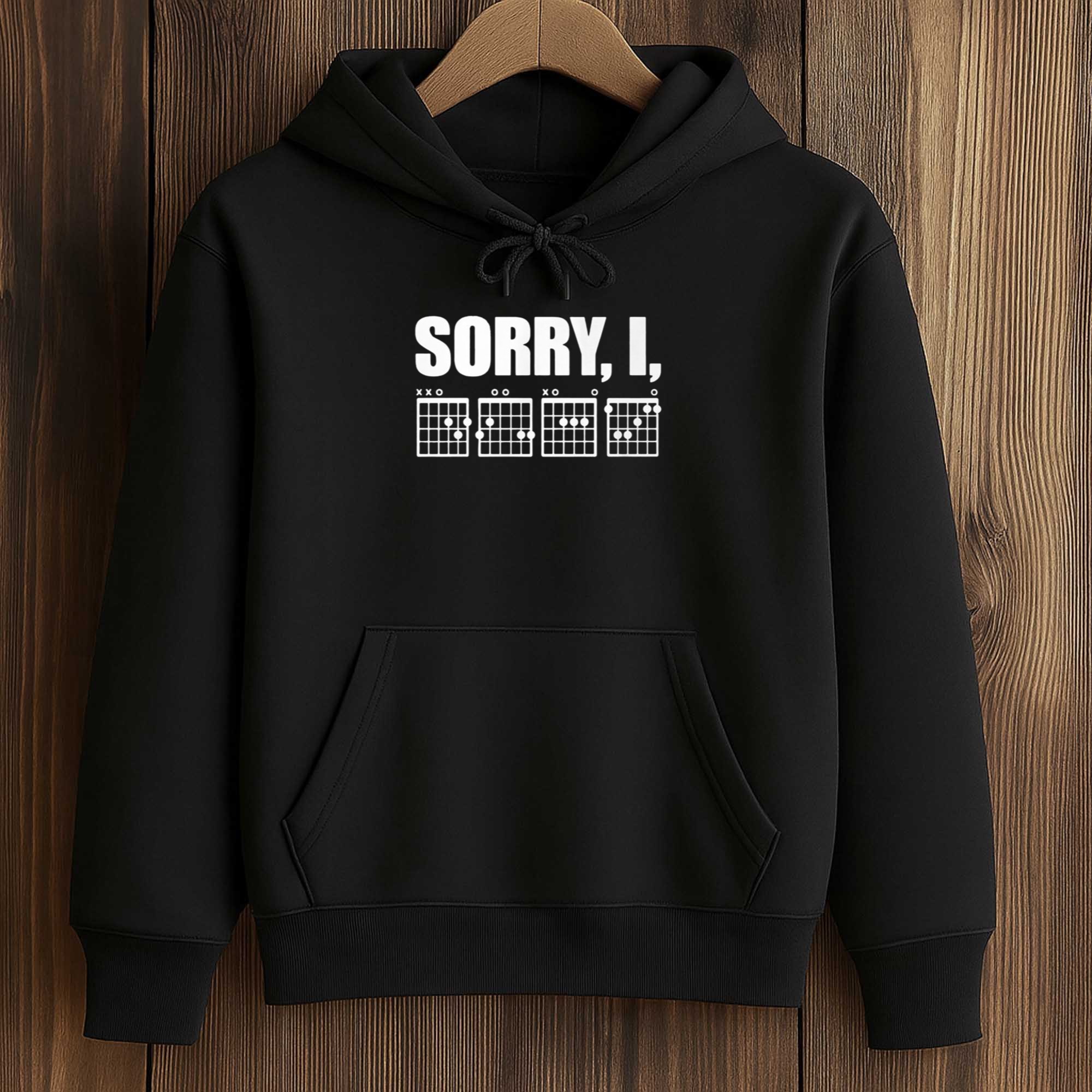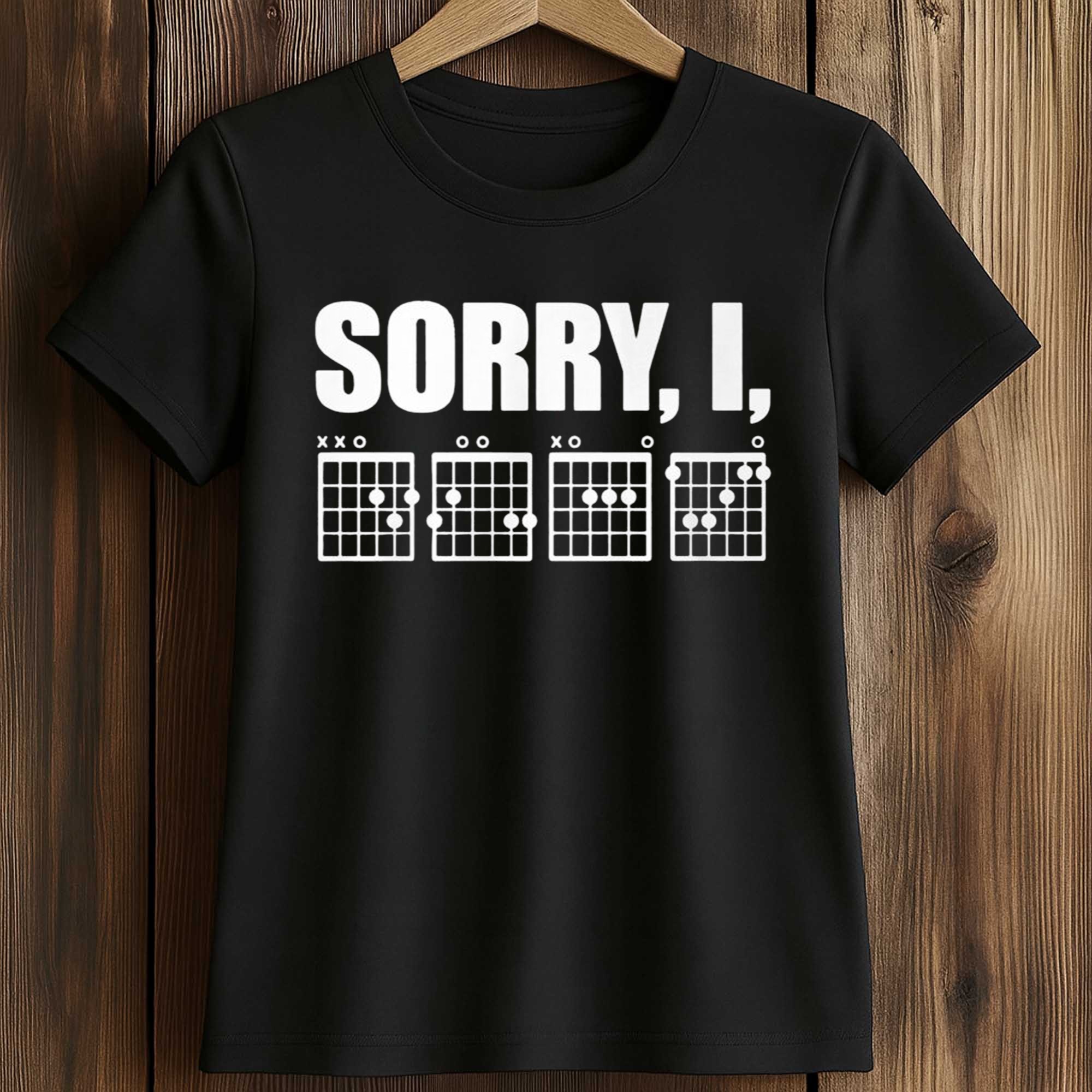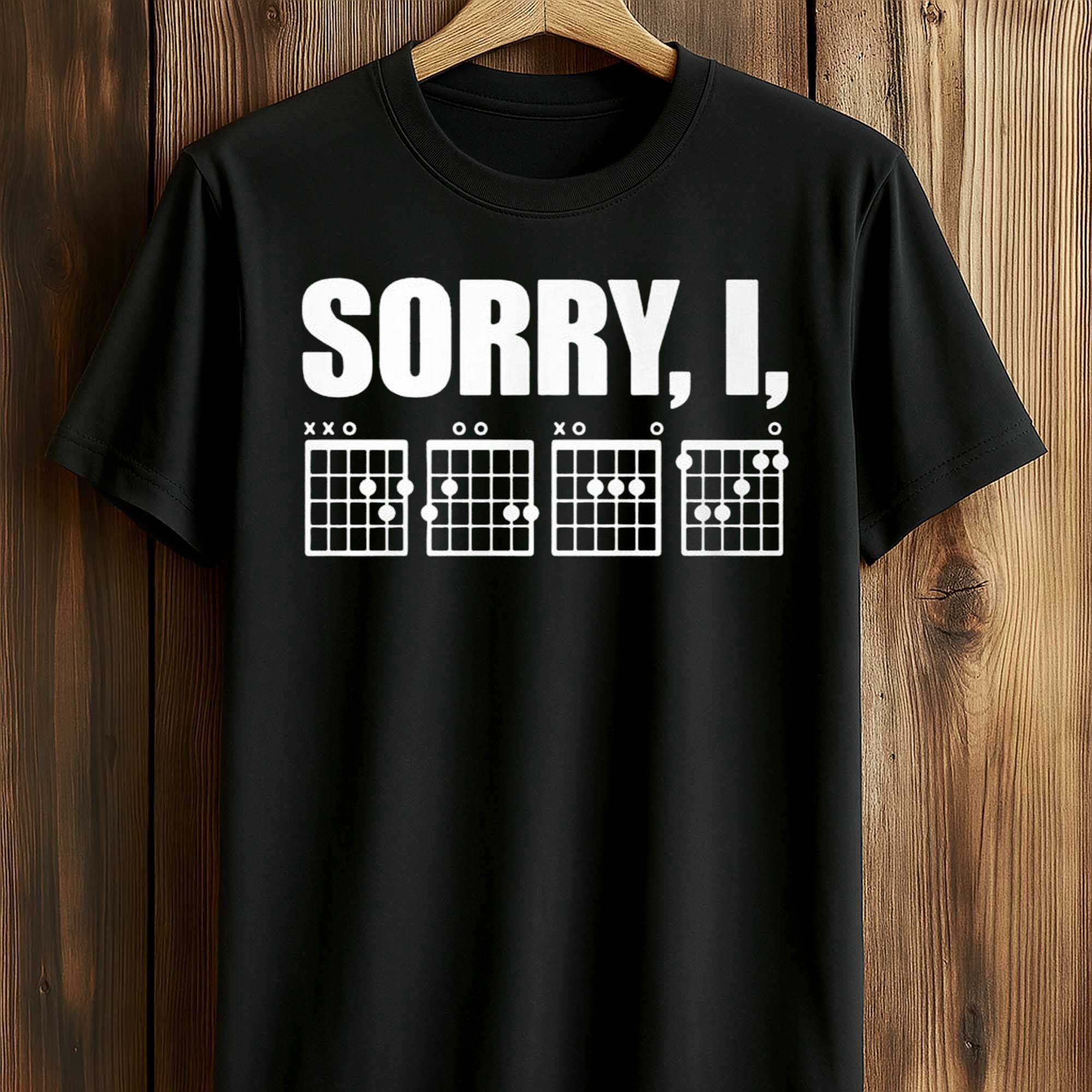 The design features a striking white inscription of Sorry, I, followed by a guitar chord diagram illustrating the rest of the phrase. Printed on a black shirt, the contrast is sharp and easily noticeable. The design combines musical knowledge with wit, particularly appealing to guitar players. The simple monochrome style easily pairs with jeans, shorts, joggers, or layered jackets for a modern, casual look.