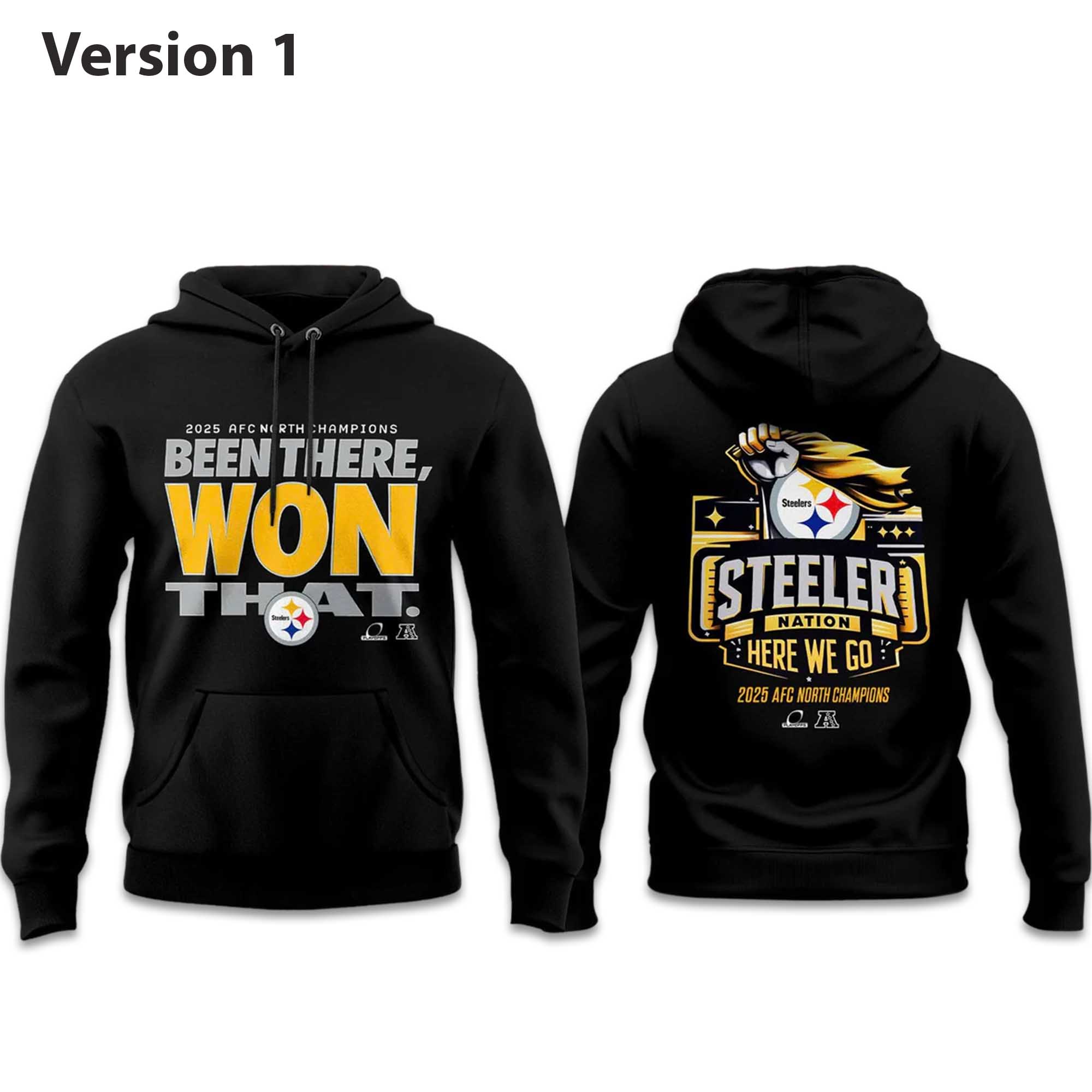 The Steelers 2025 AFC North Division Champions Here We Go Hoodie features a solid black background with striking gold and white accents. The front emphasizes the phrase “Been There, Won That” along with championship details, while the back showcases the powerful Steelers Nation design with a raised fist and the message “Here We Go.” The layout is strong, balanced, and easily recognizable to other fans.