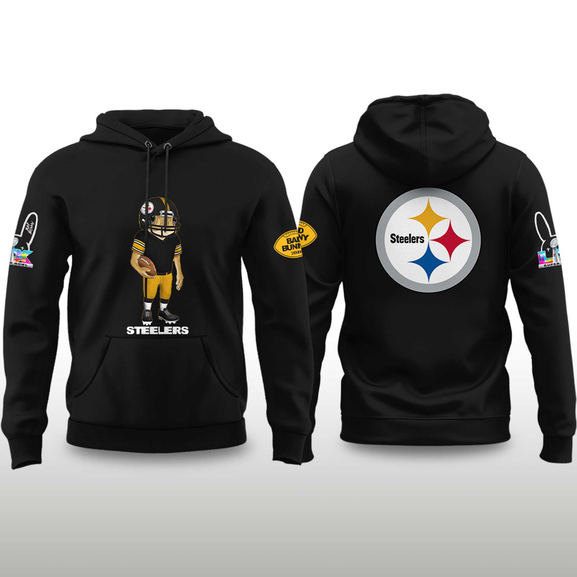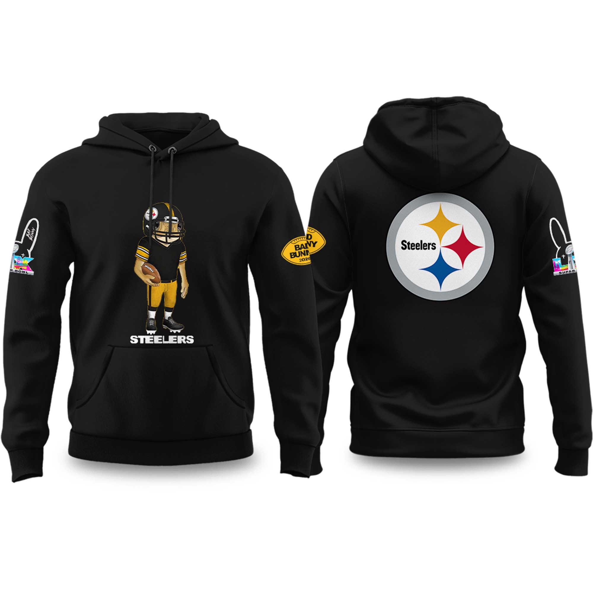This Steelers Bad Bunny 2026 Super Bowl Concho Football Hoodie balances striking visuals with practical comfort. A spacious hood with an adjustable drawstring, ribbed cuffs, and classic kangaroo pocket keep you warm throughout the winter. The soft material and sturdy stitching support repeated wear. The contrast between the playful art print on the front and the bold, clear logo on the back creates a look that is both fresh and deeply rooted in Steelers tradition.