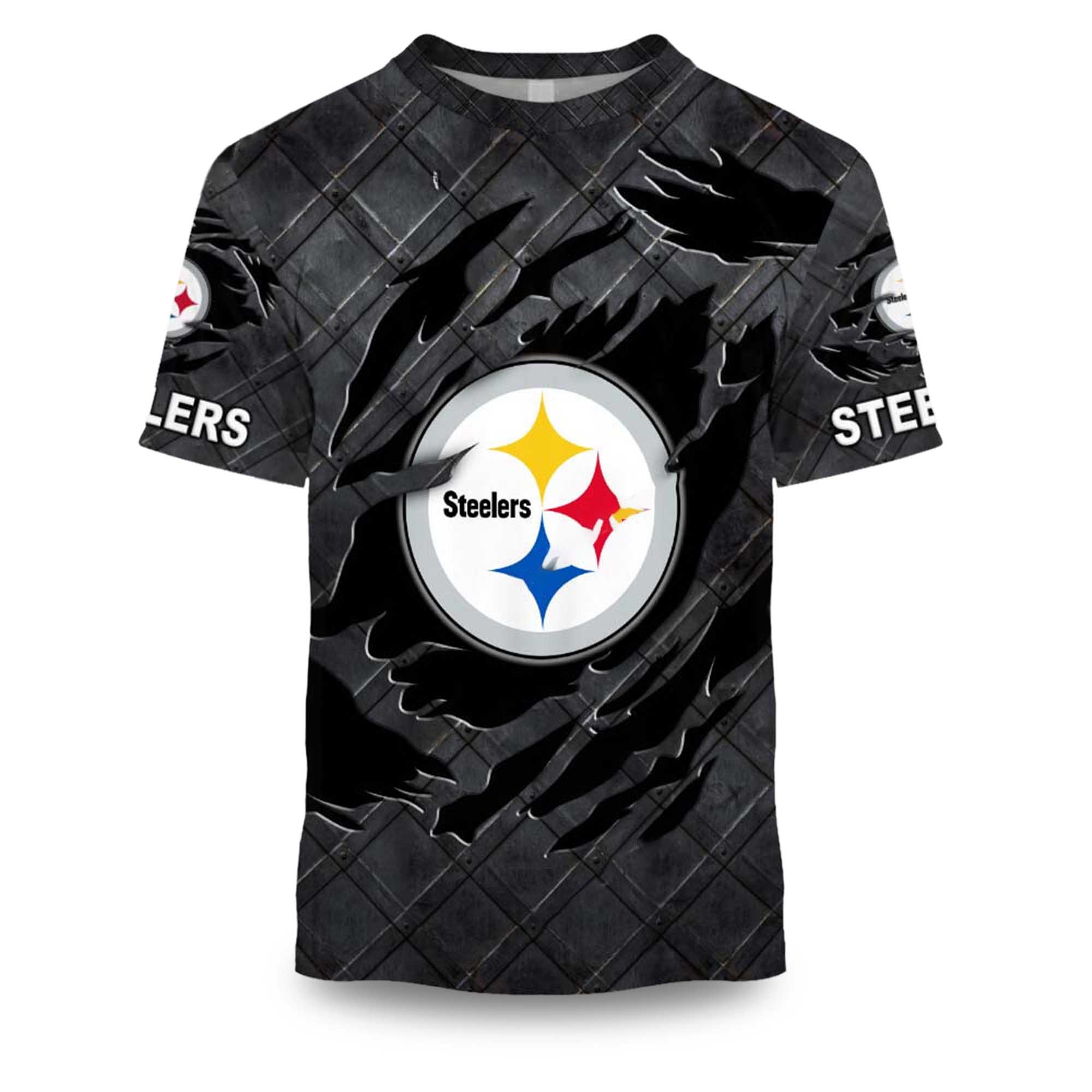 The Steelers Black Metal Texture Shirt reflects the fan fashion trend toward darker and more expressive designs. The cracked black metal background creates a strong contrast with the Pittsburgh Steelers’ central logo, giving the shirt a powerful visual identity. This style offers a modern, edgy feel and is perfectly suited for fans who want something different from traditional sportswear.
