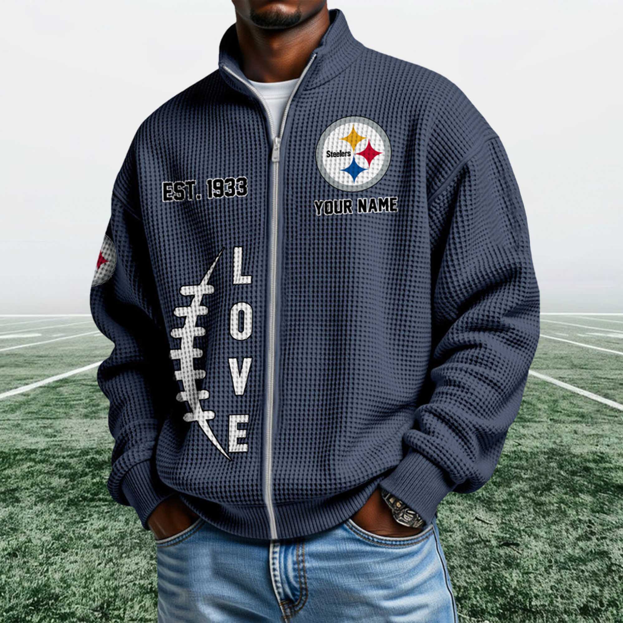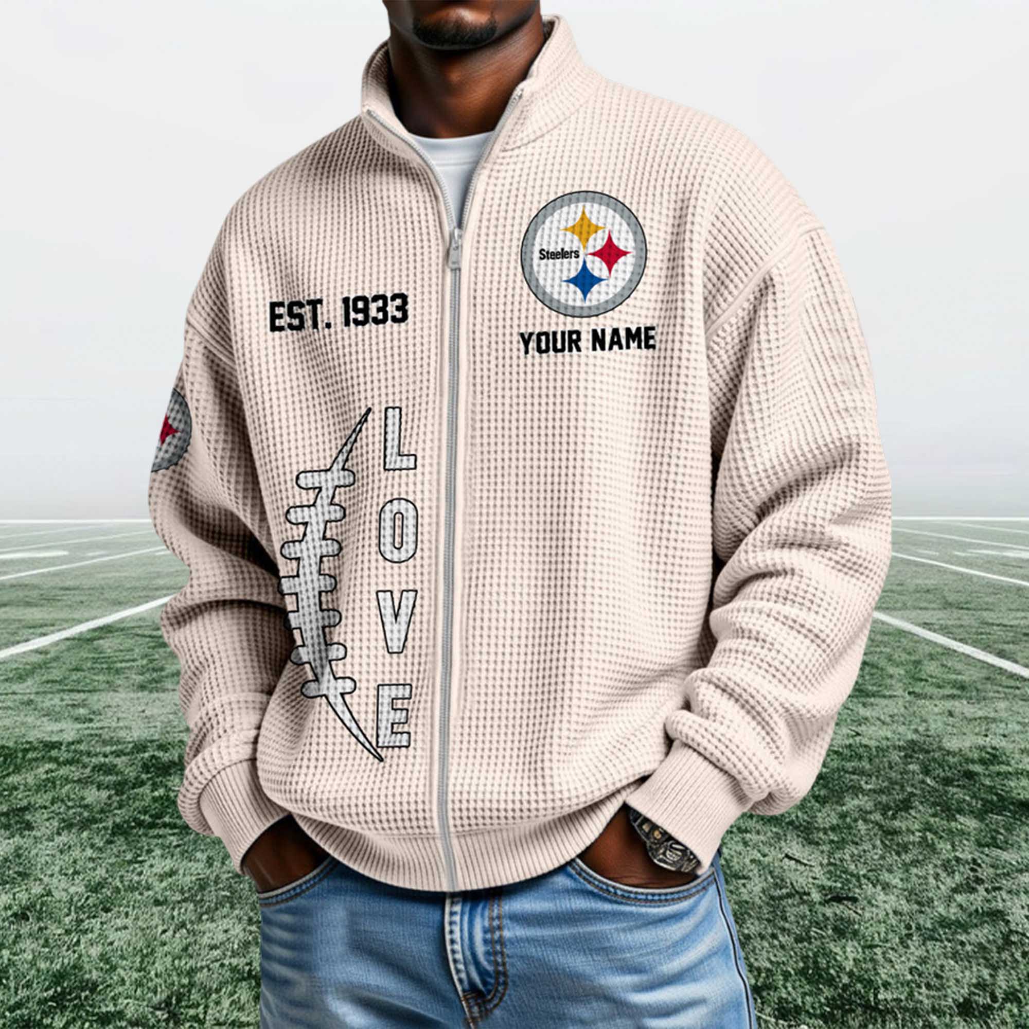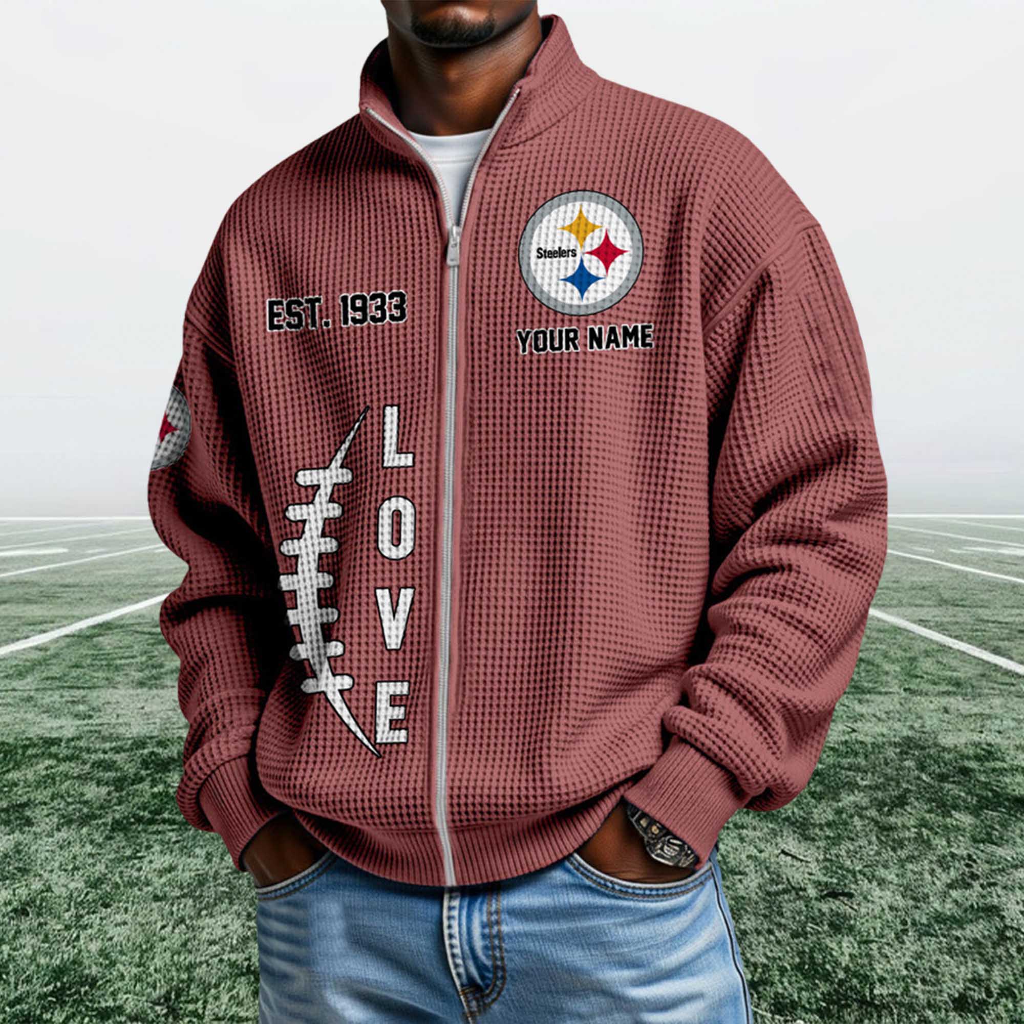 This Steelers EST 1933 Quarter Zip Waffle Sweatshirt long-standing heritage. The EST. 1933 detail highlights the team’s origins, while the front logo showcases team pride. The streamlined construction and neutral color palette allow it to easily coordinate with jeans, joggers, or layered outfits throughout the season.
