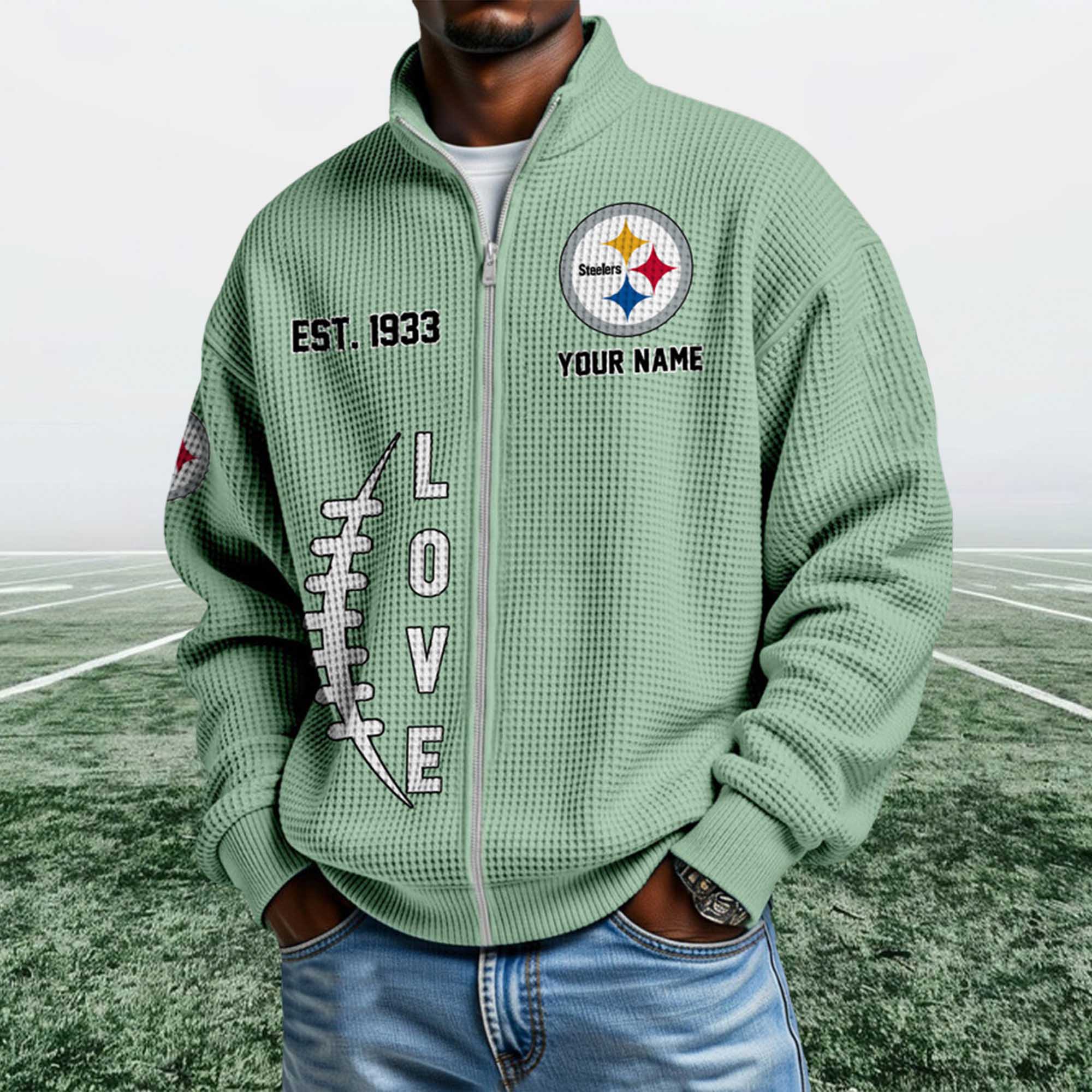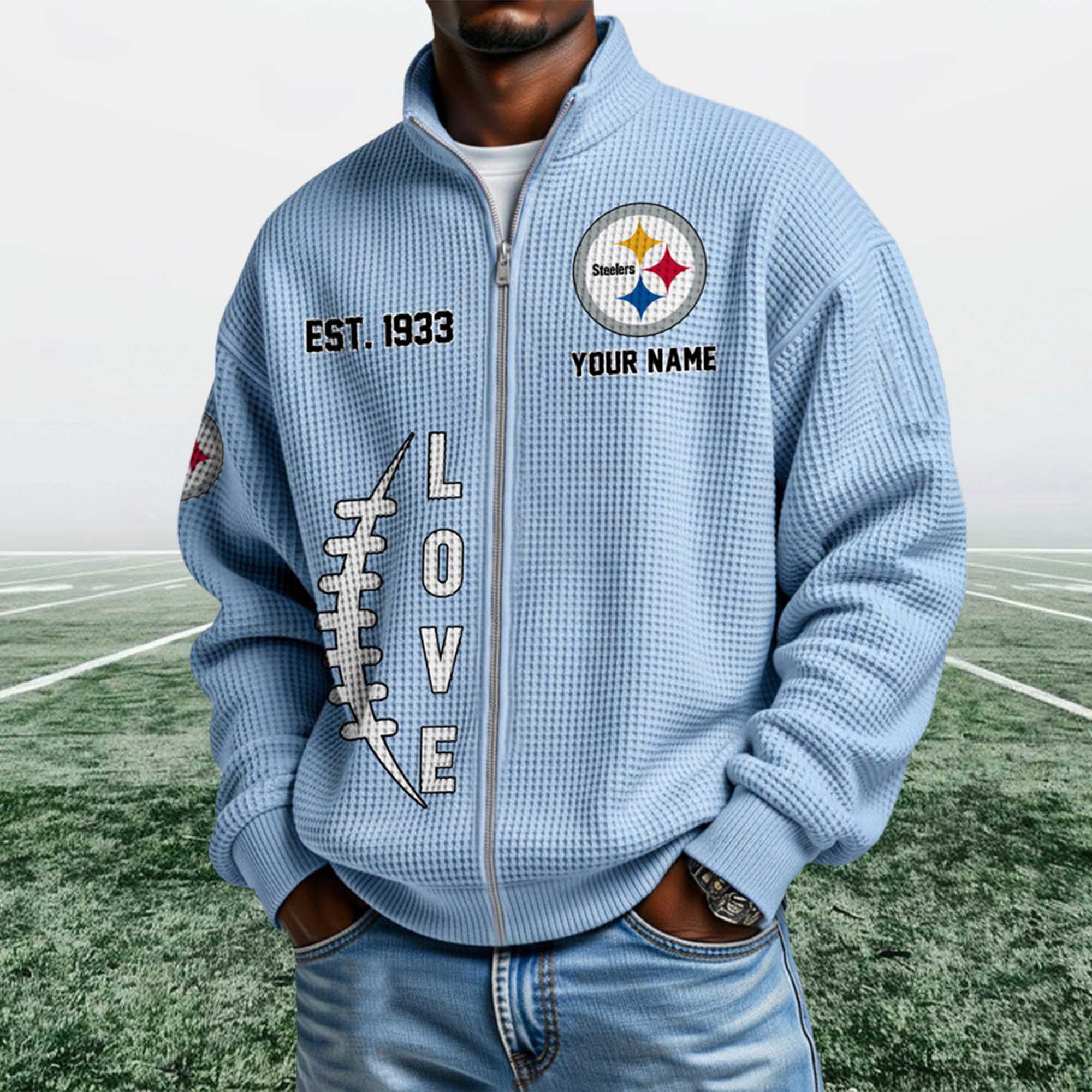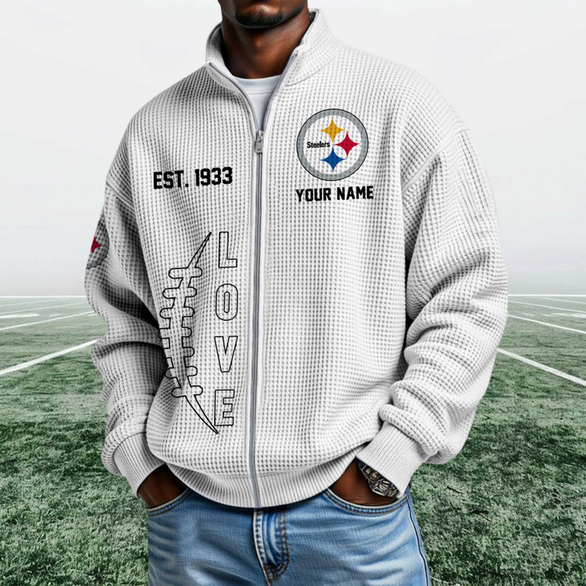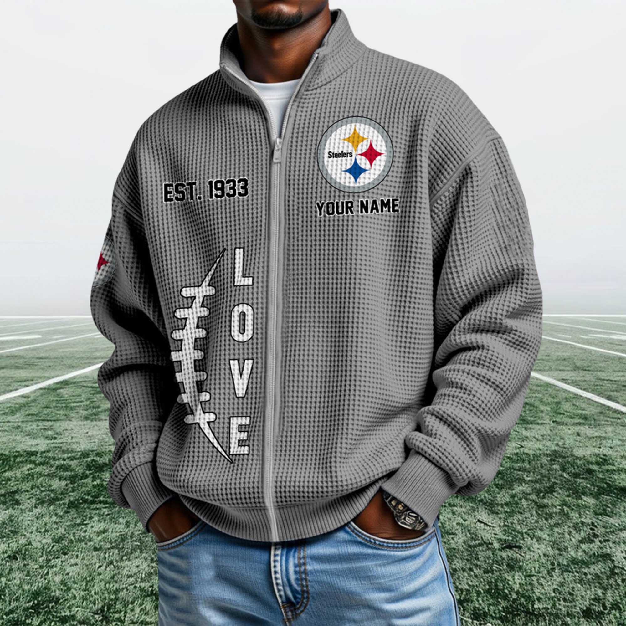 This Steelers EST 1933 Quarter Zip Waffle Sweatshirt long-standing heritage. The EST. 1933 detail highlights the team’s origins, while the front logo showcases team pride. The streamlined construction and neutral color palette allow it to easily coordinate with jeans, joggers, or layered outfits throughout the season.