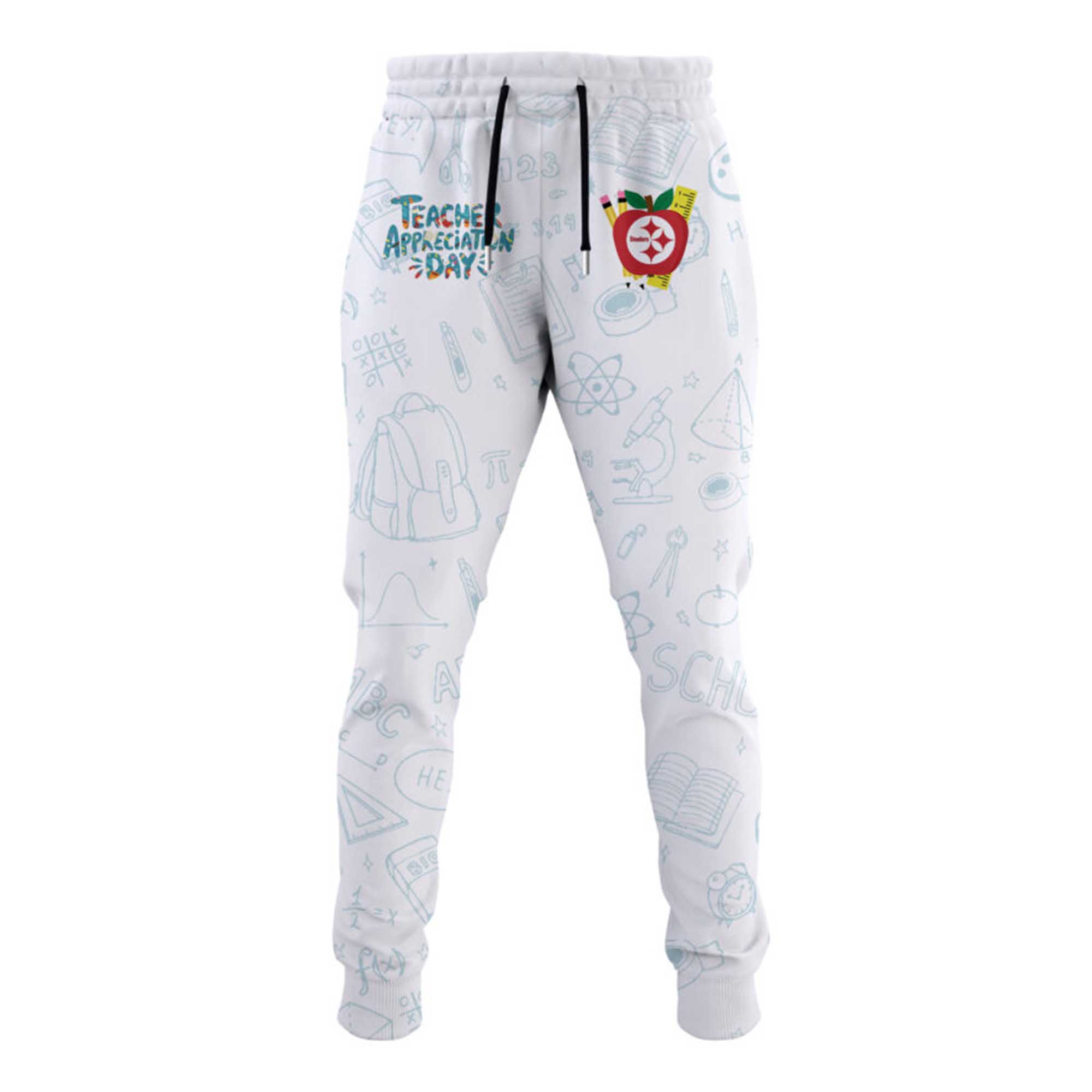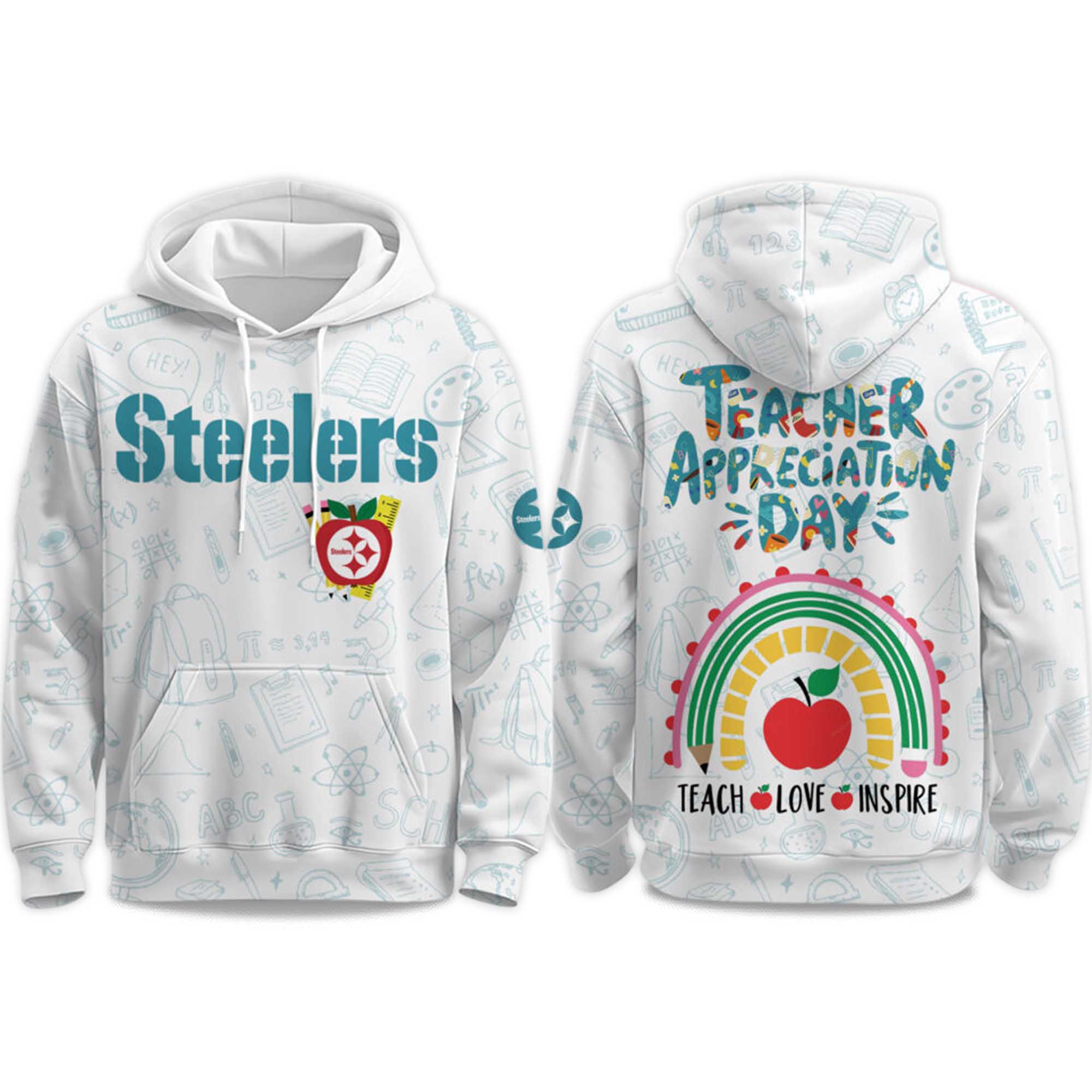 This vibrant hoodie features a vibrant Steelers logo paired with fun school-themed drawings on the fabric, creating a playful and energetic feel. The back of the hoodie features bold text reading “Teacher Appreciation Day”, above a colorful rainbow and apple motif symbols of learning, love, and growth. The phrase “Teach Love Inspire” completes the look, making this hoodie an easy-to-wear message of appreciation. Made from soft, breathable fabric, the hoodie is comfortable for long school days or relaxing weekends.