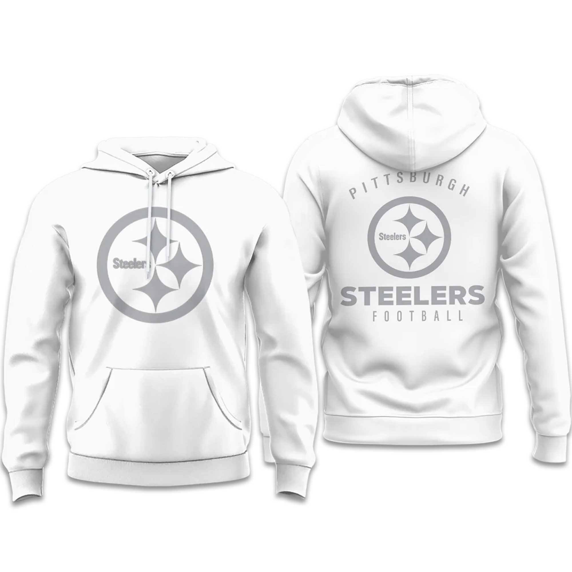 The hoodie stands out thanks to its pristine white color combined with a modern grey Steelers logo, creating a strong yet understated look. Balanced patterns on the front and back give the hoodie a smart and versatile look suitable for many occasions. The soft inner lining provides long-lasting comfort, while the sturdy cuffs and hem help maintain its shape over time. The adjustable hood and spacious front pockets add to its everyday practicality, making this hoodie both stylish and practical for everyday wear.