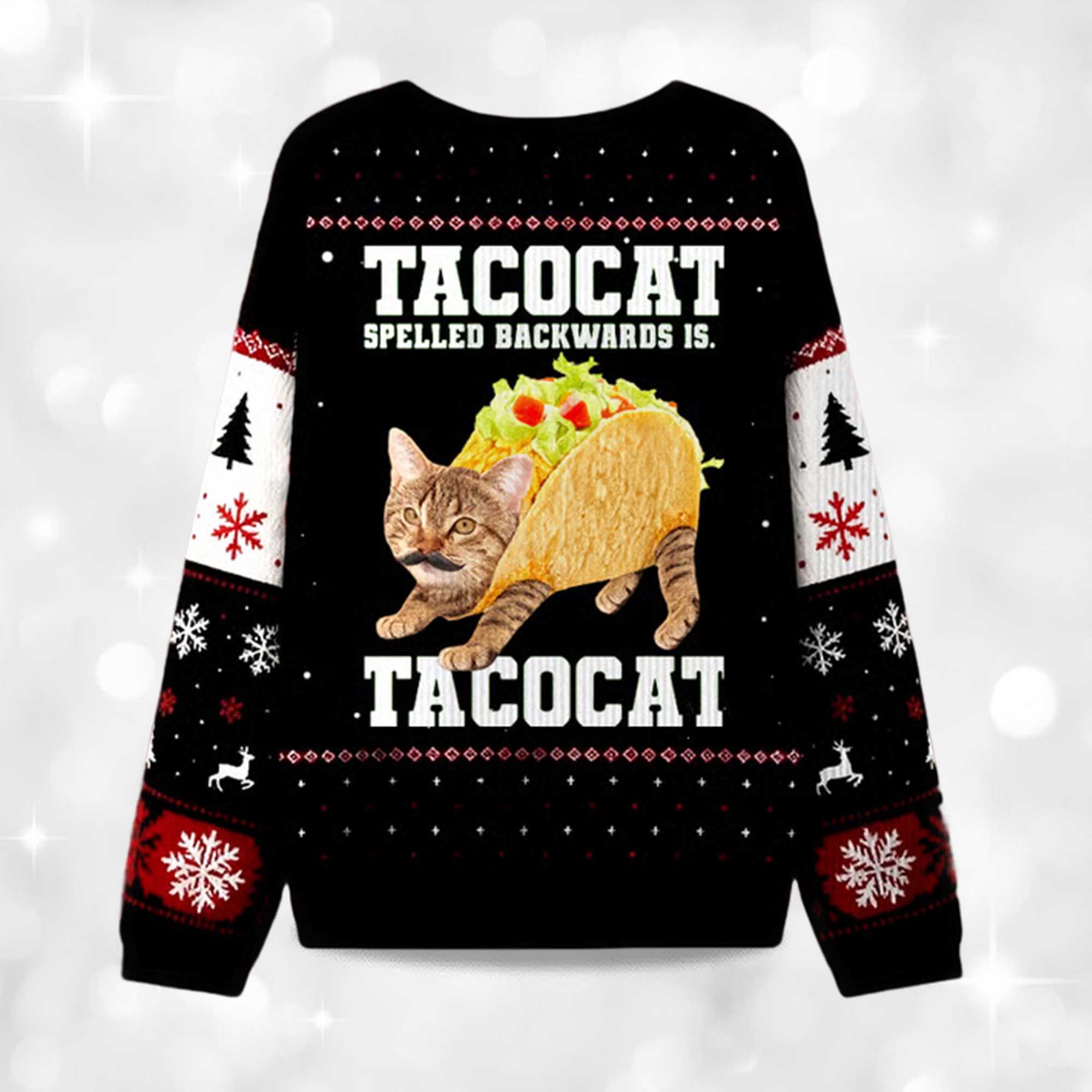 Ready for a Tacocat Spelled Backwards Is Tacocat Ugly Christmas Sweater that will have you laughing as soon as you walk in? This one’s for you. Featuring “TACOCAT spelled backwards is TACOCAT” in large white letters, a playful image of a taco cat hybrid yes, a taco cat against a black background, and covered in seasonal red and white patterns, this sweater combines meme culture with the holiday spirit. Perfect for ugly sweater nights, low-key parties, or just refreshing your winter wardrobe.