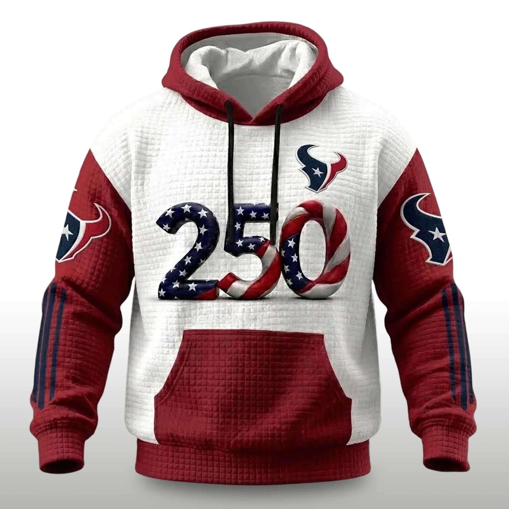 The design stands out thanks to its clever balance between celebration and sporting culture. The pristine white body contrasts with the bold red sleeves and hood, creating a powerful look for game day. The 250 imagery in the center uses an American flag style to highlight the national celebration theme. Texans logos are placed on the chest and sleeves for a complete fan look. The waffle texture adds a premium detail, while the hoodie construction provides warmth, softness, and comfort for everyday wear.