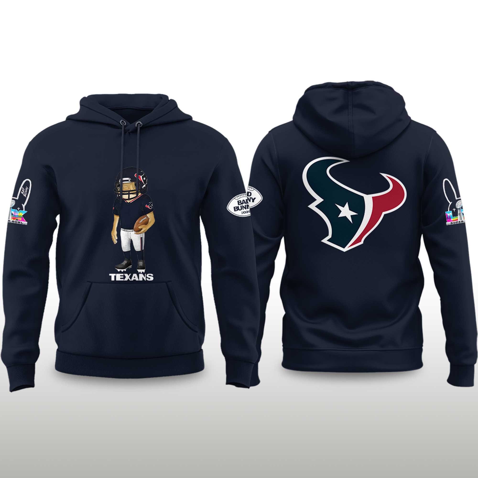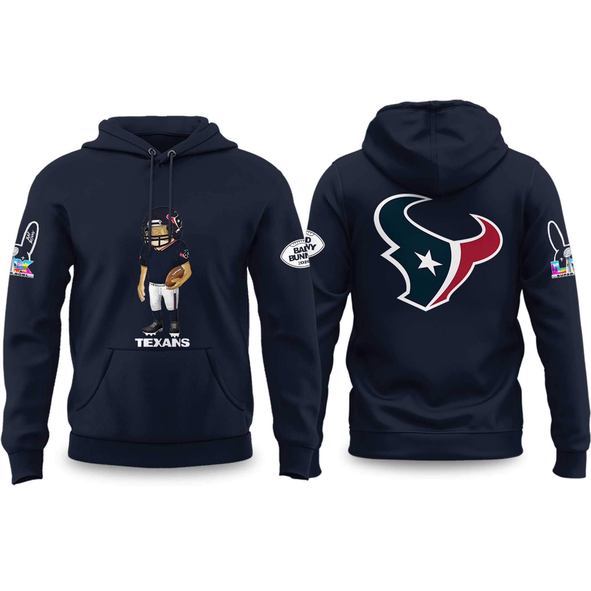 The Texans Bad Bunny 2026 Super Bowl Concho Football Hoodie features a confident cartoon soccer player on the front and the unmistakable Texans logo on the back. The deep navy blue color accentuates the design, showcasing the team’s classic identity, while the graphic print adds a modern, playful touch that instantly stands out.
