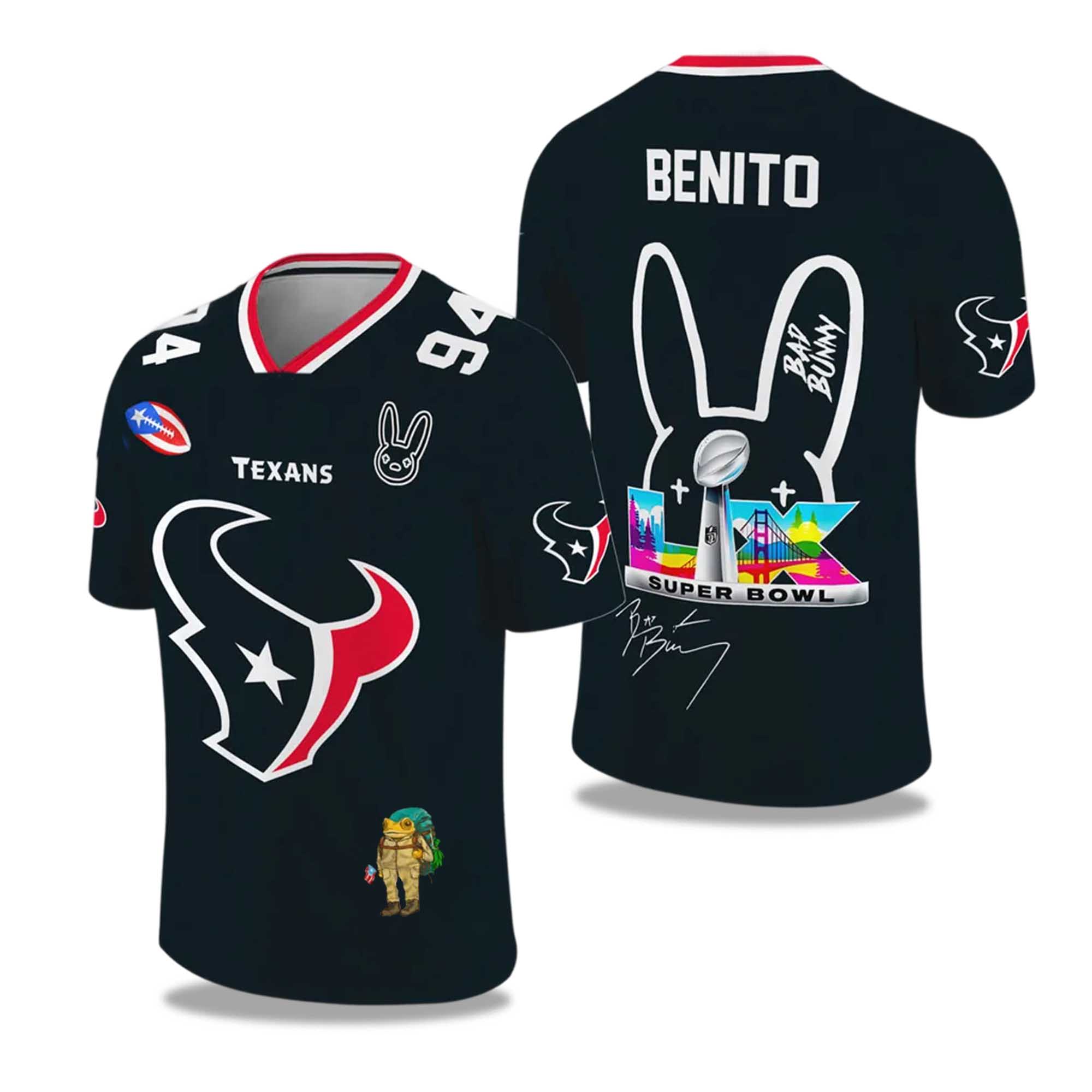 This Texans Bad Bunny Bowl LX 2025 2026 Football Jersey combines the power of Houston football with the energy of the global music scene. With a prominent team logo on the front and a vibrant Benito Super Bowl LX graphic on the back, the jersey exudes the excitement of the upcoming game like no other design. This is a collectible for fans who love both the field and the stage.