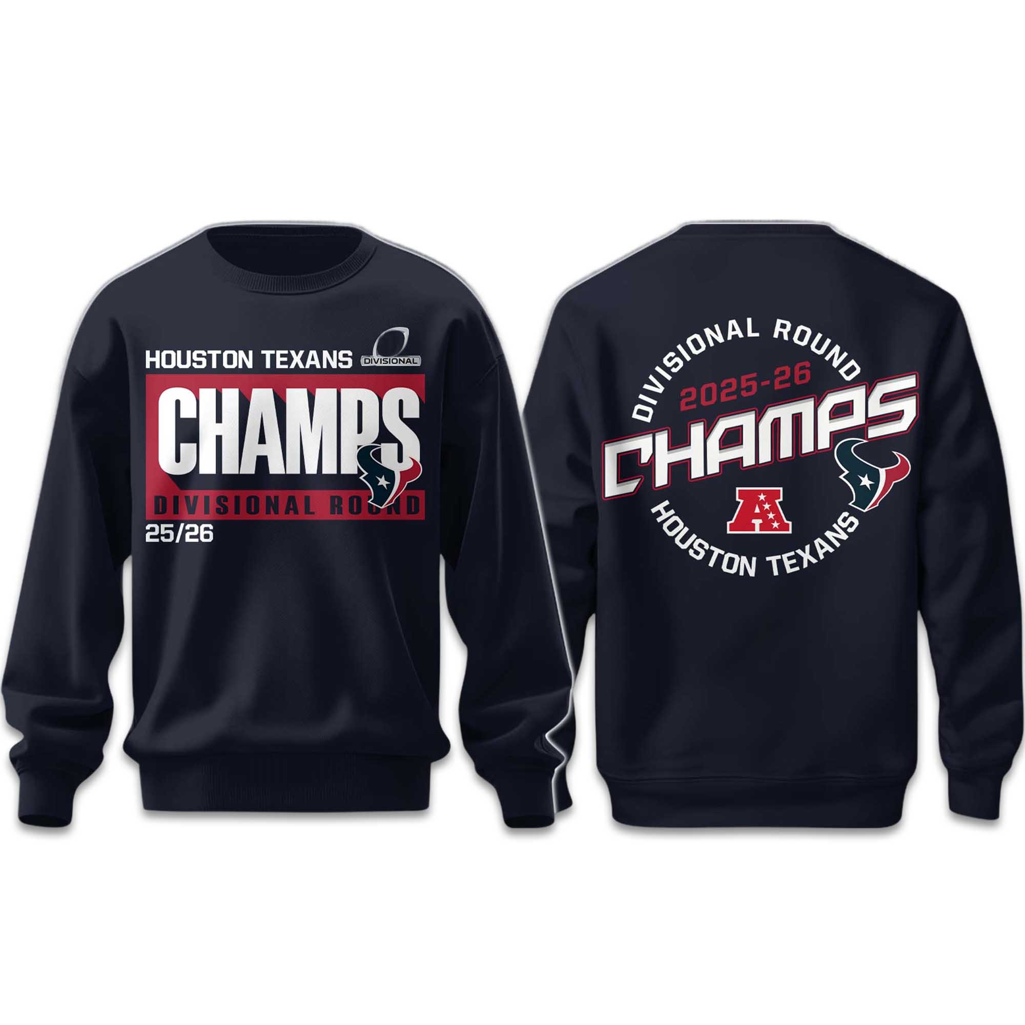 The Texans Divisional Round Champions 2025 2026 Sweatshirt is designed for comfort and a simple yet striking look. The soft, fleece-like fabric provides reliable warmth, ideal for chilly days. Loose fit. The loose fit makes it easy to style, while the prominent “Championship” lettering on the front and detailed imagery on the back neatly and balanced highlight the importance of this playoff achievement.