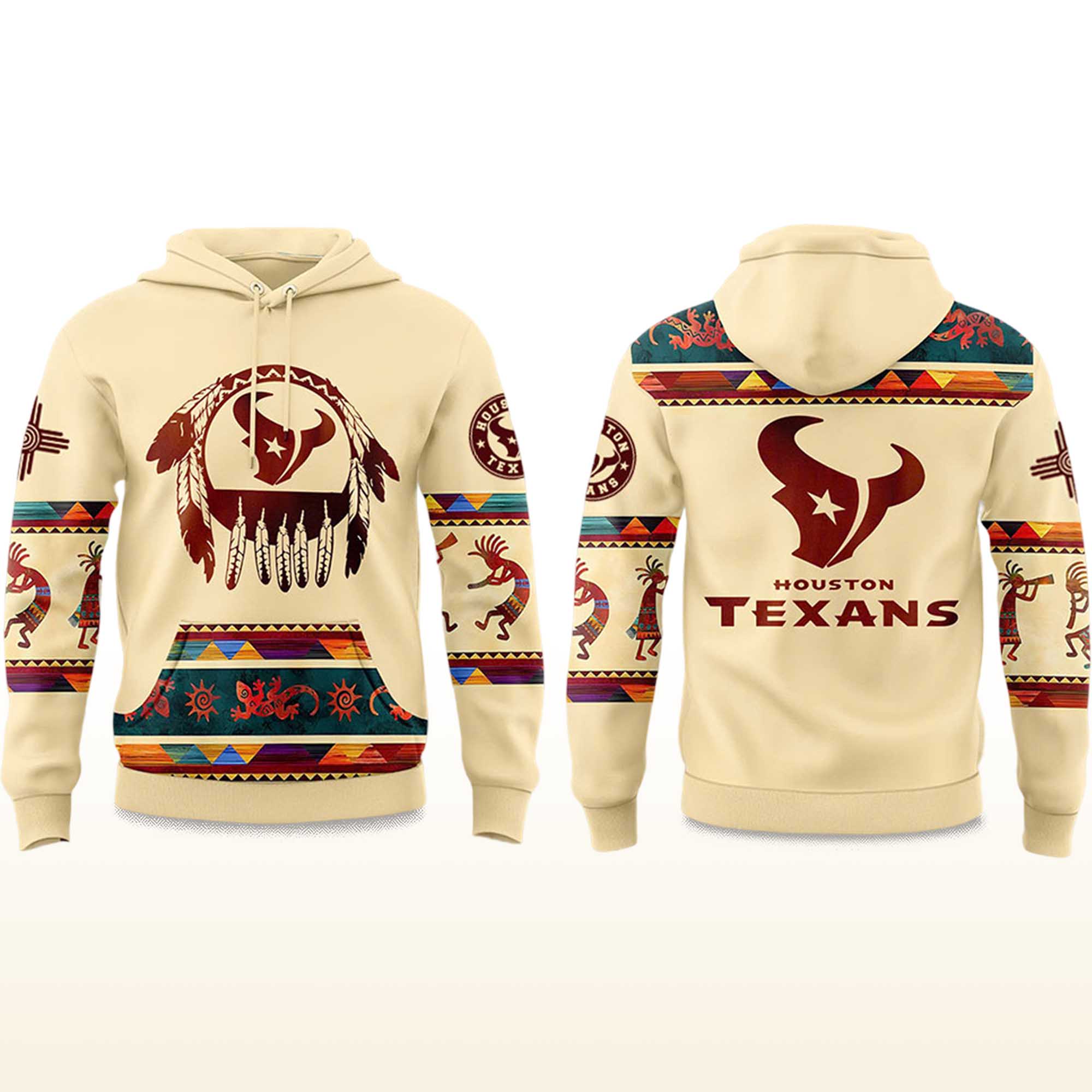 The design features a bold red Texans logo displayed on both the front and back, surrounded by bright tribal accents. The combination of warm beige and vibrant colors creates strong contrast and visual depth. The soft lining, adjustable hood, and durable cuffs keep the hoodie comfortable in cooler weather. The graphics and color scheme make it both eye-catching and easy to style.
