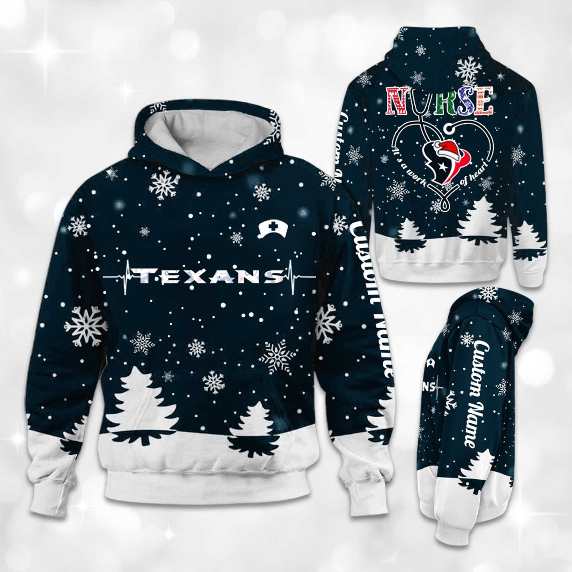 The Texans x Nurse Christmas Football Hoodie features a deep navy blue background adorned with falling snowflakes, winter trees, and subtle soccer details. The front is highlighted with bold “TEXANS” lettering, creating a powerful look for game day. The back features “NURSE” along with a heart and a healthcare symbol, creating a festive message celebrating care, dedication, and the holiday spirit.