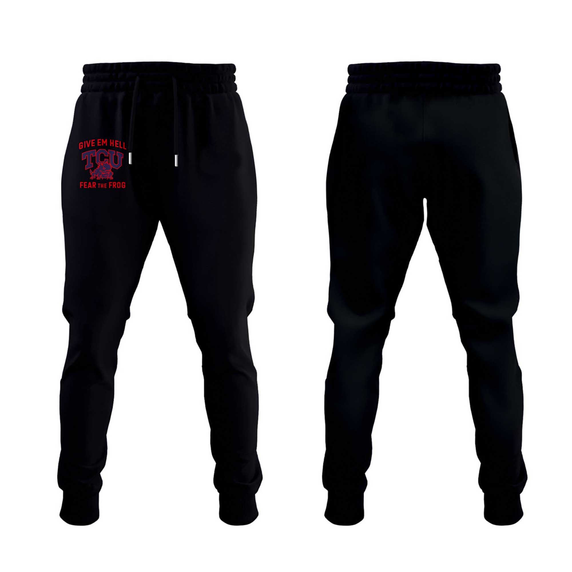 The shirt features bold TCU lettering and a prominent Horned Frog graphic on the chest, while the “Give Em Hell – Fear the Frog” text stands out confidently on the back. The graphic sleeves provide a sporty, modern look that’s perfect whether you’re heading to the stadium, walking around campus, or hanging out with friends.