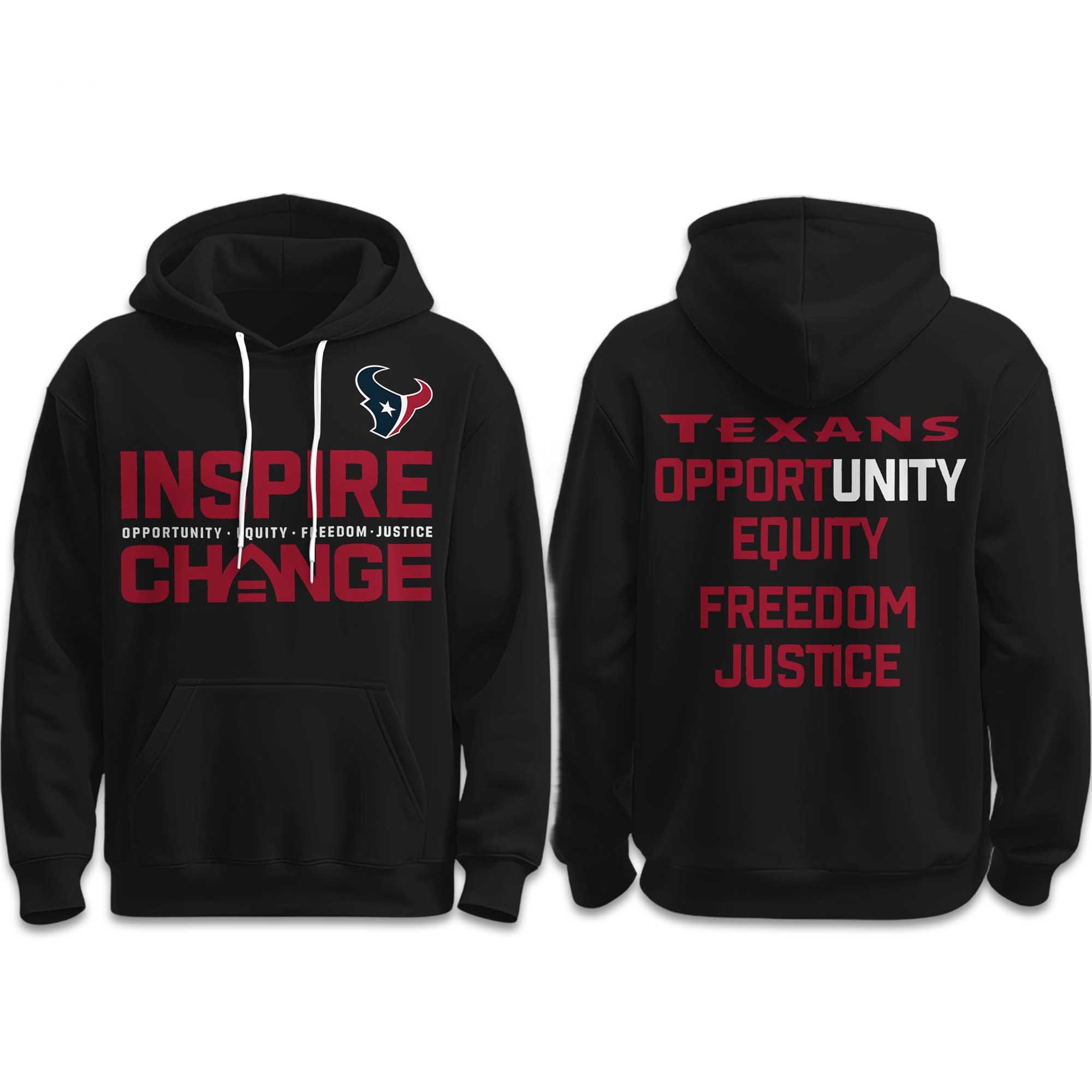 The Texas Inspire Change Hoodie 2025 delivers a powerful visual statement through its black background combined with bold red typography. The Inspire Change message on the front keeps the look connected to the league’s initiative, while the back highlights Opportunity, Fairness, Freedom, and Justice. It’s designed for fans who want their Texans attire to reflect their values and loyalty.