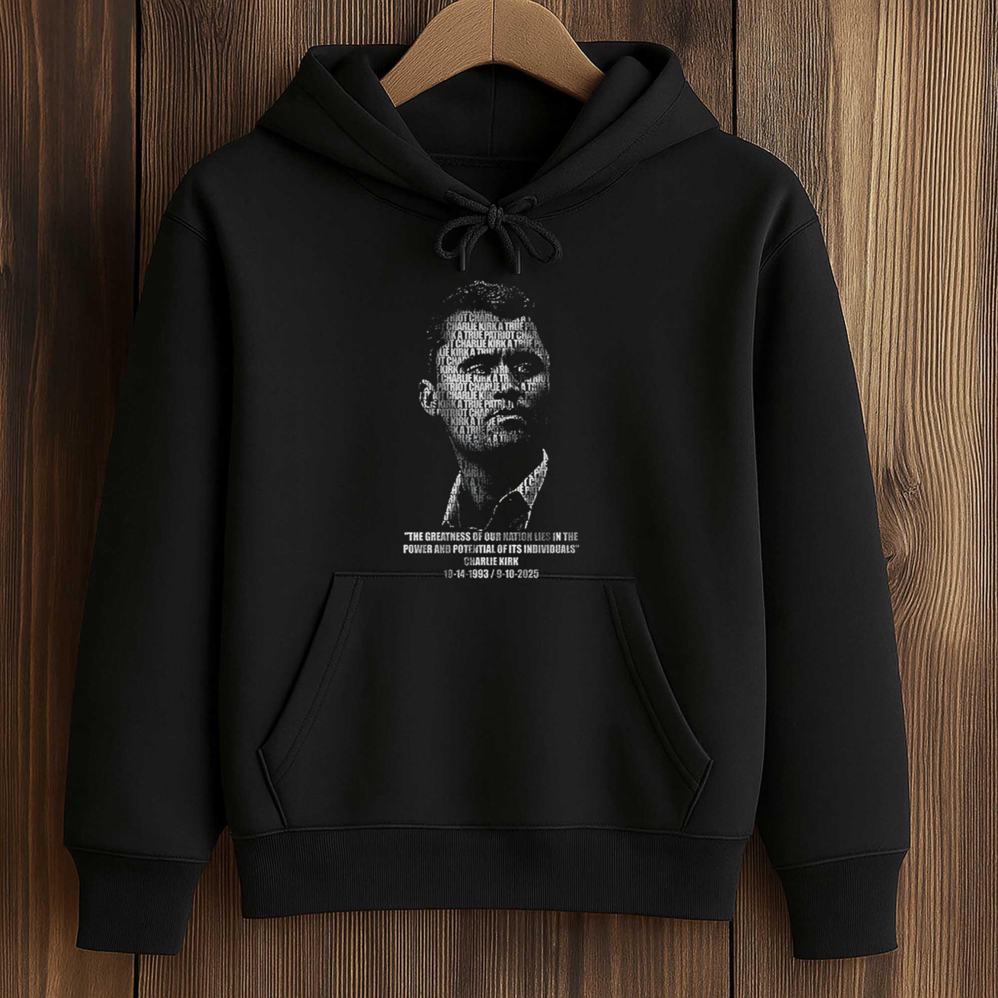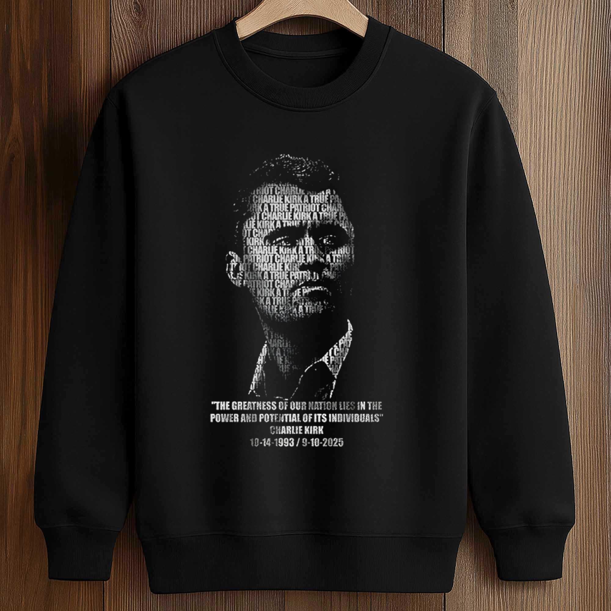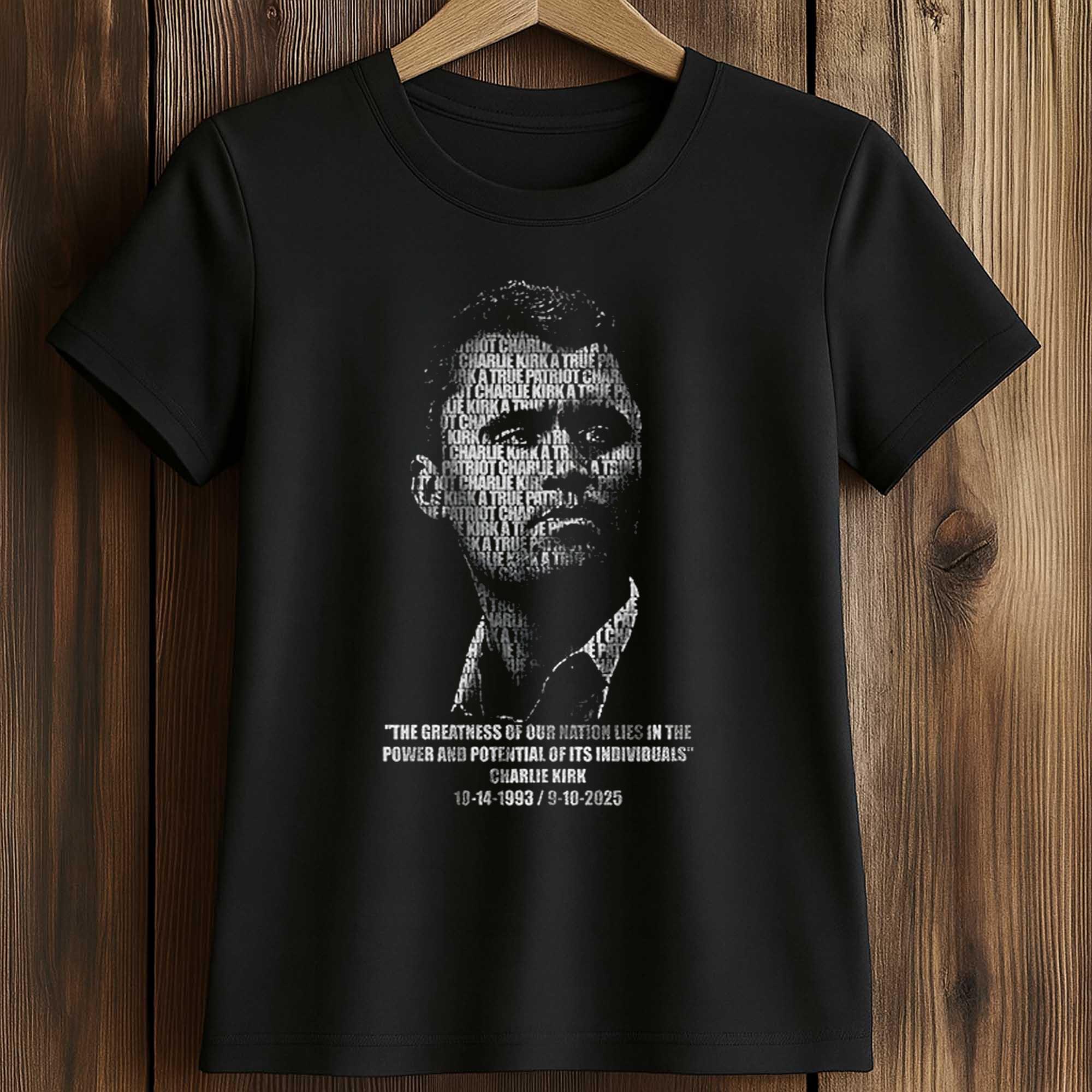 The design of this tee is both bold and artistic. The front of the shirt features a grey portrait made up of overlapping letters, creating a striking textured effect. Below is the inspirational quote “The greatness of our nation lies in the strength and potential of each individual” printed in bold, followed by Charlie Kirk’s name and date. The black base contrasts strongly with the white design, highlighting every detail. Made from soft, breathable cotton, this tee is comfortable, while ensuring the print stays sharp and durable over time.