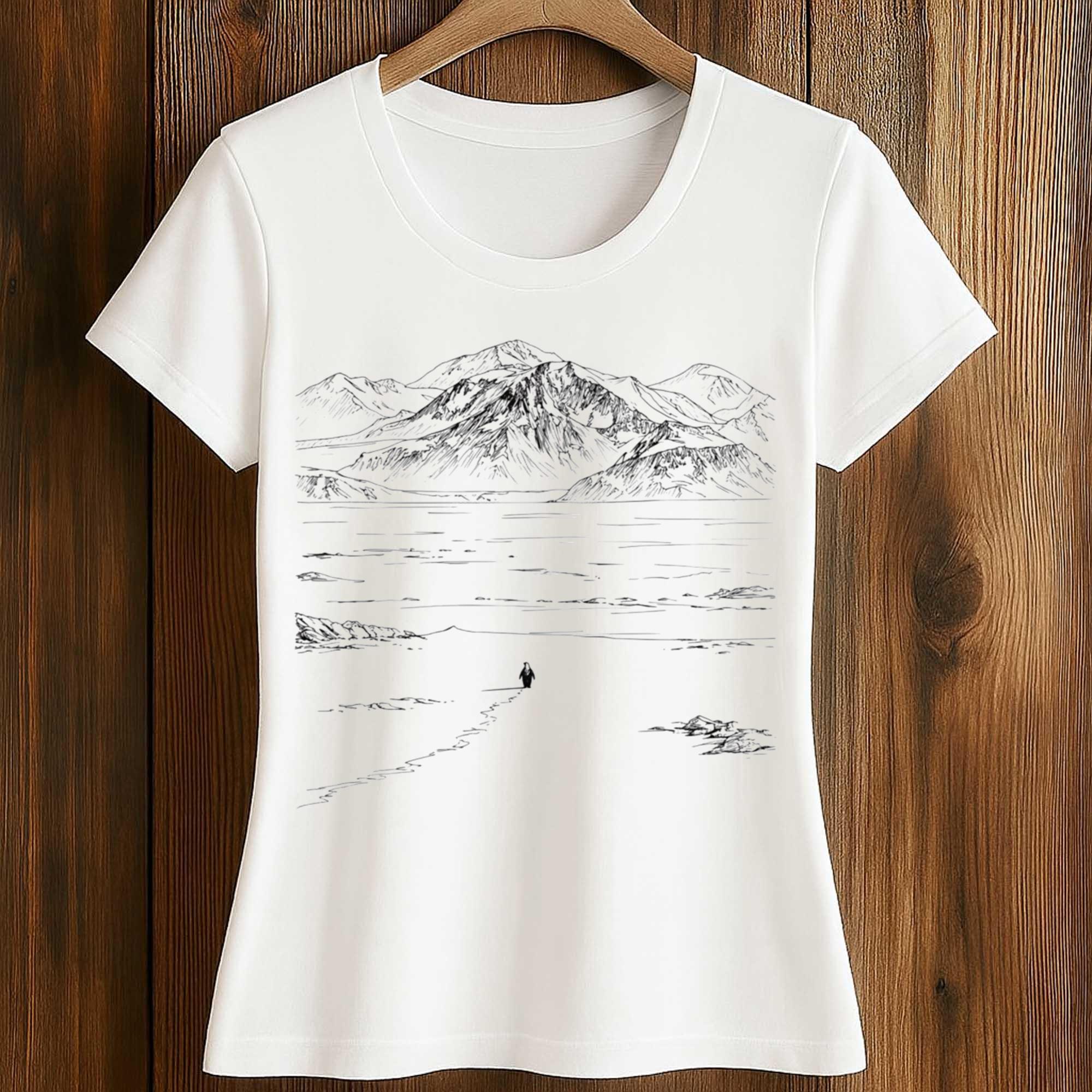 The The Nihilist Penguin Shirt features an image of a solitary penguin crossing a vast icy landscape beneath distant mountains. Expressed through delicate line art, the composition evokes a sense of quiet contemplation and deliberate minimalism. The pale white background highlights the contrast while maintaining a natural, gallery-like tone. It’s a work that conveys meaning through absence, allowing the wearer to express their own philosophy.