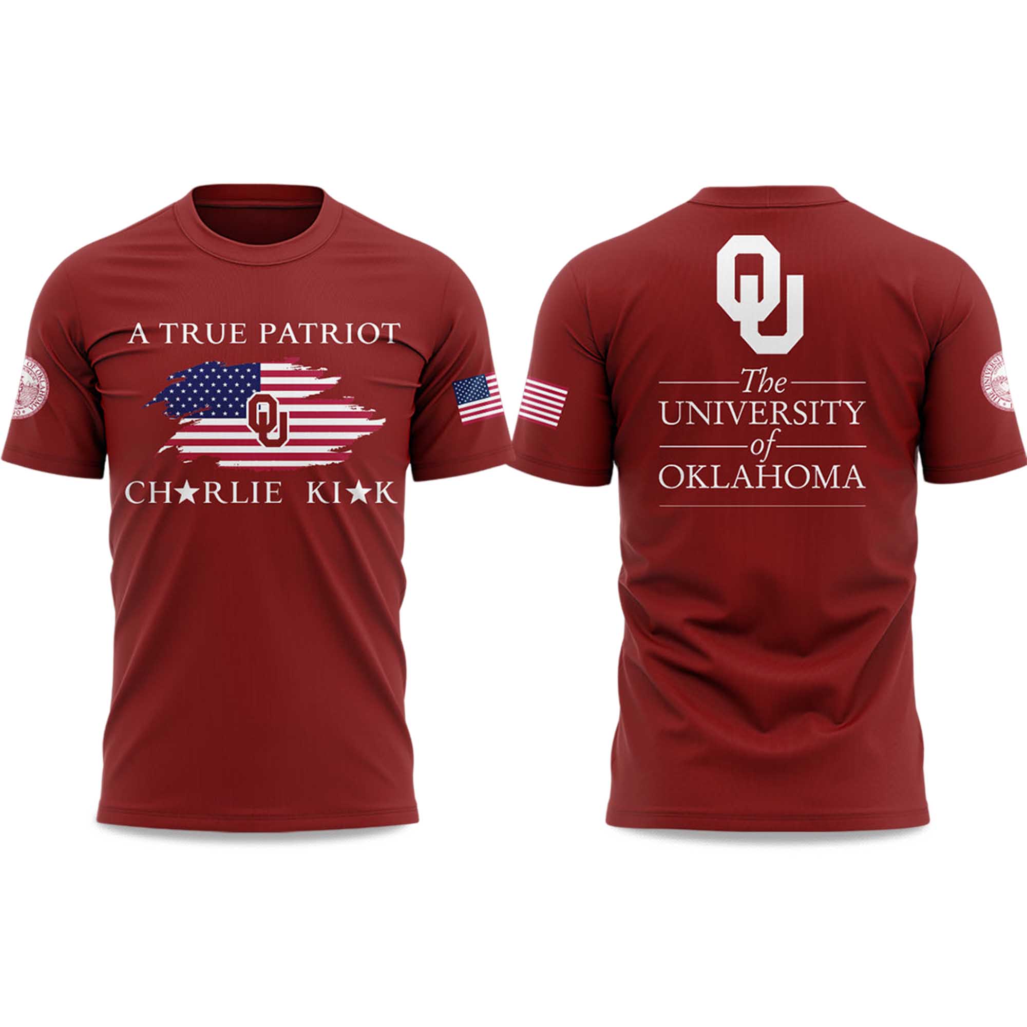 The University Of Oklahoma A True Patriot Charlie Kirk 2025 T-Shirt represents a powerful combination of patriotism and college pride. Designed for those who hold their values to the highest standard, this T-shirt celebrates both the American spirit and the legacy of. It is a statement for students, alumni, and anyone inspired by principled leadership and a passion for freedom.