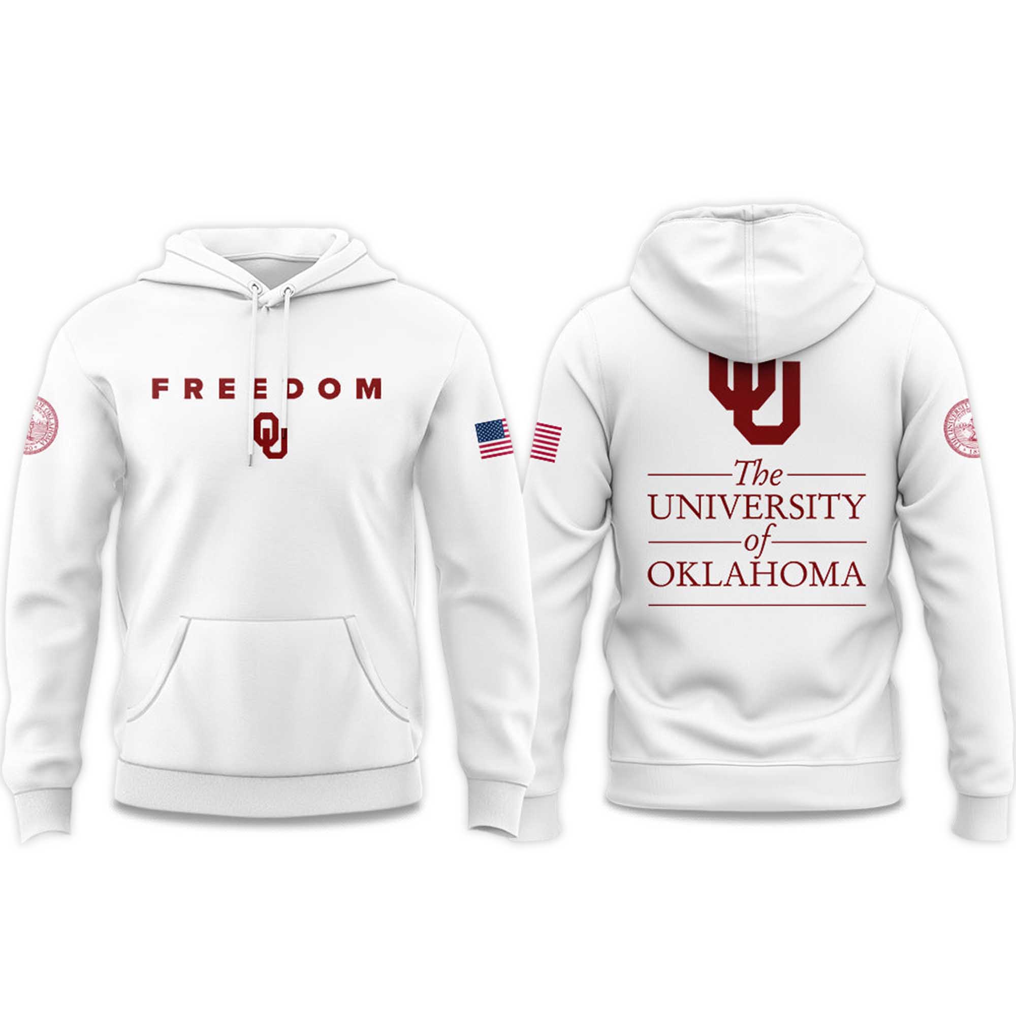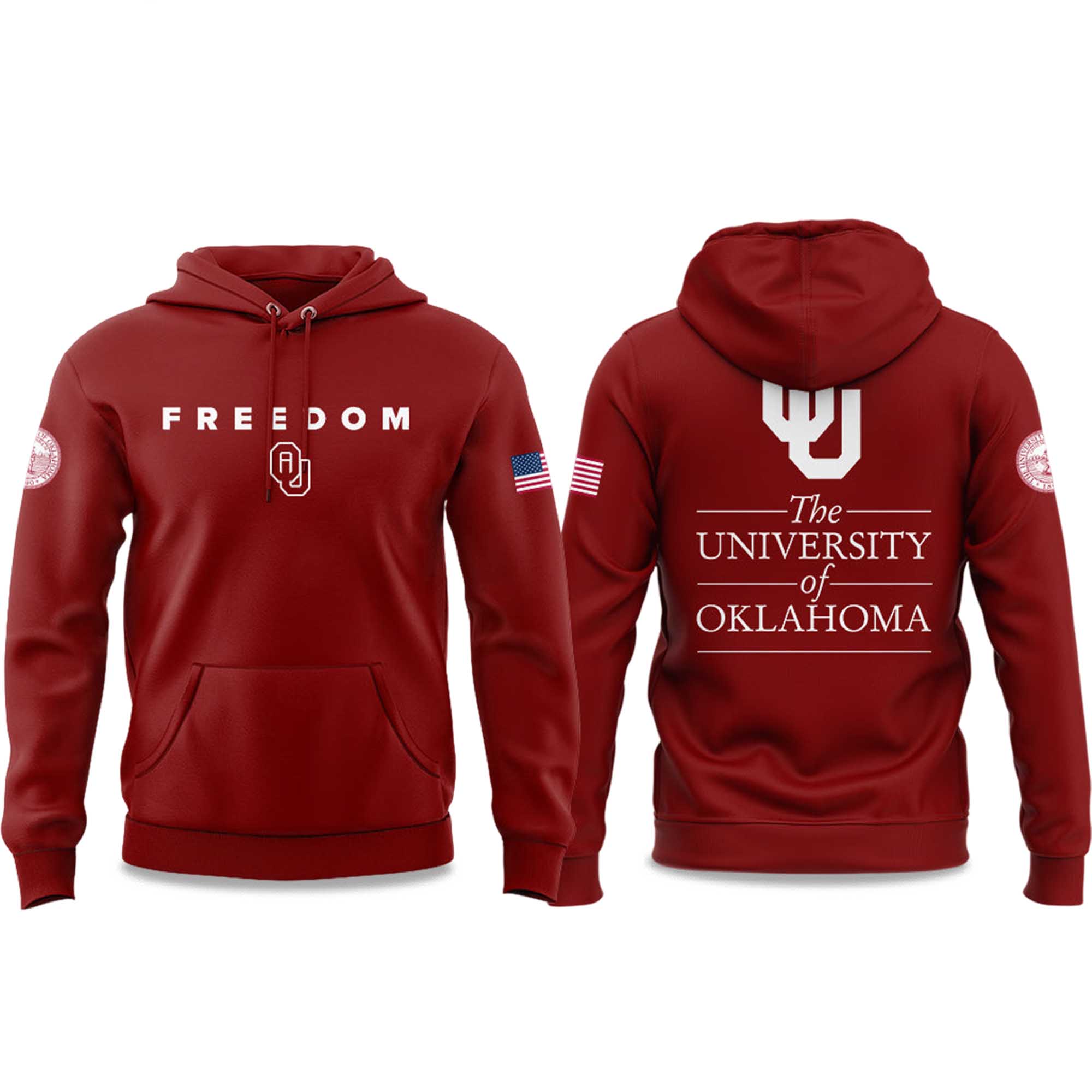 Simplicity is power in this clean, bold design. The “FREEDOM” stands out in the center of the crimson OU logo, symbolizing courage through tradition. The back of the jersey features “University of Oklahoma” in bold letters beneath the classic OU logo. The American flag patch on the sleeves celebrates patriotism, while the soft fleece interior and adjustable drawstring hood ensure all-day warmth and comfort.
